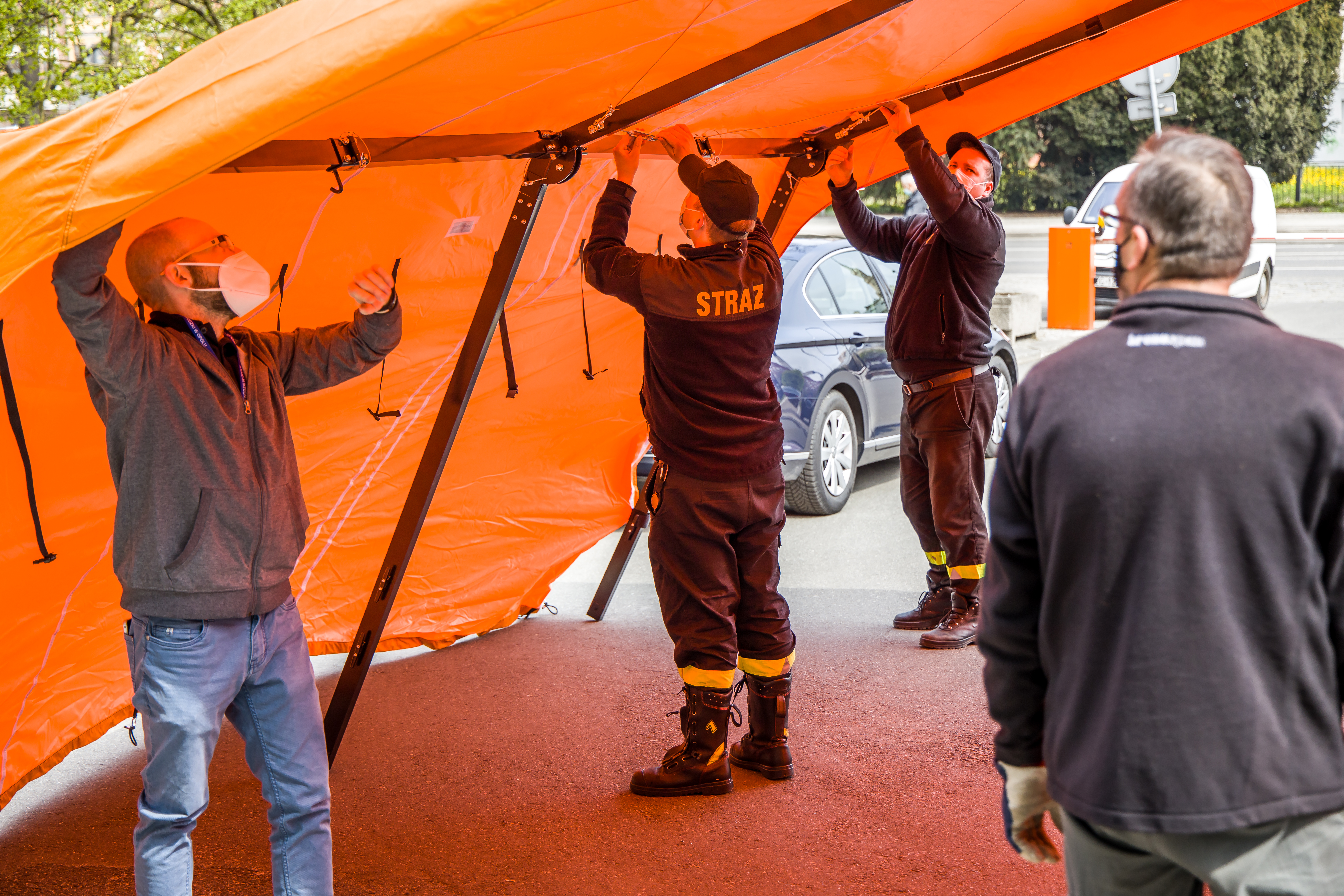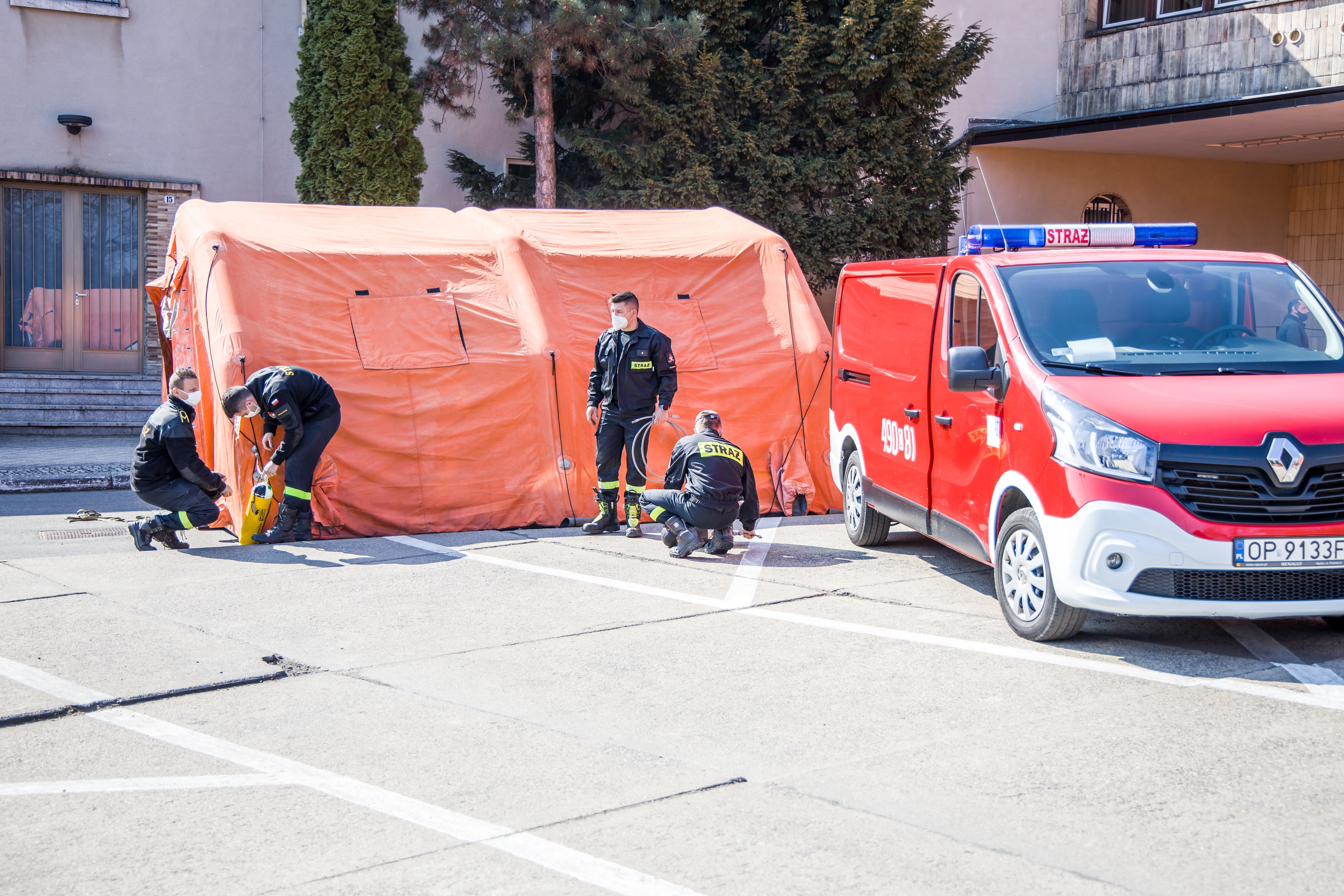 W dniach 29-30 kwietnia 2021 roku na prośbę Wojewody Opolskiego Sławomira Kłosowskiego, strażacy województwa opolskiego pomagali w budowie specjalnego punktu szczepień przed Opolskim Urzędem Wojewódzkim.