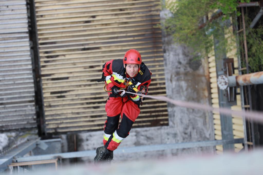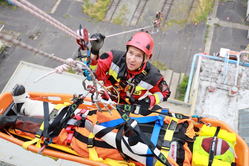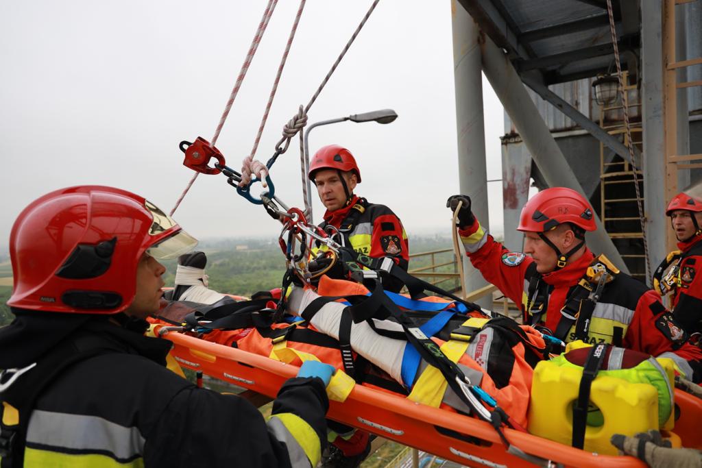 Założeniem ćwiczeń był upadek z wysokości osoby postronnej, która dostała się nielegalnie na teren obiektu. Mężczyzna wchodząc na komin, stracił równowagę i spadł kilka metrów w dół na małą galerie spocznikową. Poszkodowany doznał urazu nogi i ręki, był przytomny. Galeria znajdowała się na wysokości kilkudziesięciu metrów od gruntu, w miejscu trudnodostępnym.