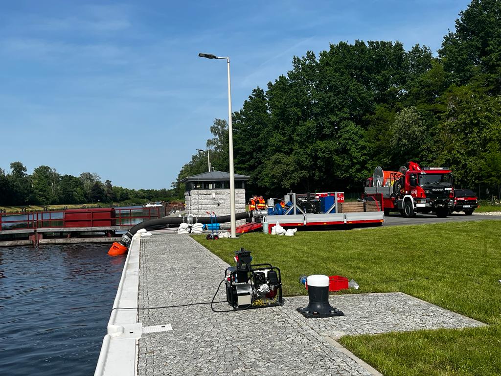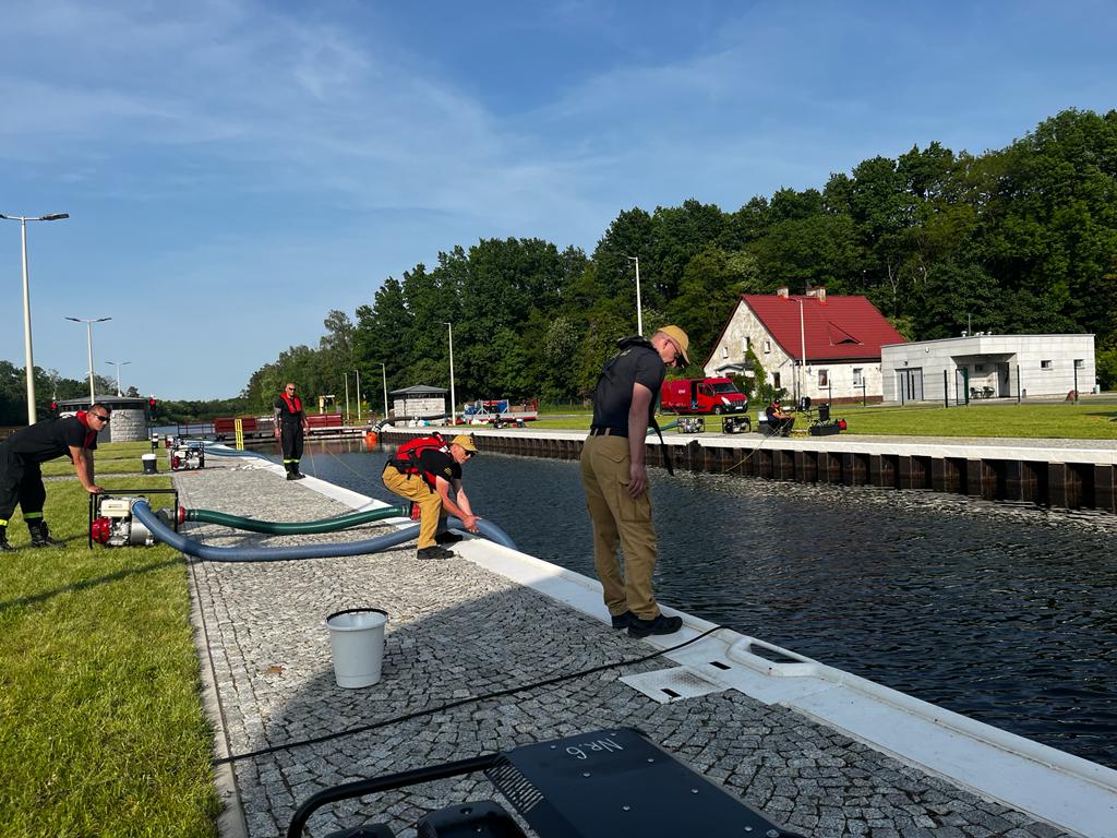 Zastępy z Komendy Powiatowej PSP w Kędzierzynie-Koźlu w tym Specjalistyczna Grupa Ratownictwa Wodno-Nurkowego „Kędzierzyn-Koźle” wraz z funkcjonariuszami Komendy Wojewódzkiej PSP w Opolu przygotowali i rozstawili sprzęt do przepompowania wody w śluzach.