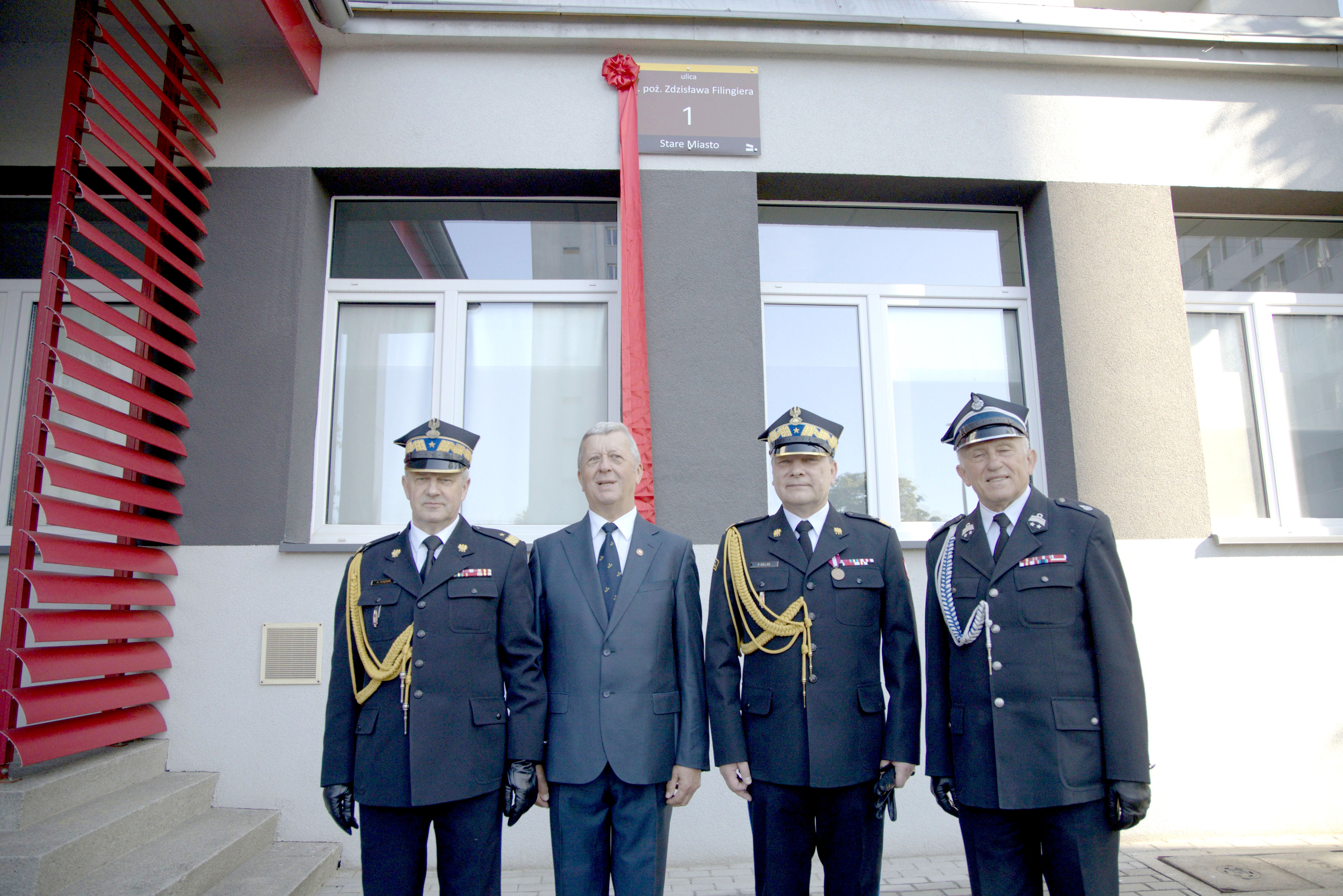 Punktem kulminacyjnym uroczystości był moment odsłonięcia tablicy adresowej z nazwą ulicy płk. poż. Zdzisława Filingiera, do którego zaproszono córkę pułkownika poż. Zdzisława Filingiera Panią Joannę Biesiadę, Opolskiego Komendanta Wojewódzkiego PSP nadbrygadiera Pawła Kielara, Prezesa Związku Emerytów i Rencistów Pożarnictwa Rzeczypospolitej Polskiej w Opolu Ryszarda Sajkowskiego.