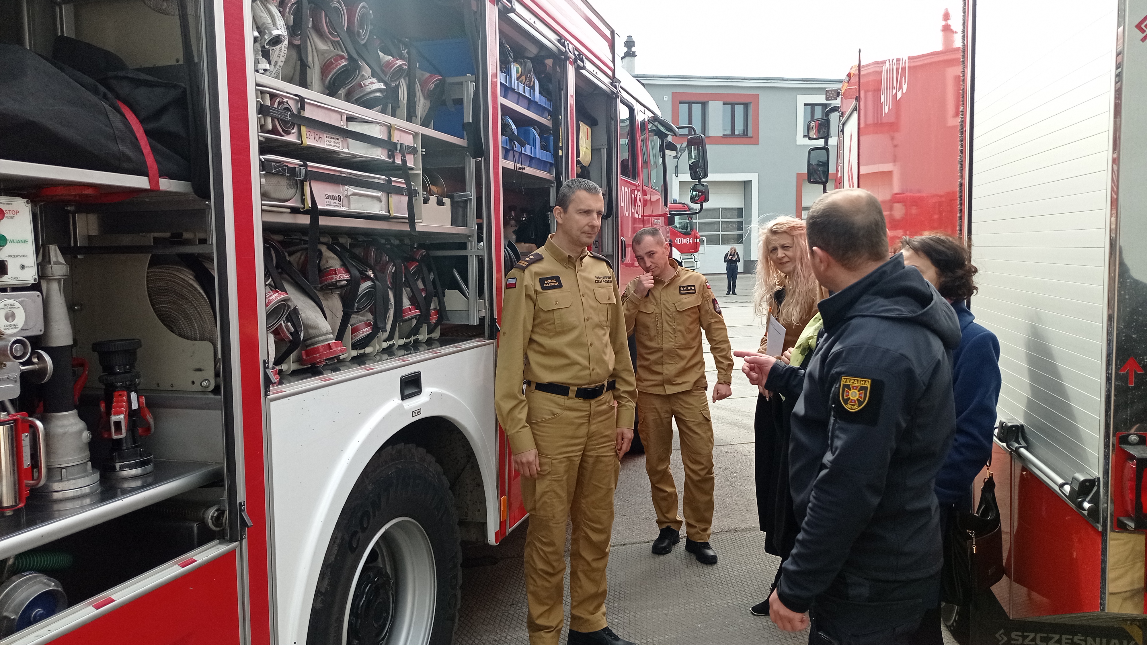 Komendant Powiatowy PSP w Brzegu bryg. Dariusz Kulawinek wraz z p.o. Zastępcy Komendanta Powiatowego PSP w Brzegu st. kpt. Bartłomiejem Tekielem przybliżyli ukraińskim strażakom charakterystykę powiatu, oprowadzili po Komendzie Powiatowej PSP w Brzegu oraz Jednostce Ratowniczo-Gaśniczej w Brzegu.