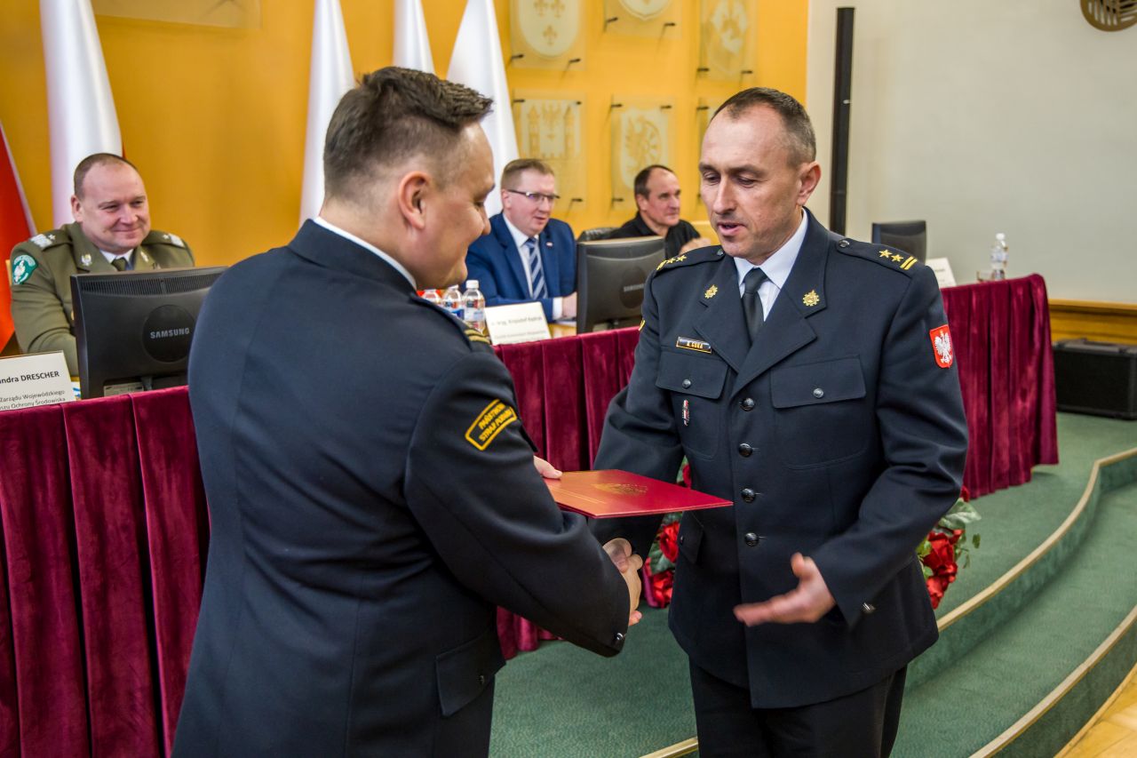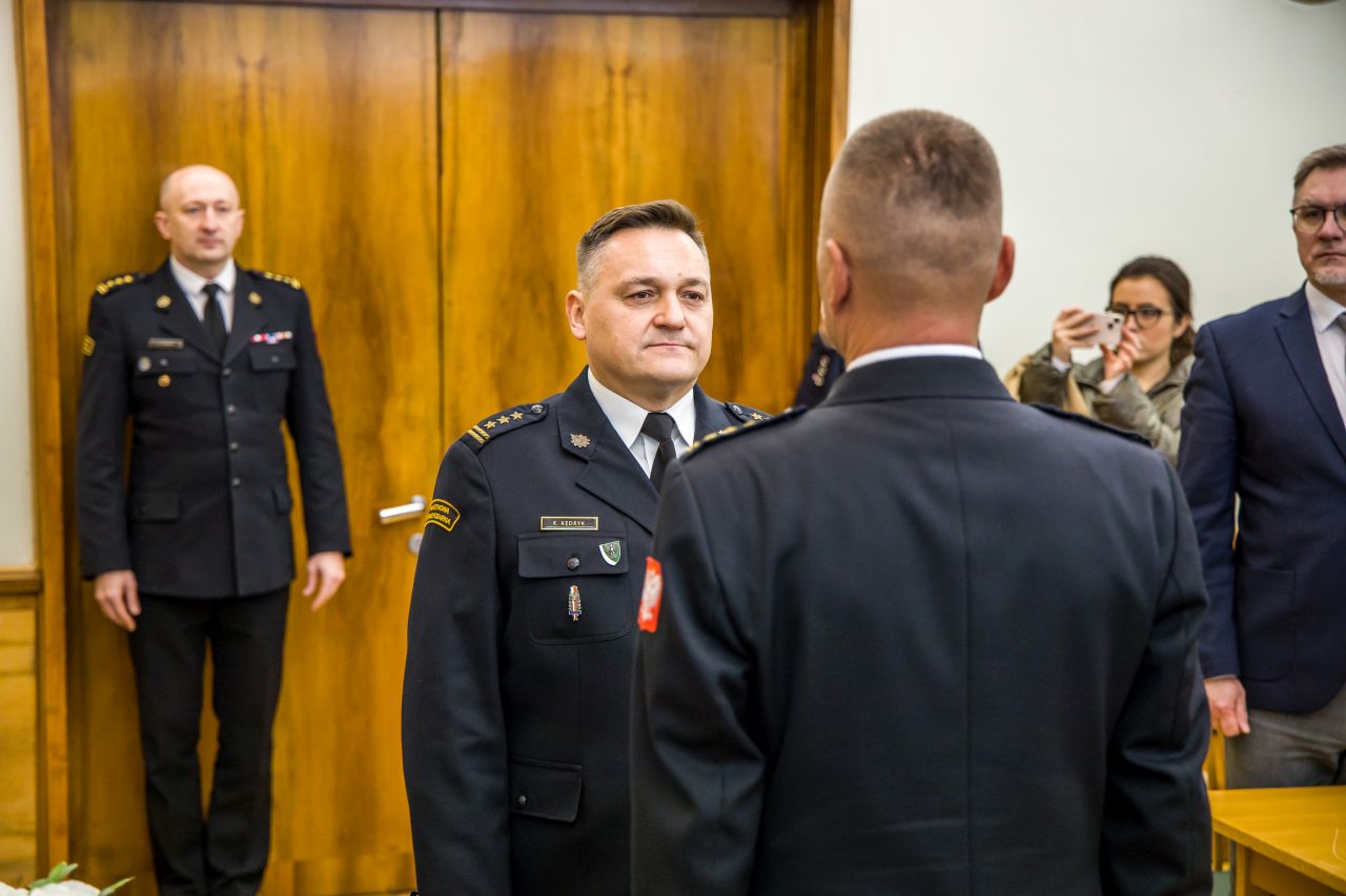 Opolski Komendant Wojewódzki PSP st. bryg. Krysztof Kędryk w trakcie narady wręczył bryg. Rafałowi Górze akt powołania na Zastępcę Komendanta Powiatowego PSP w Głubczycach.
