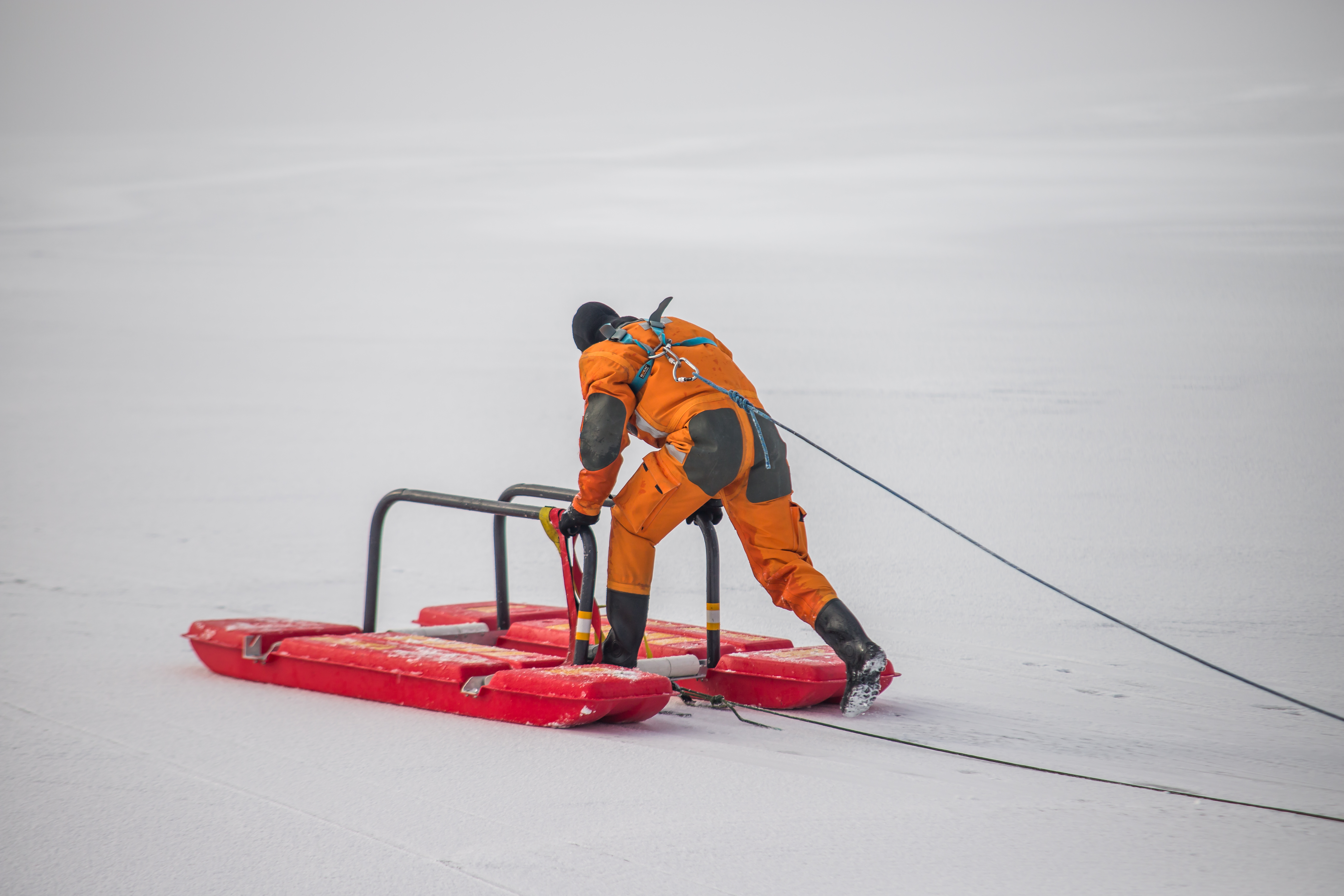 - Poruszając się w kierunku osoby, pod którą załamał się lód, rozłóż ciężar ciała na jak największej powierzchni – poruszaj się w pozycji leżącej (czołgając się).