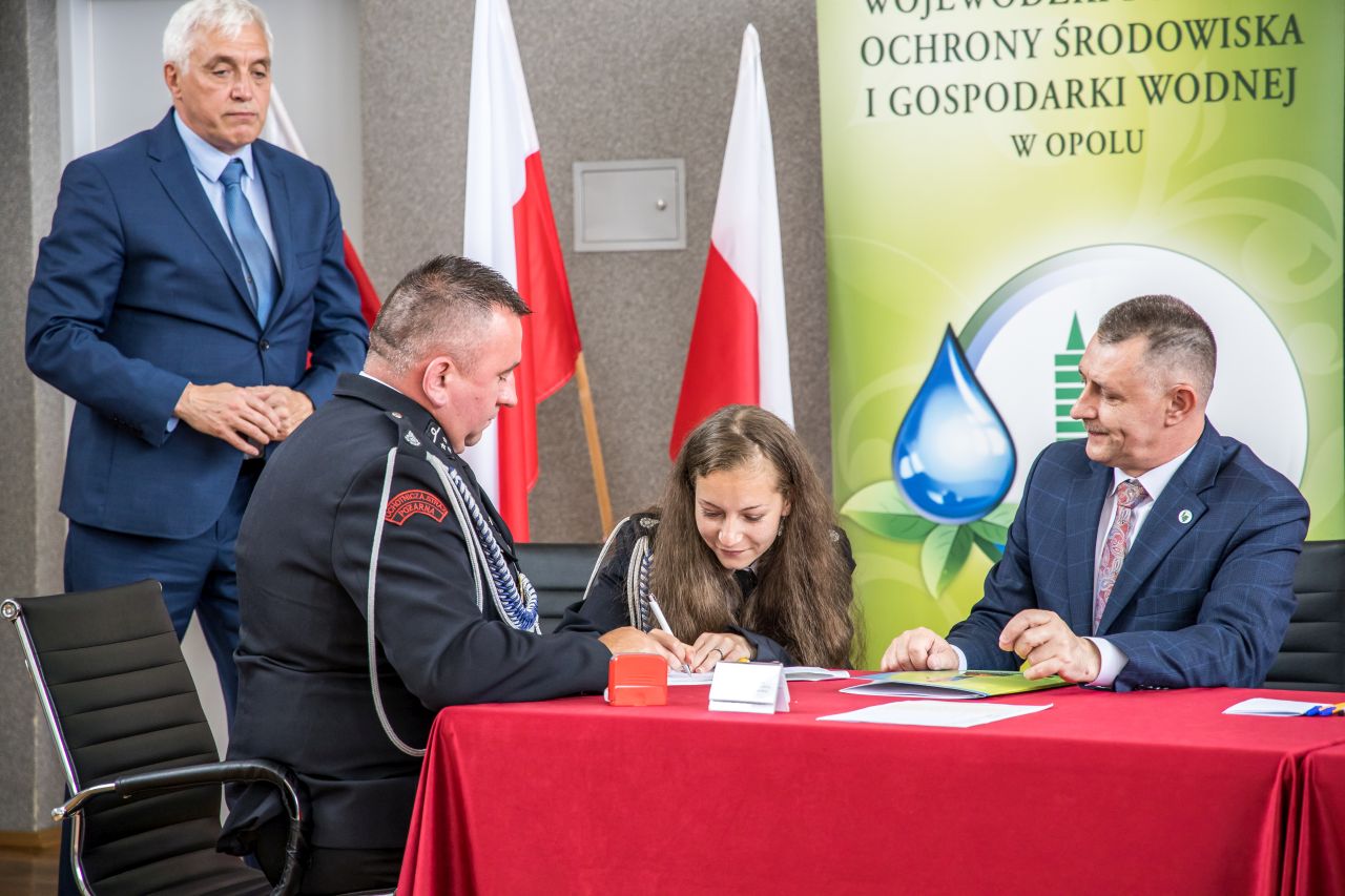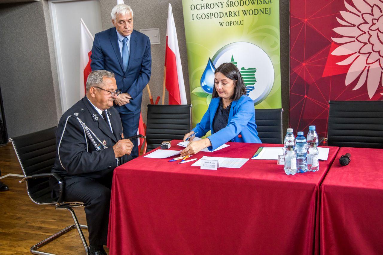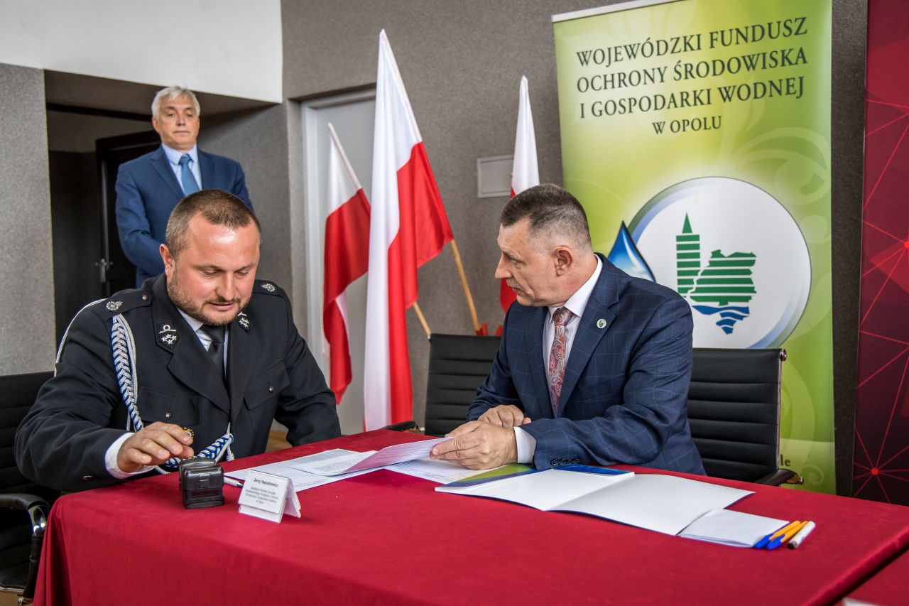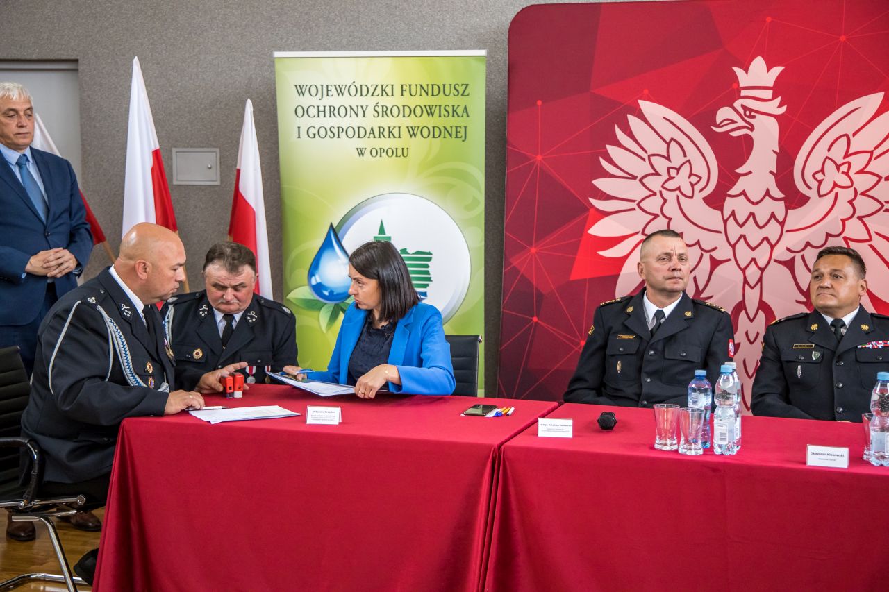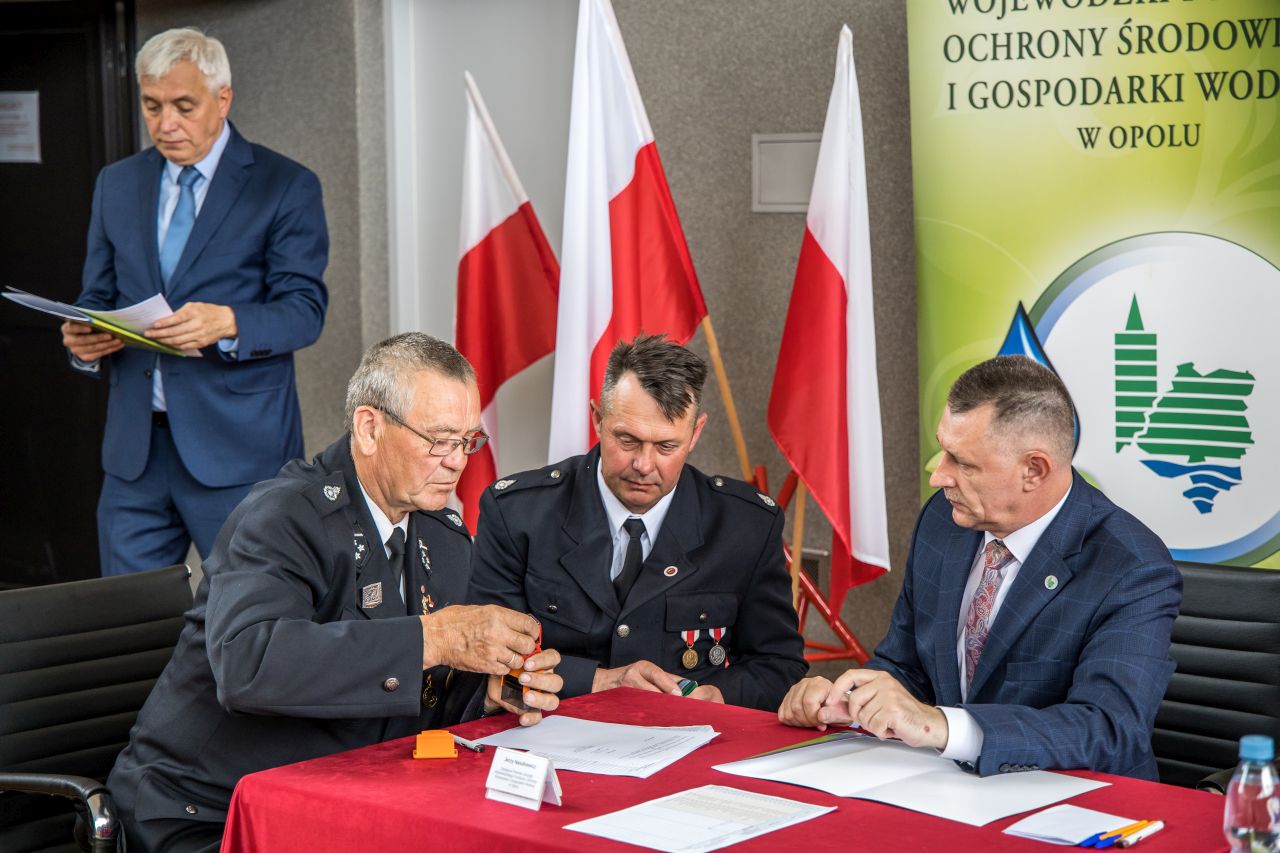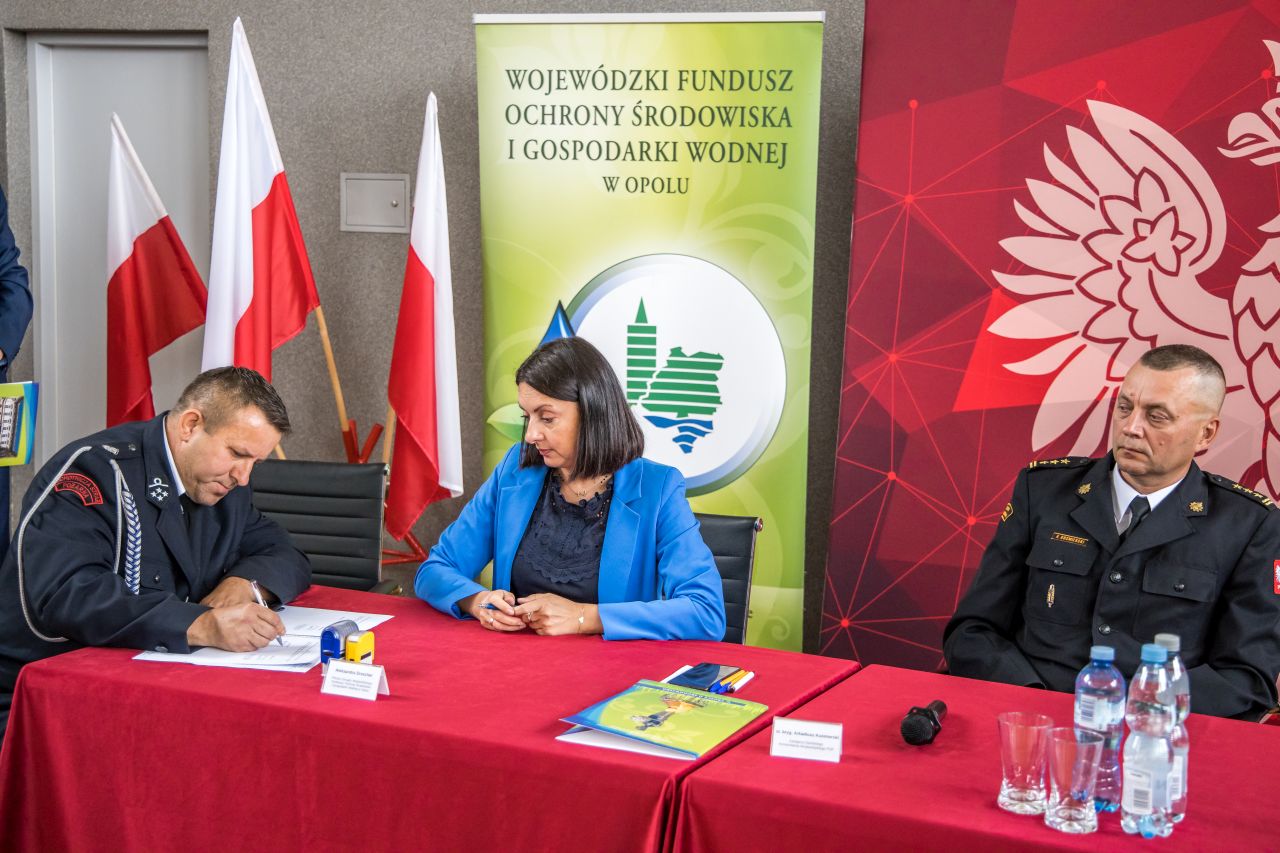 W uroczystym podpisaniu umów pomiędzy Wojewódzkim Funduszem Ochrony Środowiska i Gospodarki Wodnej w Opolu a jednostkami OSP brali udział: Pani Aleksandra Drescher Prezes Zarządu Wojewódzkiego Funduszu Ochrony Środowiska i Gospodarki Wodnej w Opolu, Pan Jerzy Naszkiewicz Zastępca Prezesa Zarządu Wojewódzkiego Funduszu Ochrony Środowiska i Gospodarki Wodnej w Opolu, Pan Sławomir Kłosowski Wojewoda Opolski, nadbryg. Krzysztof Kędryk Opolski Komendant Wojewódzki PSP, st. bryg. Arkadiusz Kuśmierski Zastępca Opolskiego Komendanta Wojewódzkiego PSP, dh Andrzej Borowski Prezes Zarządu Wojewódzkiego ZOSP RP w Opolu oraz dh Artur Gallus Wiceprezes Zarządu Wojewódzkiego ZOSP RP w Opolu.