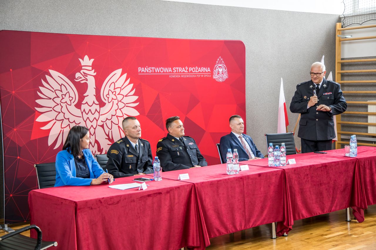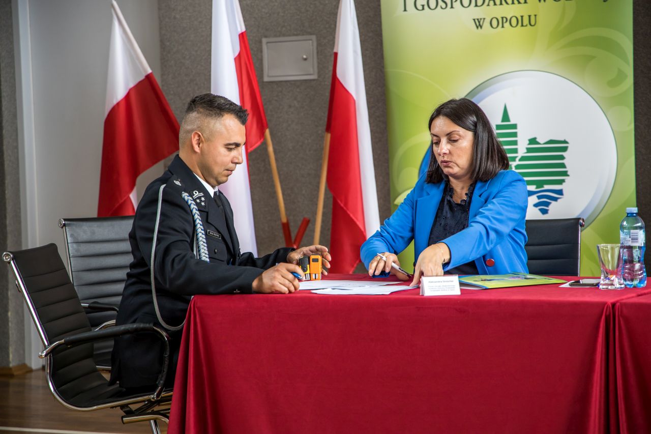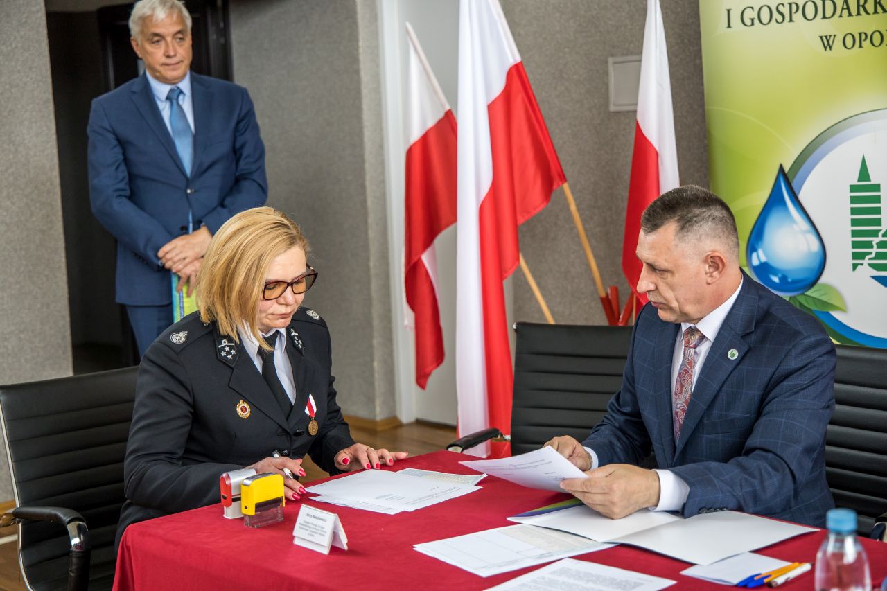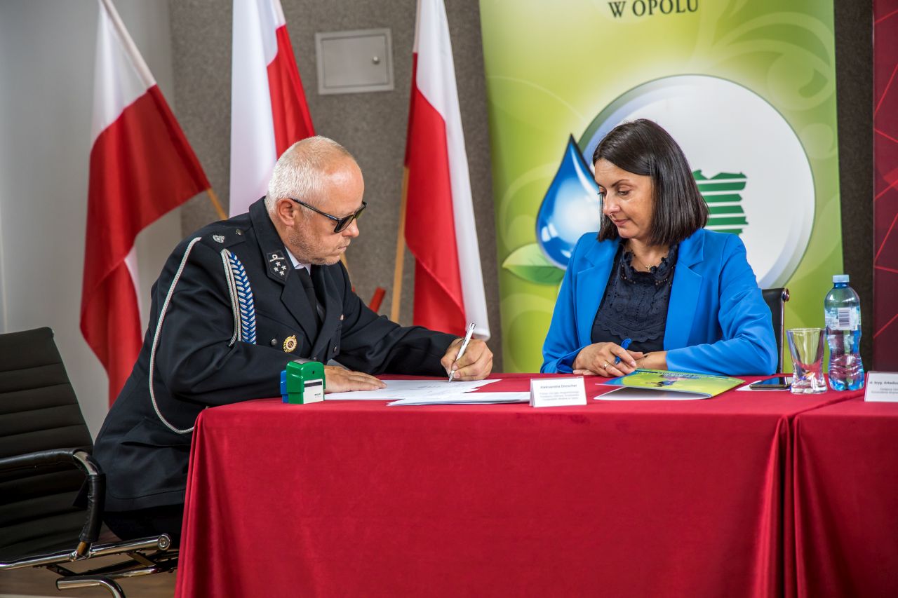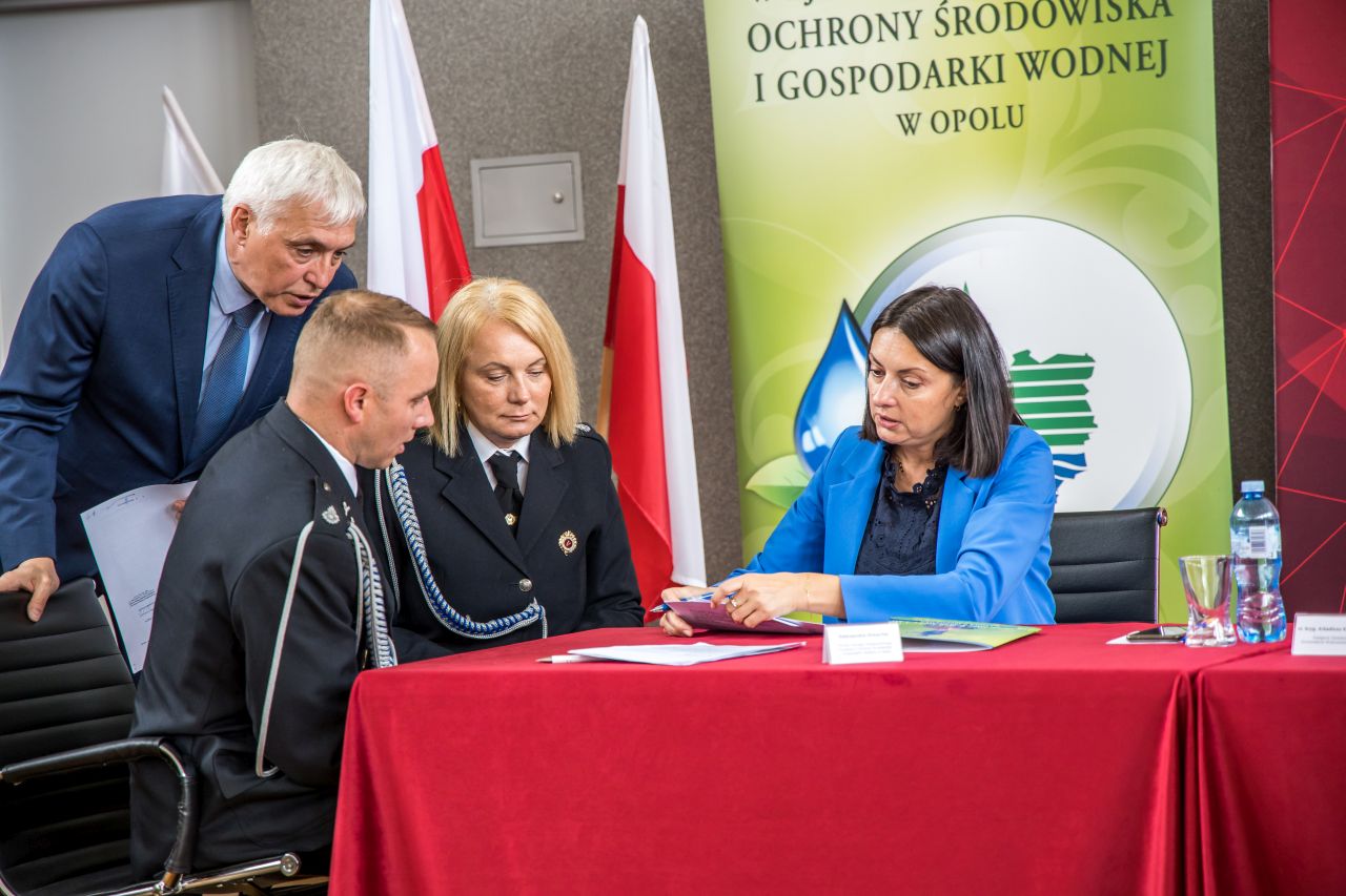 W uroczystym podpisaniu umów pomiędzy Wojewódzkim Funduszem Ochrony Środowiska i Gospodarki Wodnej w Opolu a jednostkami OSP brali udział: Pani Aleksandra Drescher Prezes Zarządu Wojewódzkiego Funduszu Ochrony Środowiska i Gospodarki Wodnej w Opolu, Pan Jerzy Naszkiewicz Zastępca Prezesa Zarządu Wojewódzkiego Funduszu Ochrony Środowiska i Gospodarki Wodnej w Opolu, Pan Sławomir Kłosowski Wojewoda Opolski, nadbryg. Krzysztof Kędryk Opolski Komendant Wojewódzki PSP, st. bryg. Arkadiusz Kuśmierski Zastępca Opolskiego Komendanta Wojewódzkiego PSP, dh Andrzej Borowski Prezes Zarządu Wojewódzkiego ZOSP RP w Opolu oraz dh Artur Gallus Wiceprezes Zarządu Wojewódzkiego ZOSP RP w Opolu.