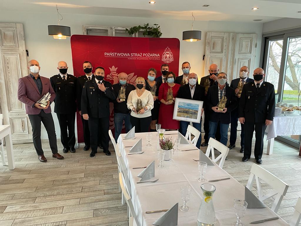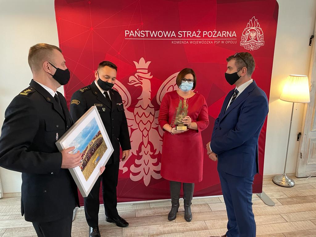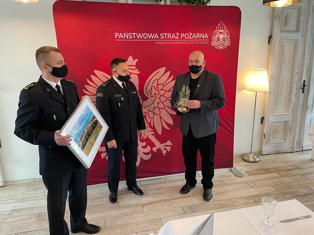 Opolski Komendant Wojewódzki PSP w Opolu wraz z Zastępcą Opolskiego Komendanta Wojewódzkiego PSP w Opolu w podziękowaniu wręczył każdemu pamiątkowe zdjęcie wszystkich uczestników ćwiczeń „Opolskie 2021” wykonane na obozowisku oraz statuetkę do nich nawiązującą.