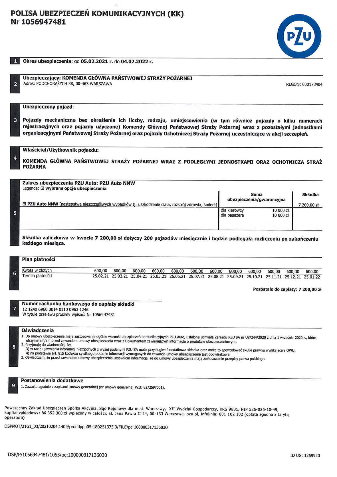 Aby zapewnić właściwą ochronę uczestników tych transportów tj. osób przewożonych na szczepienia pojazdami Państwowej Straży Pożarnej i ochotniczych straży pożarnych oraz kierowców tychże pojazdów, komendant główny PSP nadbryg. Andrzej Bartkowiak zawarł z Powszechnym Zakładem Ubezpieczeń S.A. umowę ubezpieczenia w zakresie następstw nieszczęśliwych wypadków na okres od 05.02.2021 r. do 04.02.2022 r.
