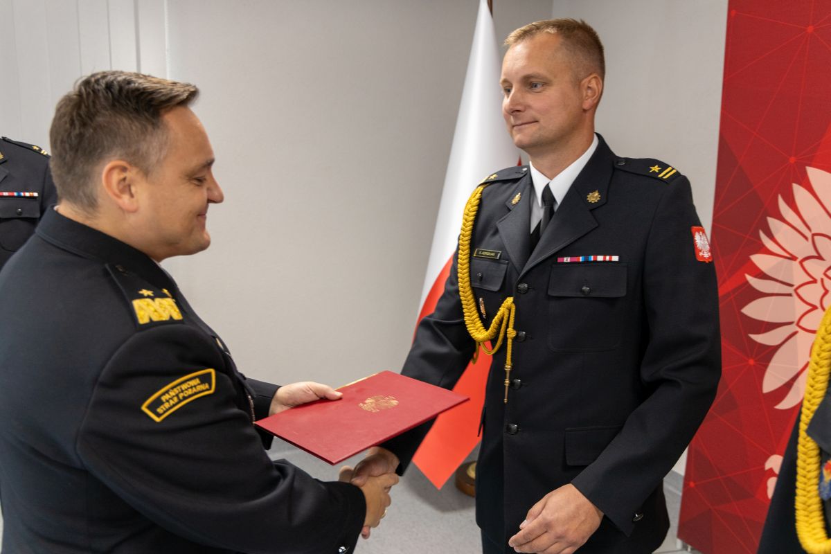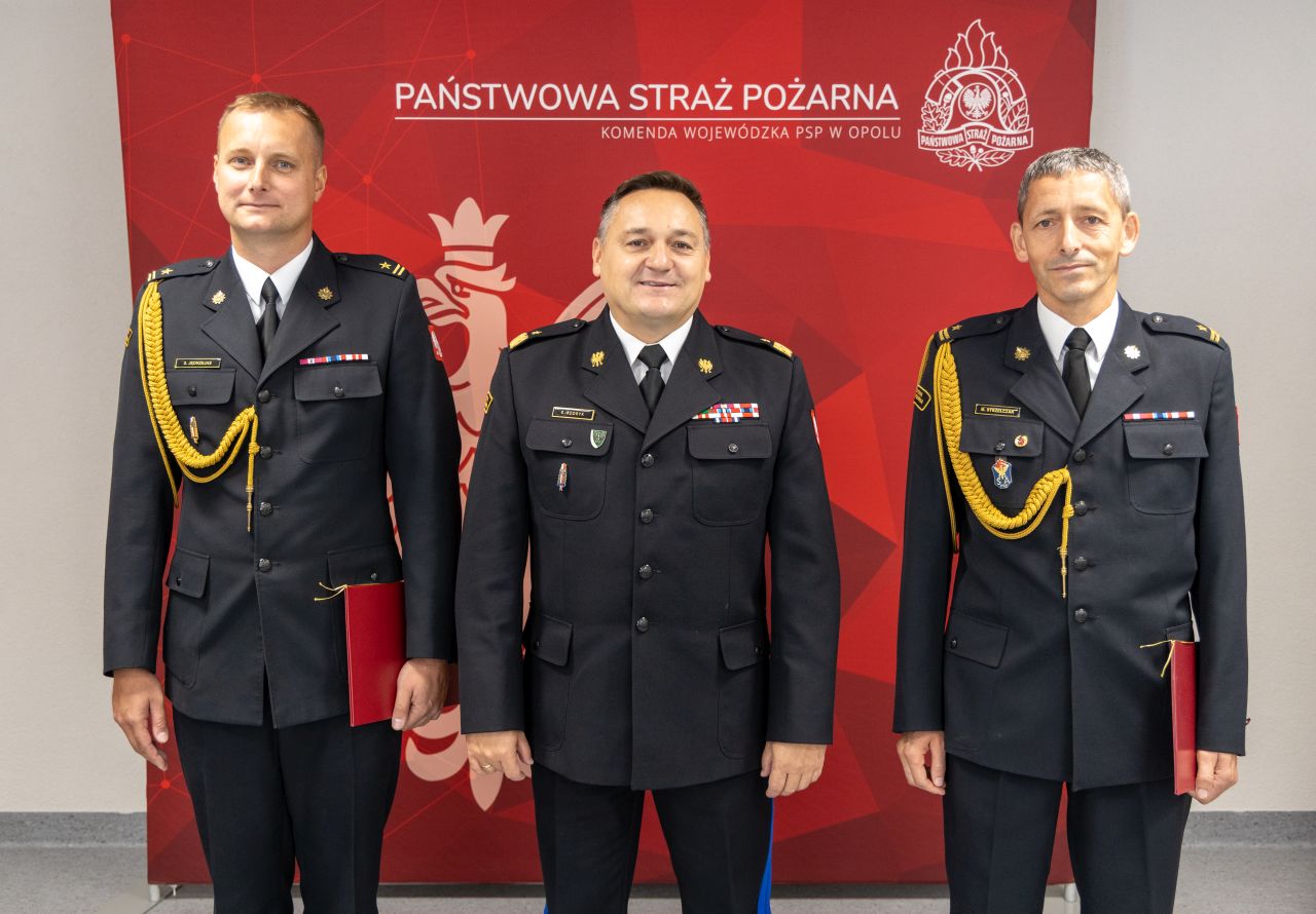 Mł. bryg. Szymon Jędrzejas oraz mł. bryg. Mariusz Strzelczak otrzymali akt powołania z rąk nadbryg. Krzysztofa Kędryka Opolskiego Komendanta Wojewódzkiego PSP w obecności st. bryg. Piotra Dudka Komendanta Powiatowego PSP w Kędzierzynie-Koźlu oraz mł. bryg. Andrzeja Wróbla Komendanta Powiatowego PSP w Oleśnie.