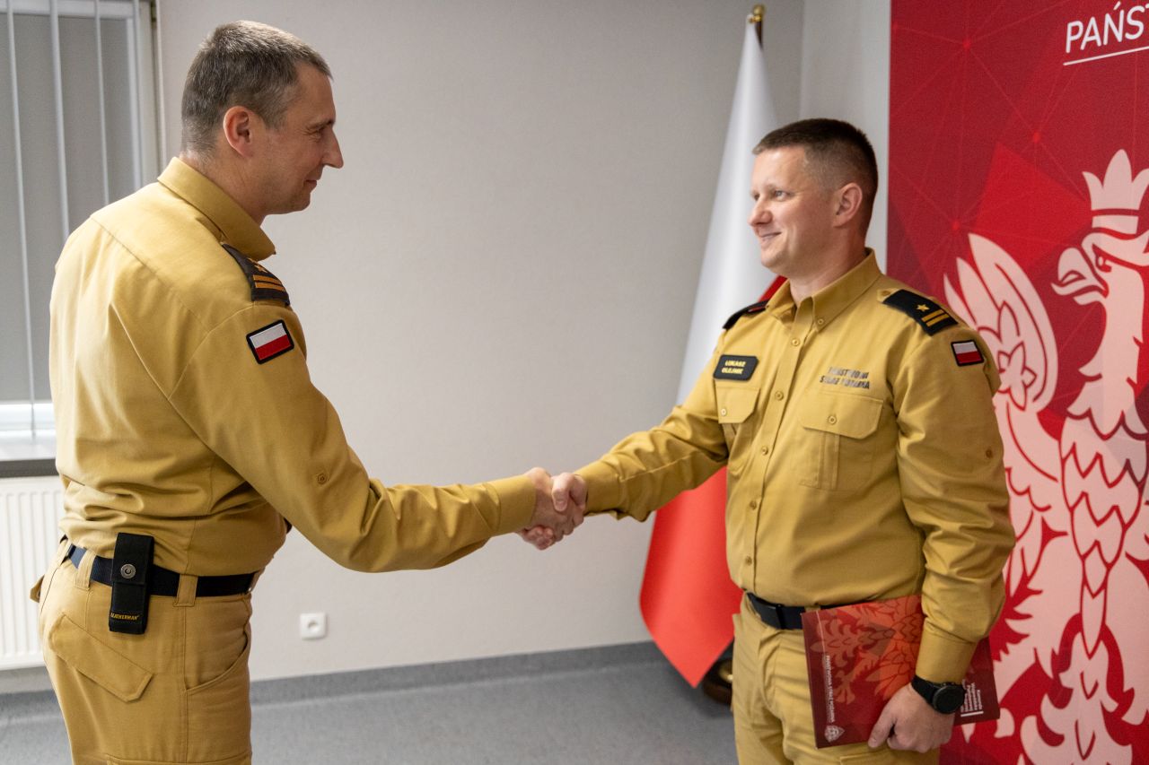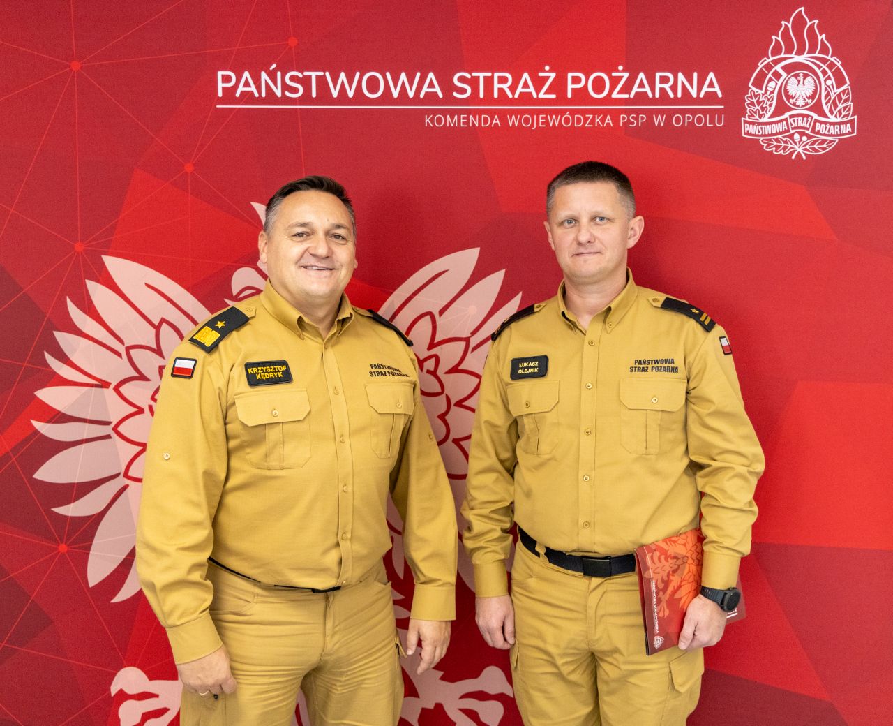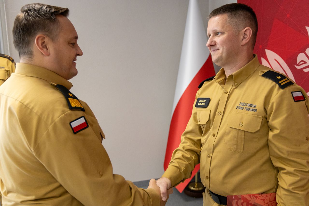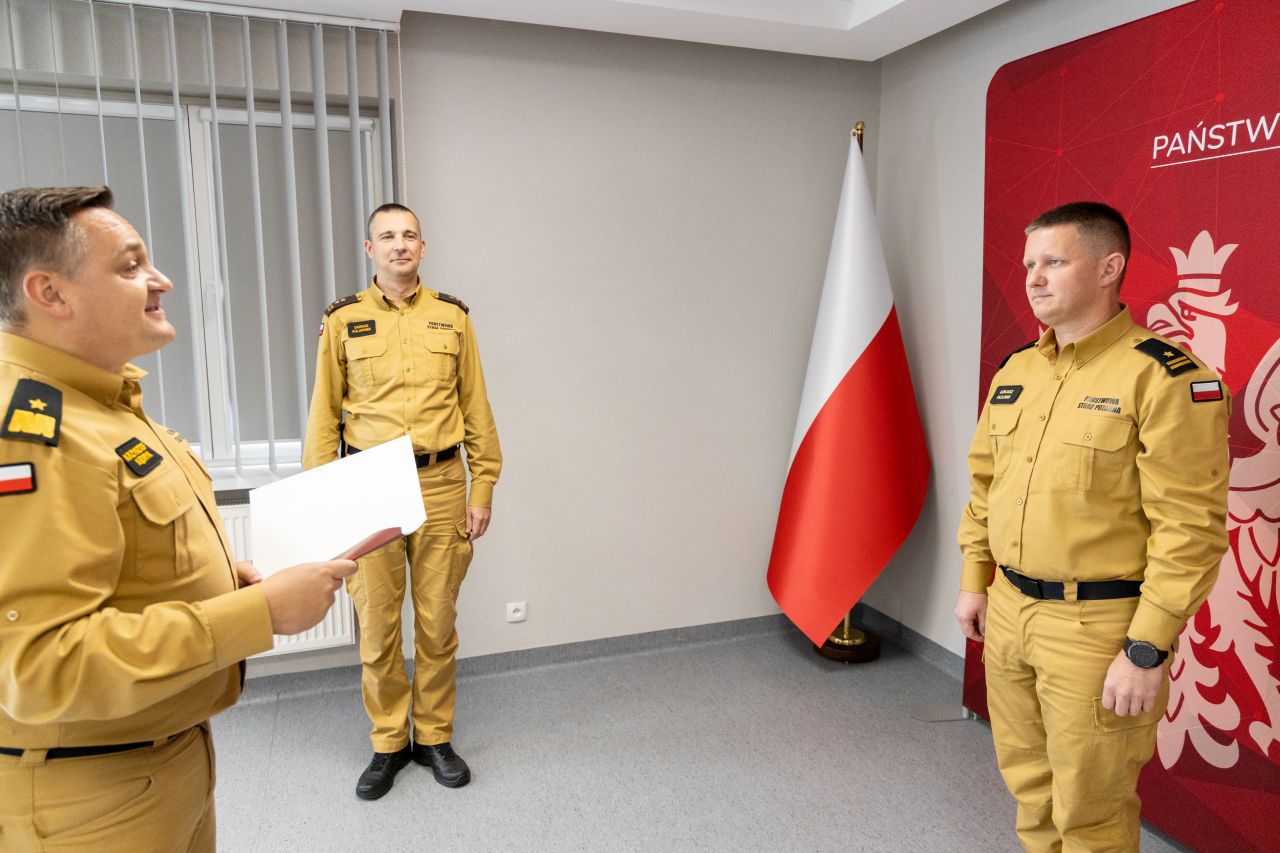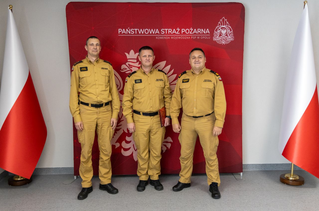 Mł. bryg. Łukasz Olejnik otrzymał akt powołania z rąk nadbryg. Krzysztofa Kędryka Opolskiego Komendanta Wojewódzkiego PSP w obecności bryg. Dariusza Kulawinka Komendanta Powiatowego PSP w Brzegu.