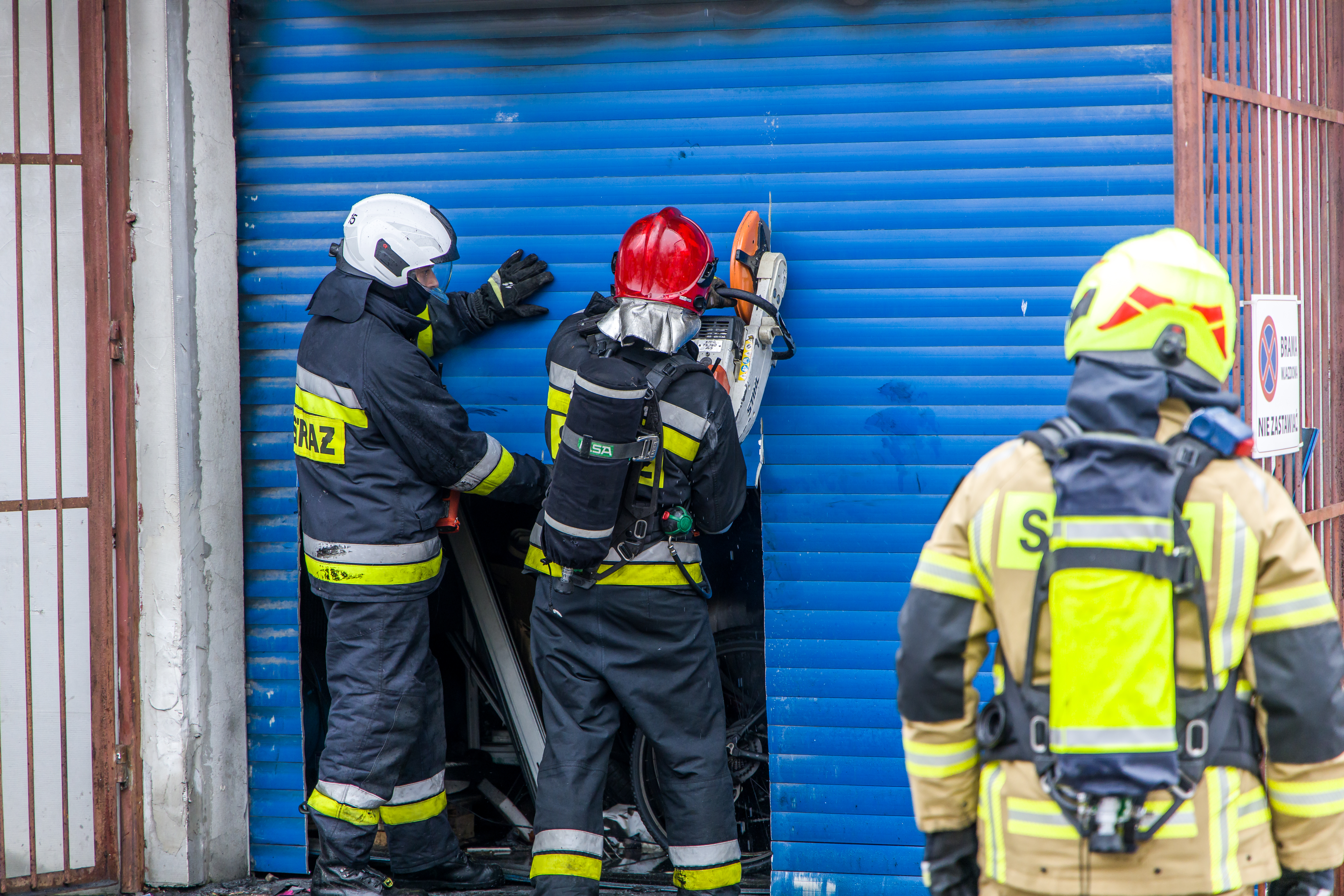 Strażacy siłą własnych mięśni przepchali poza strefę niebezpieczną kilka zaparkowanych w pobliżu budynku samochodów osobowych.