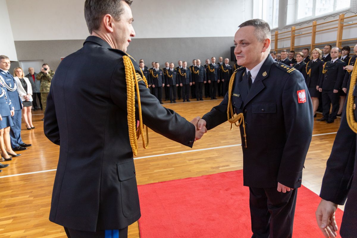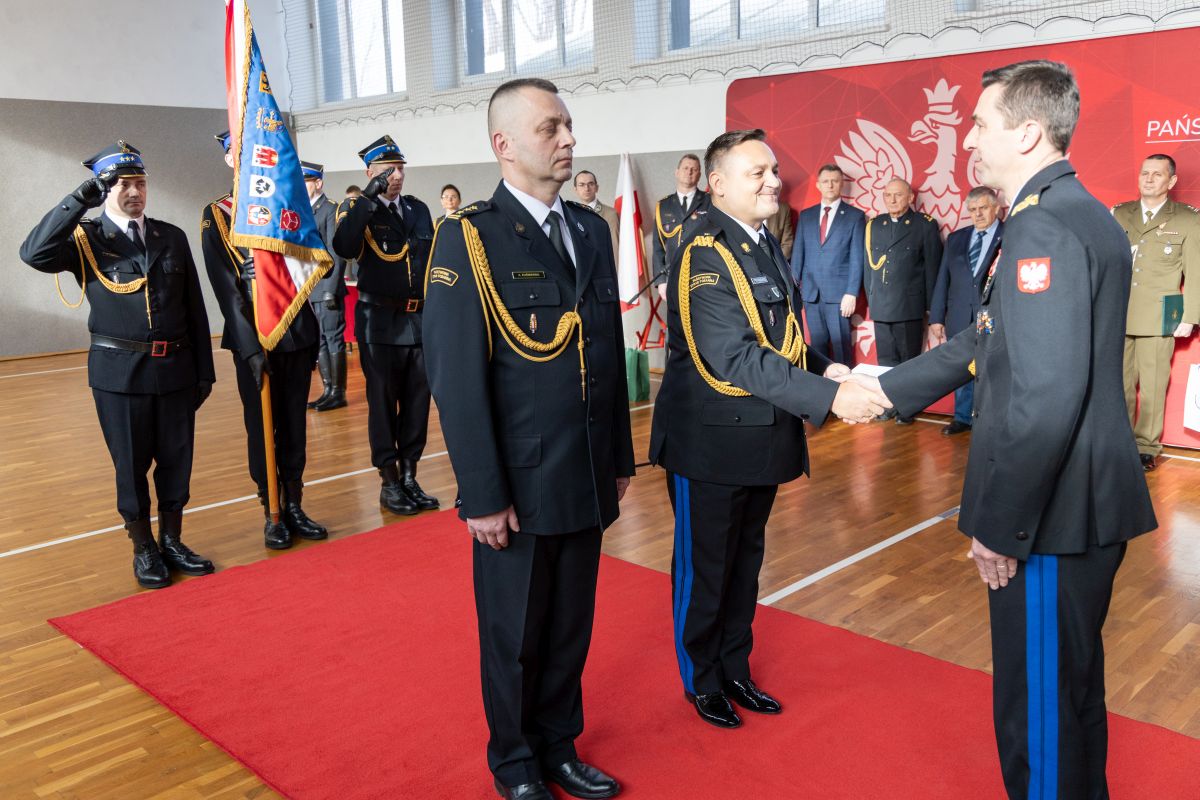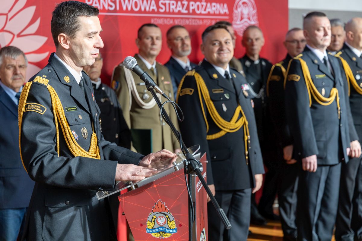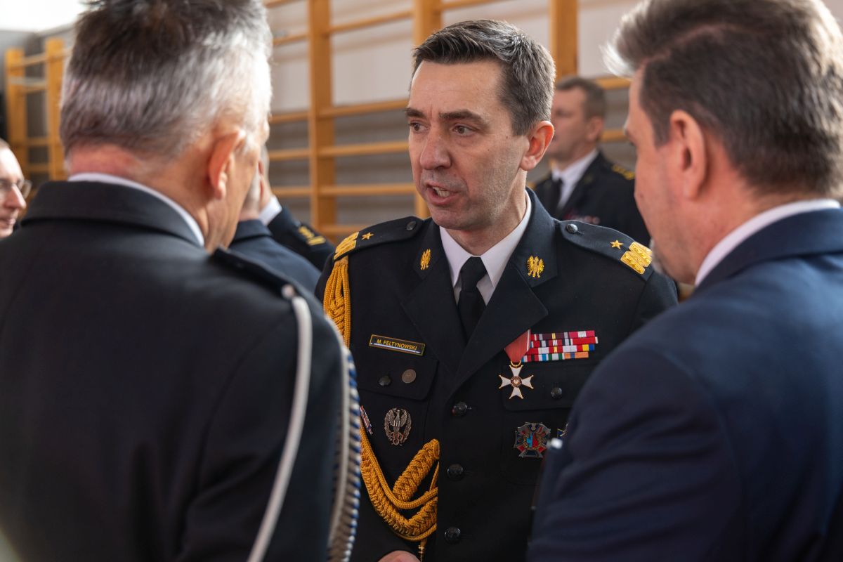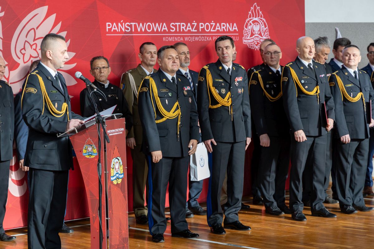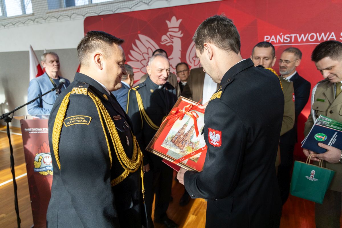 Nadbryg. dr inż. Mariusz Feltynowski Komendant Główny PSP w swoim wystąpieniu podziękował za dotychczasowe lata służby nadbryg. Krzysztofowi Kędrykowi przechodzącemu na zaopatrzenie emerytalne, życząc jednocześnie zdrowia i realizacji swojego hobby oraz czasu na rodzinę.