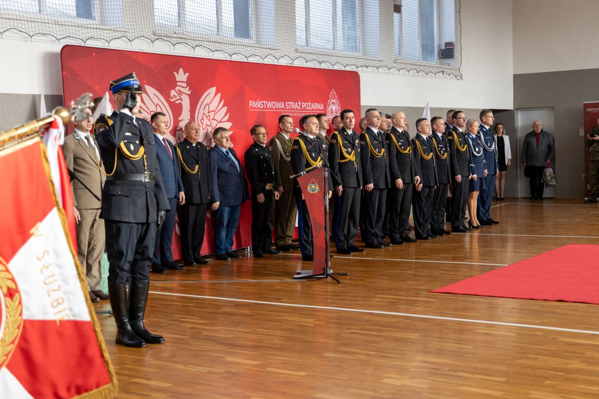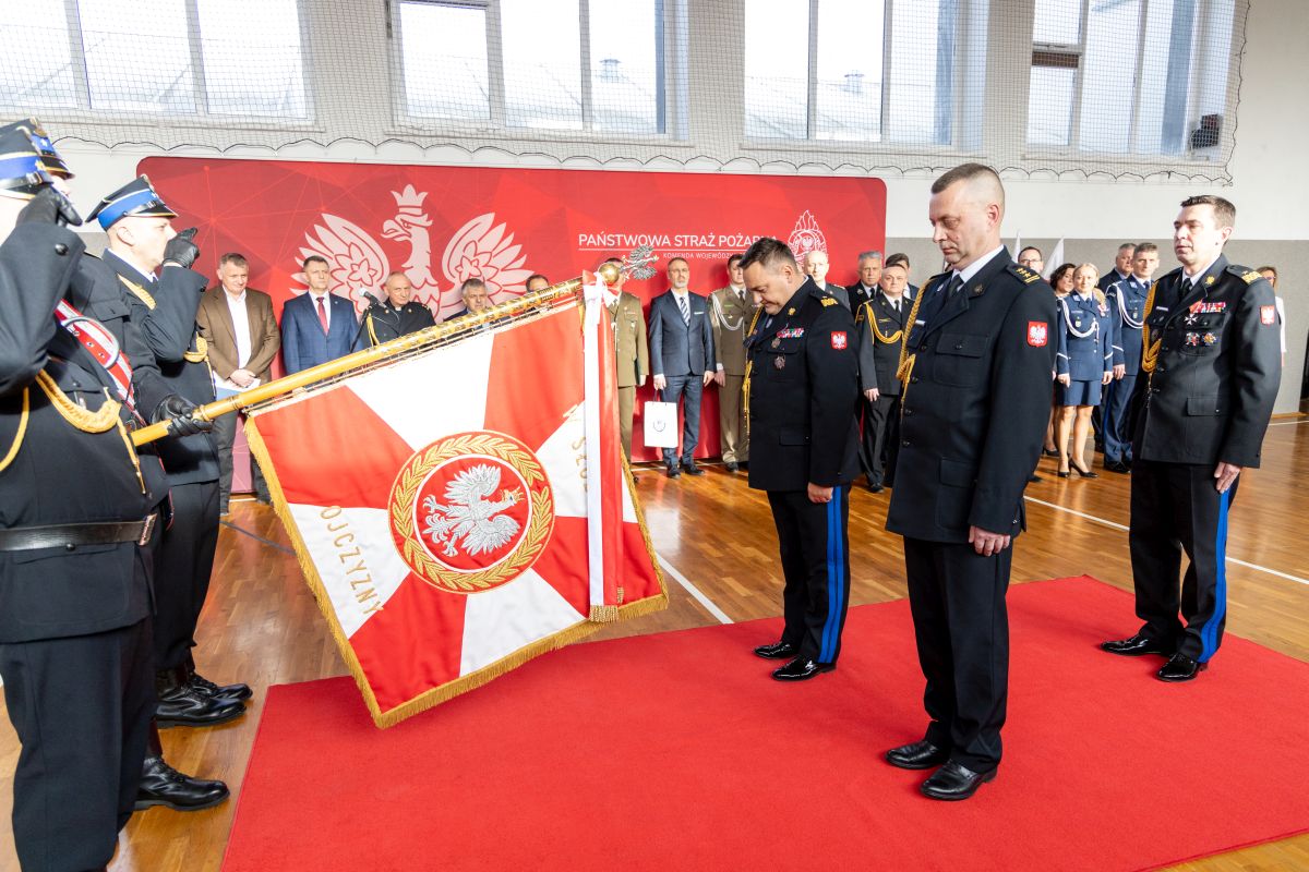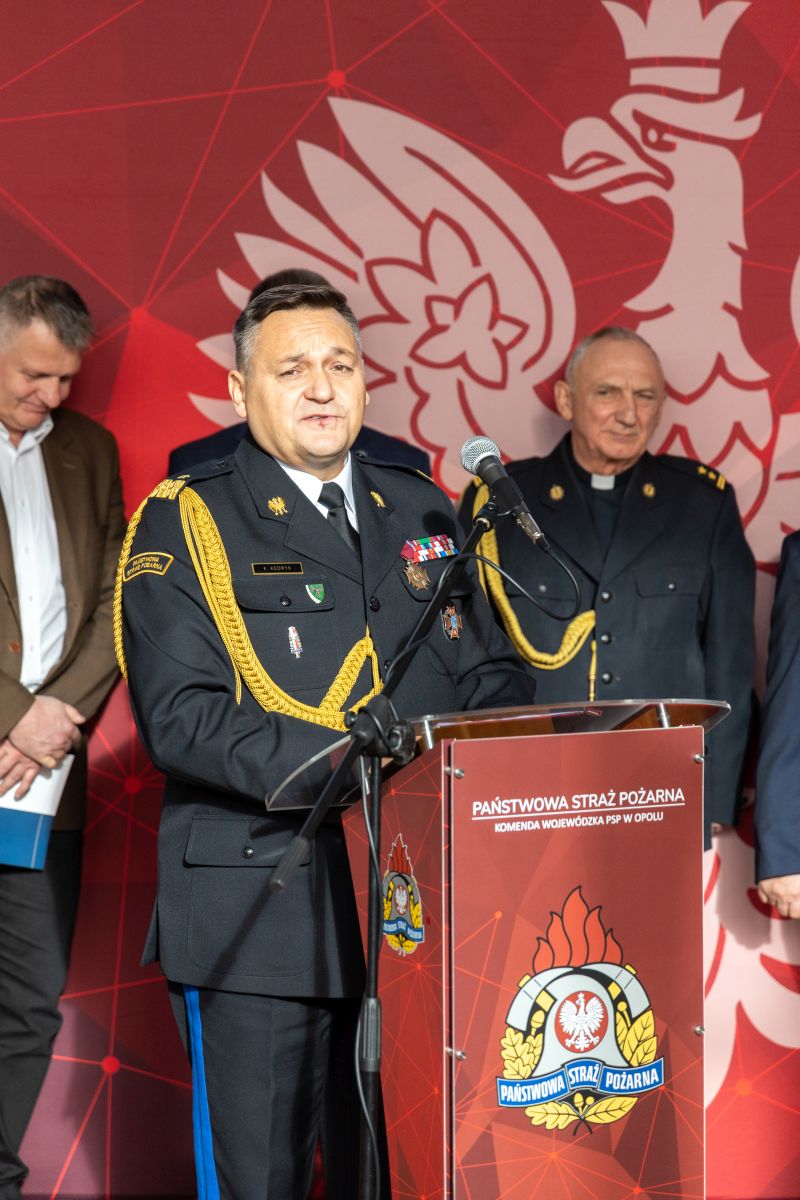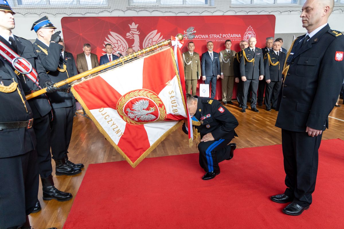 W obecności nadbryg. dr inż. Mariusza Feltynowskiego Komendanta Głównego Państwowej Straży Pożarnej oraz wszystkich zebranych na sali, nadbryg. Krzysztof Kędryk Opolski Komendant Wojewódzki Państwowej Straży Pożarnej pożegnał się ze sztandarem Komendy Wojewódzkiej PSP w Opolu zdając jednocześnie obowiązki Opolskiego Komendanta Wojewódzkiego PSP.