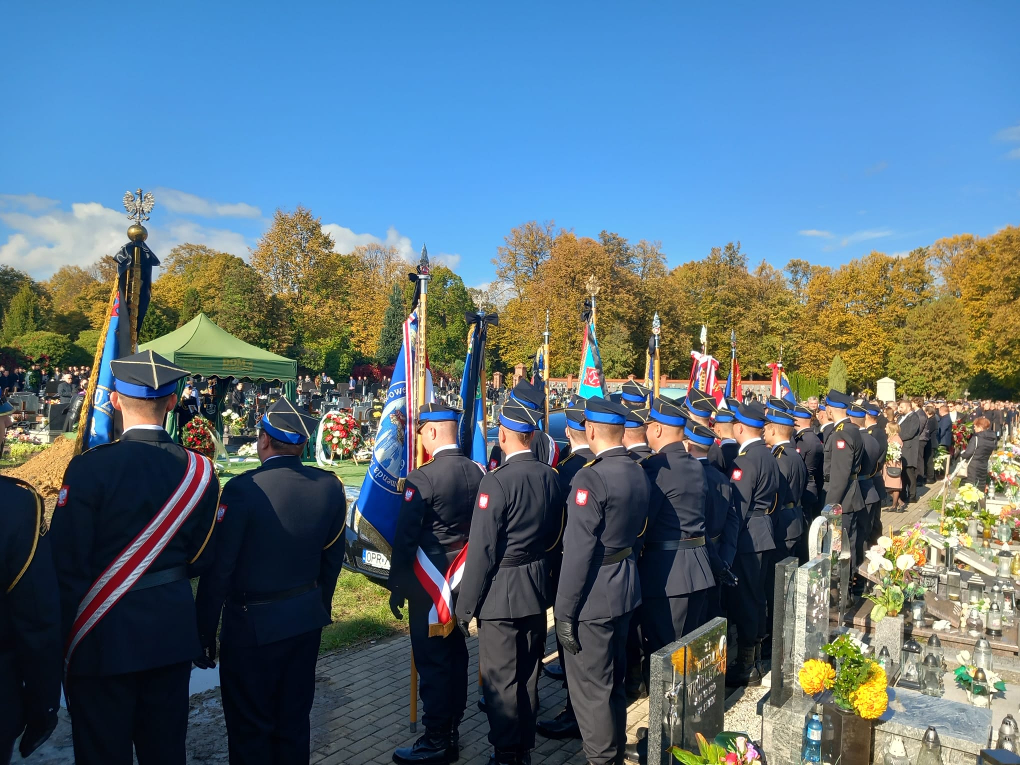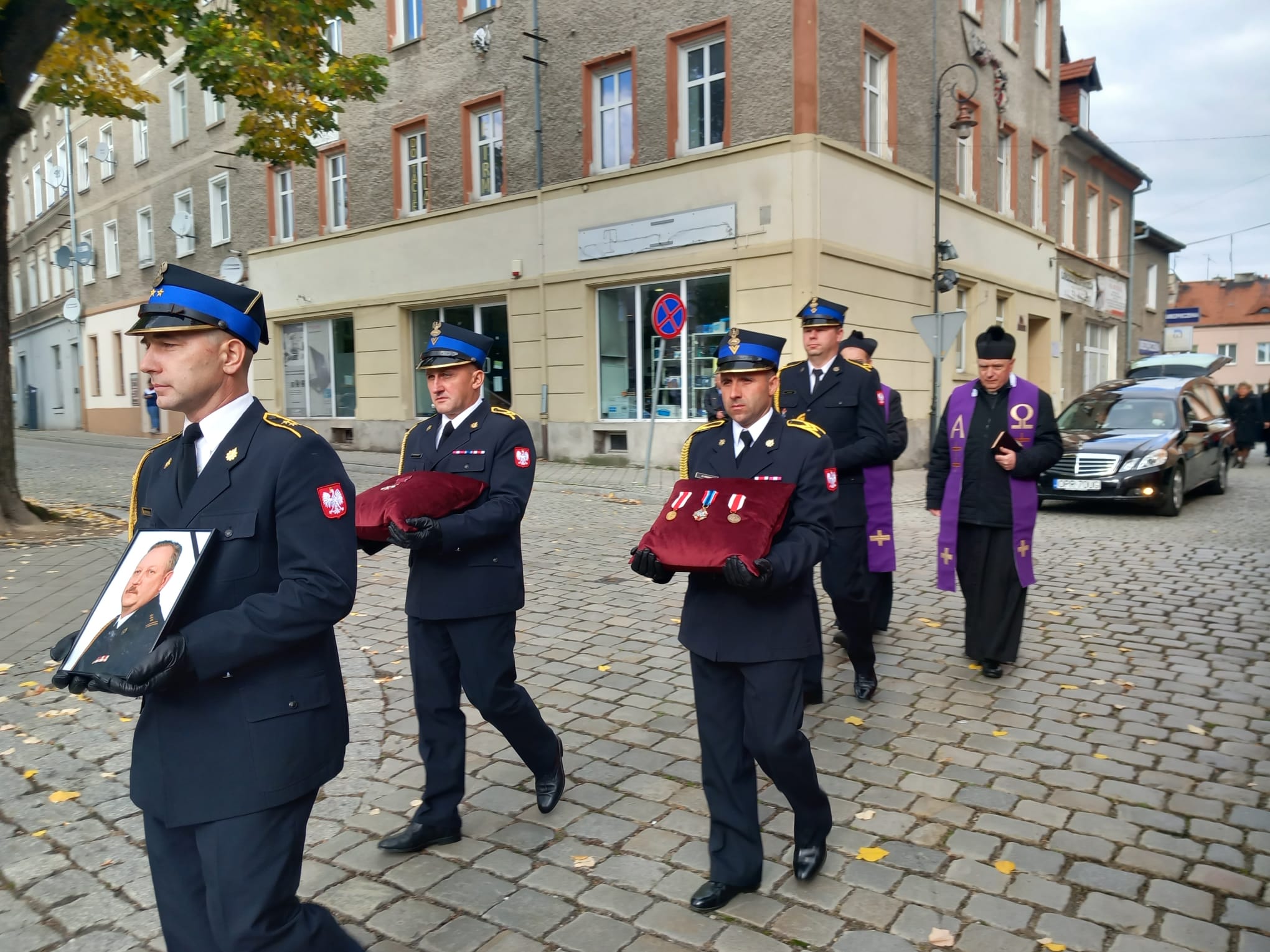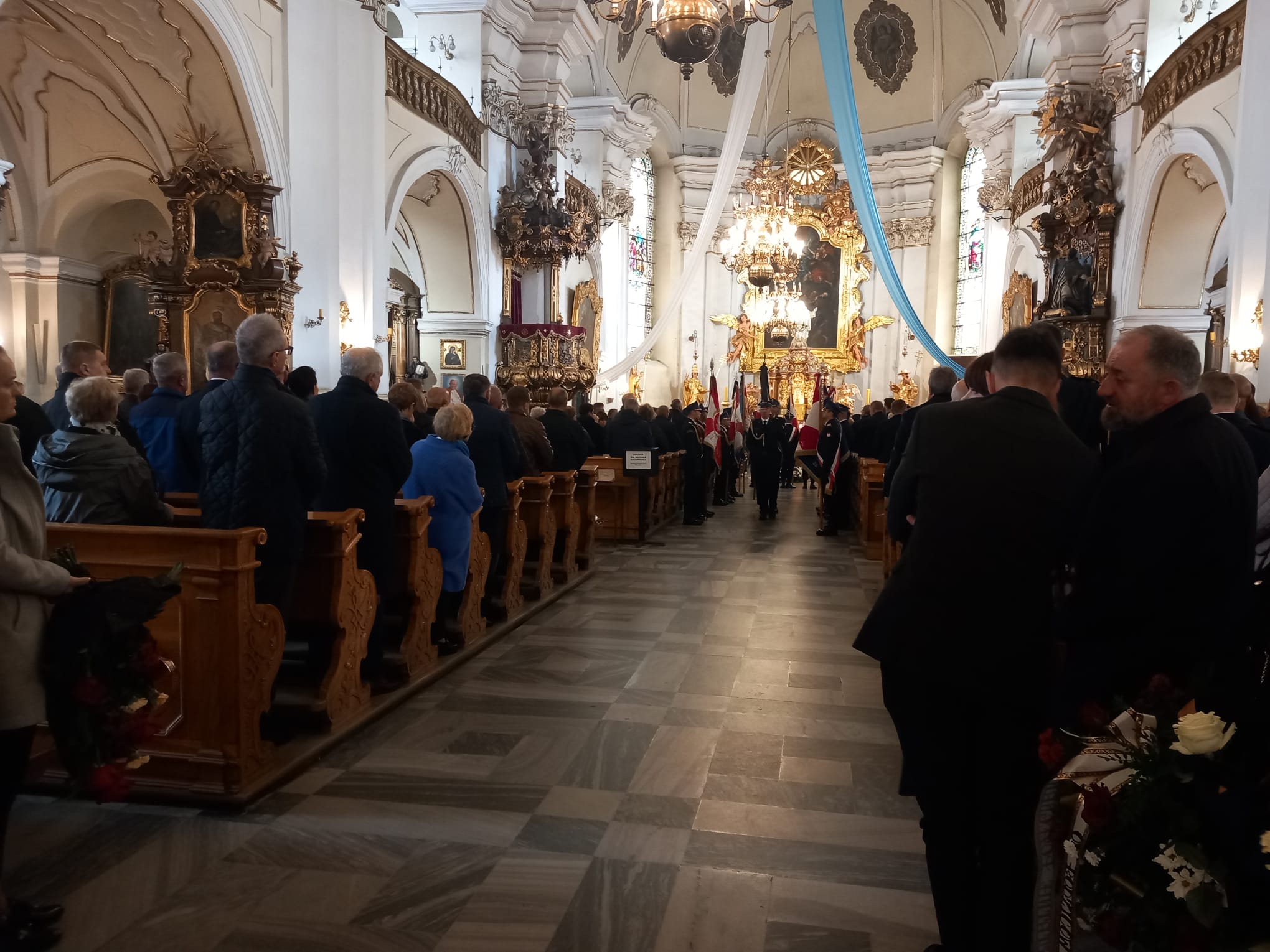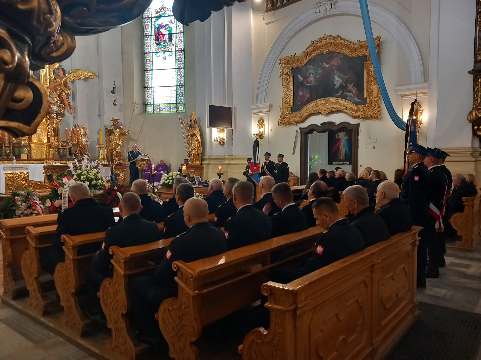 Poczty sztandarowe, delegacje z komend powiatowych i miejskiej PSP z komendantami powiatowymi i miejskim PSP województwa opolskiego na czele, delegacja Komendy Wojewódzkiej PSP w Opolu, emeryci Państwowej Straży Pożarnej i koledzy zmarłego uczestniczyli w Mszy Świętej pogrzebowej w Kościele Św. Michała Archanioła w Prudniku.