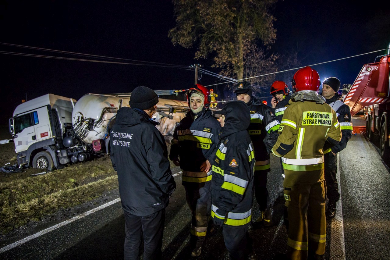 Po przybyciu na miejsce pierwszego zastępu kierujący działaniem ratowniczym w wyniku rozpoznania stwierdził, że ciągnik siodłowy wraz z cysterną znajdują się poza drogą, a kierowca opuścił pojazd przed przybyciem jednostek ochrony przeciwpożarowej. Ponadto stwierdzono, że doszło do rozszczelnienia zbiornika paliwa w ciągniku siodłowym, a cysterna z propanem nie została uszkodzona.
