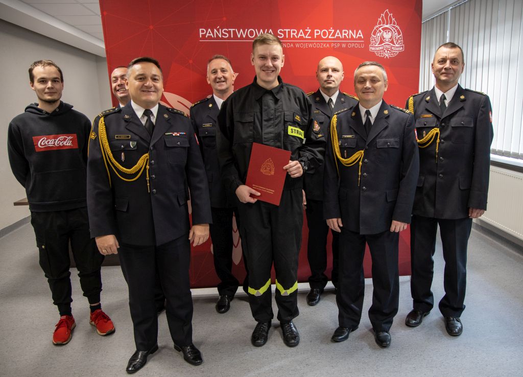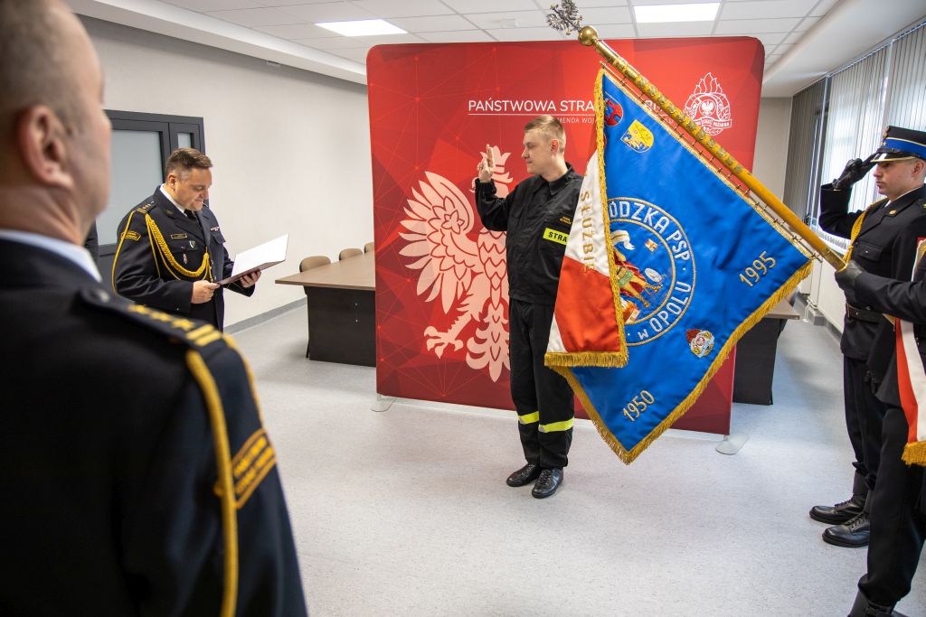 Podczas uroczystej zbiórki Opolski Komendant Wojewódzki PSP w Opolu st. bryg. Krzysztof Kędryk przyjął ślubowanie oraz powitał w szeregach Państwowej Straży Pożarnej str. Pawła Szynklera.