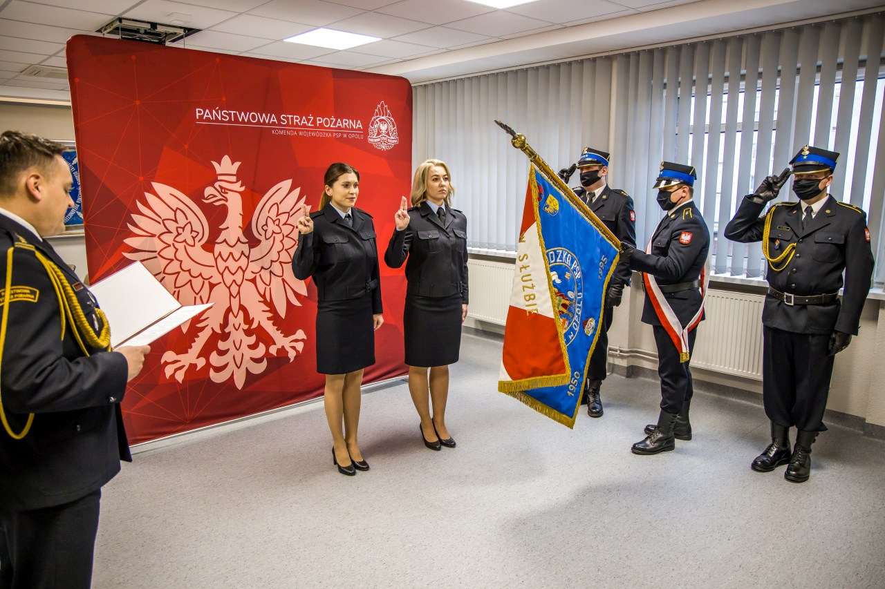 Tak rozpoczyna się rota ślubowania, którą wypowiedziały 11 lutego 2022 roku dwie funkcjonariuszki Komendy Wojewódzkiej Państwowej Straży Pożarnej w Opolu.
