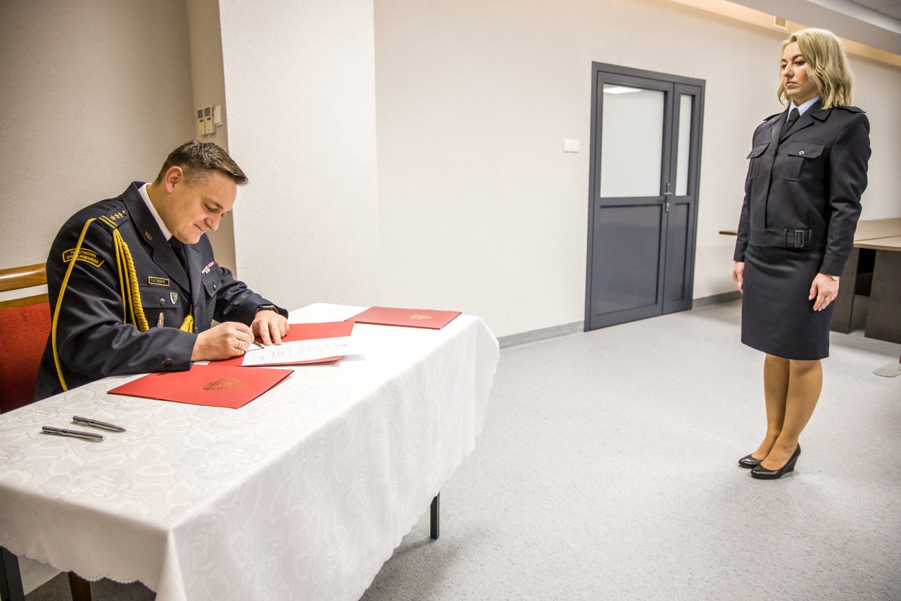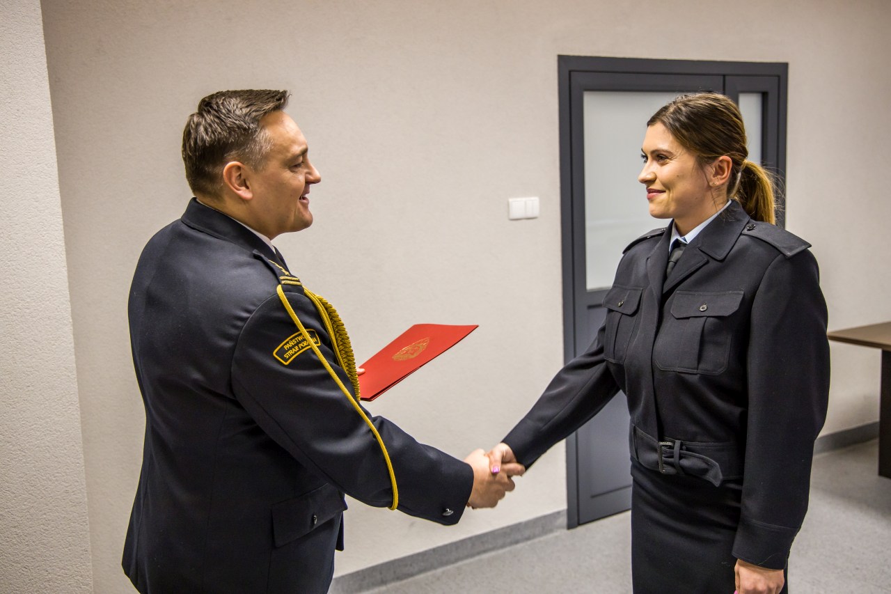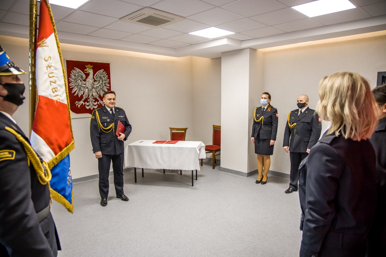 Podczas uroczystej zbiórki w Komendzie Wojewódzkiej PSP w Opolu, Opolski Komendant Wojewódzki PSP w Opolu st. bryg. Krzysztof Kędryk przyjął ślubowanie oraz powitał w szeregach Państwowej Straży Pożarnej str. Monikę Wójcik - Janczak oraz str. Barbarę Falarz.