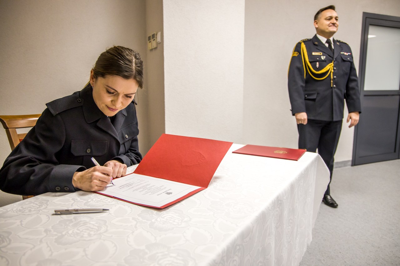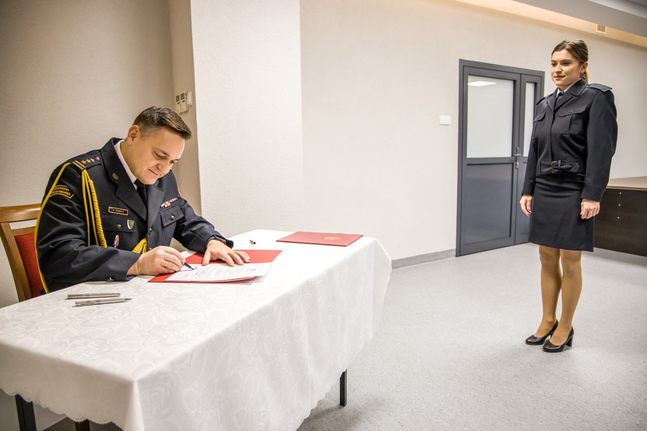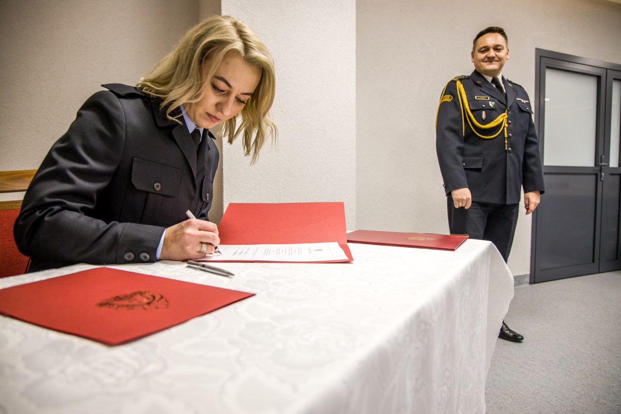 Podczas uroczystej zbiórki w Komendzie Wojewódzkiej PSP w Opolu, Opolski Komendant Wojewódzki PSP w Opolu st. bryg. Krzysztof Kędryk przyjął ślubowanie oraz powitał w szeregach Państwowej Straży Pożarnej str. Monikę Wójcik - Janczak oraz str. Barbarę Falarz.
