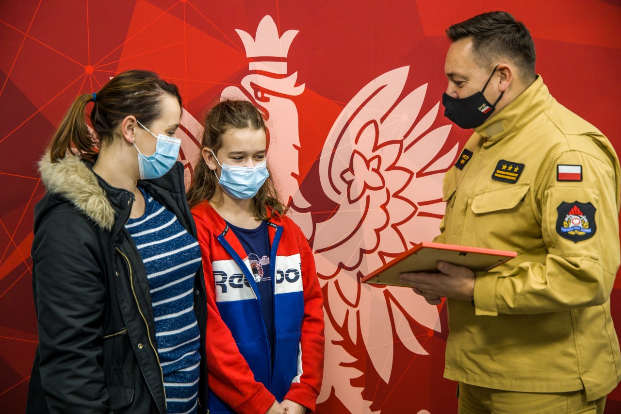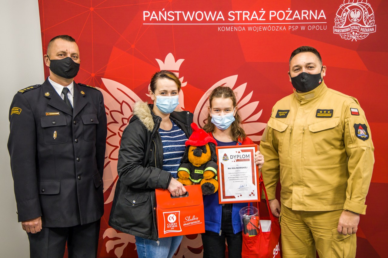 Ponadto Komendant Główny PSP oraz Opolski Komendant Wojewódzki PSP w Opolu przekazali dziewczynce kilka upominków związanych z Państwową Strażą Pożarną.