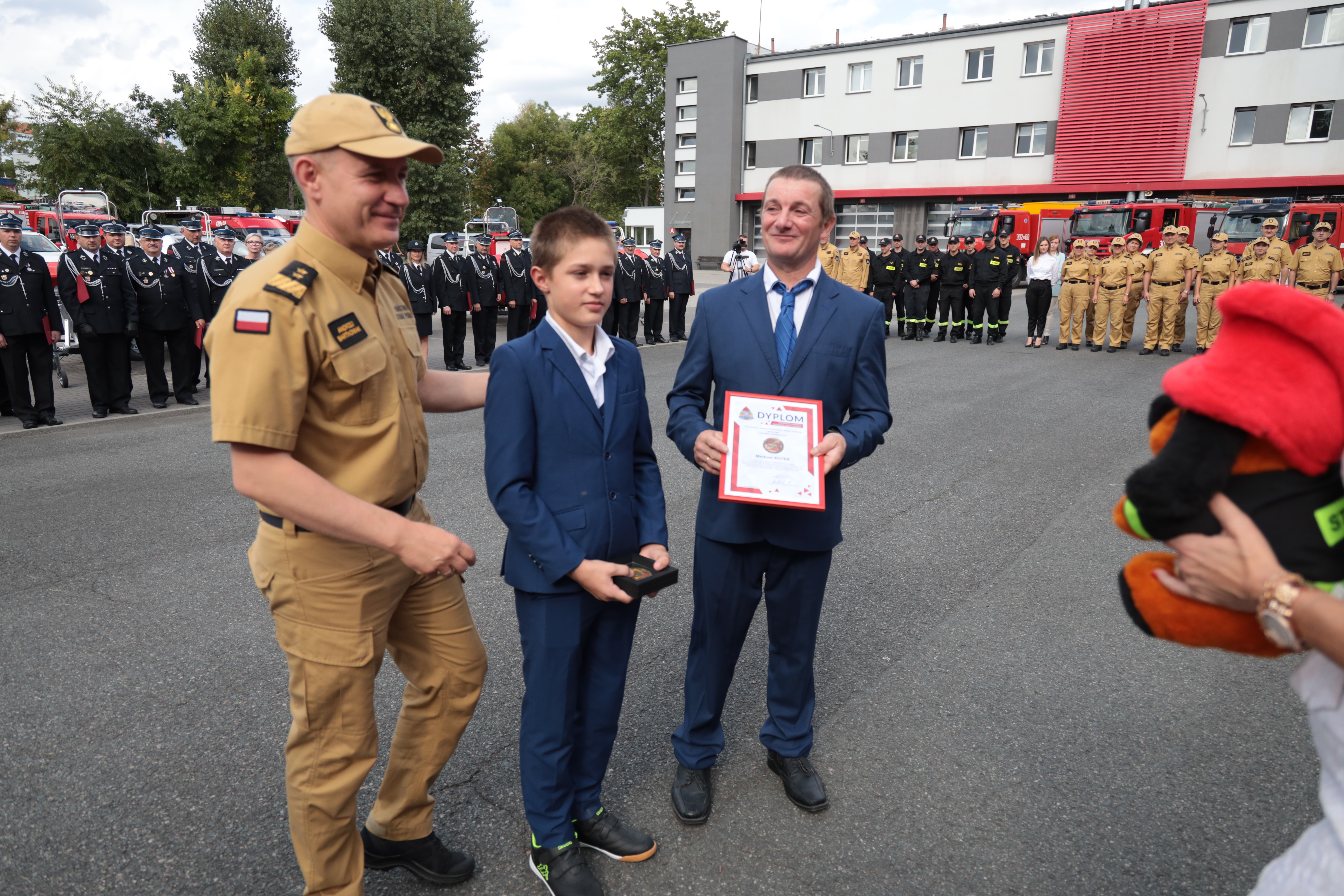 Następnie nadszedł moment wręczenia Odznaki Komendanta Głównego PSP „Iuvenis Forti” i dyplomu Komendanta Głównego PSP Markowi Kuteniowi, 12-latkowi z powiatu prudnickiego, który to godną do naśladowania postawą przyczynił się do uratowania zdrowia członka rodziny.