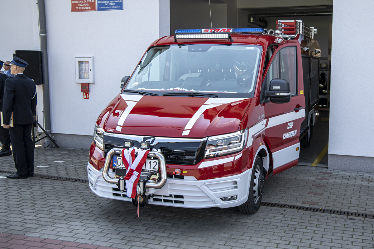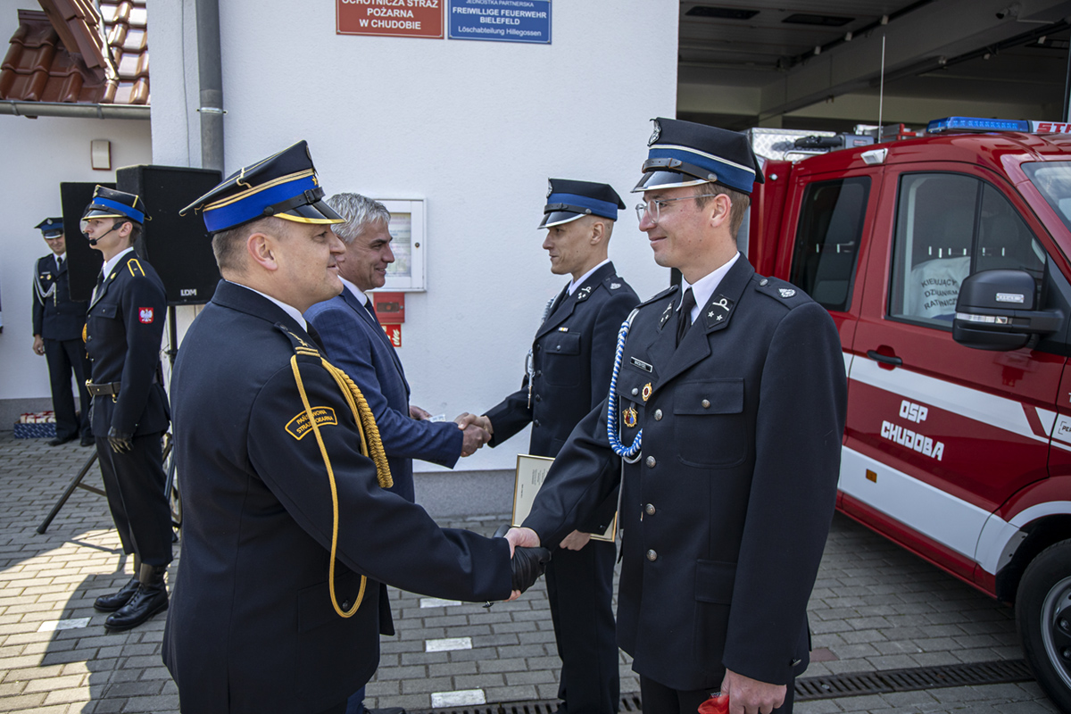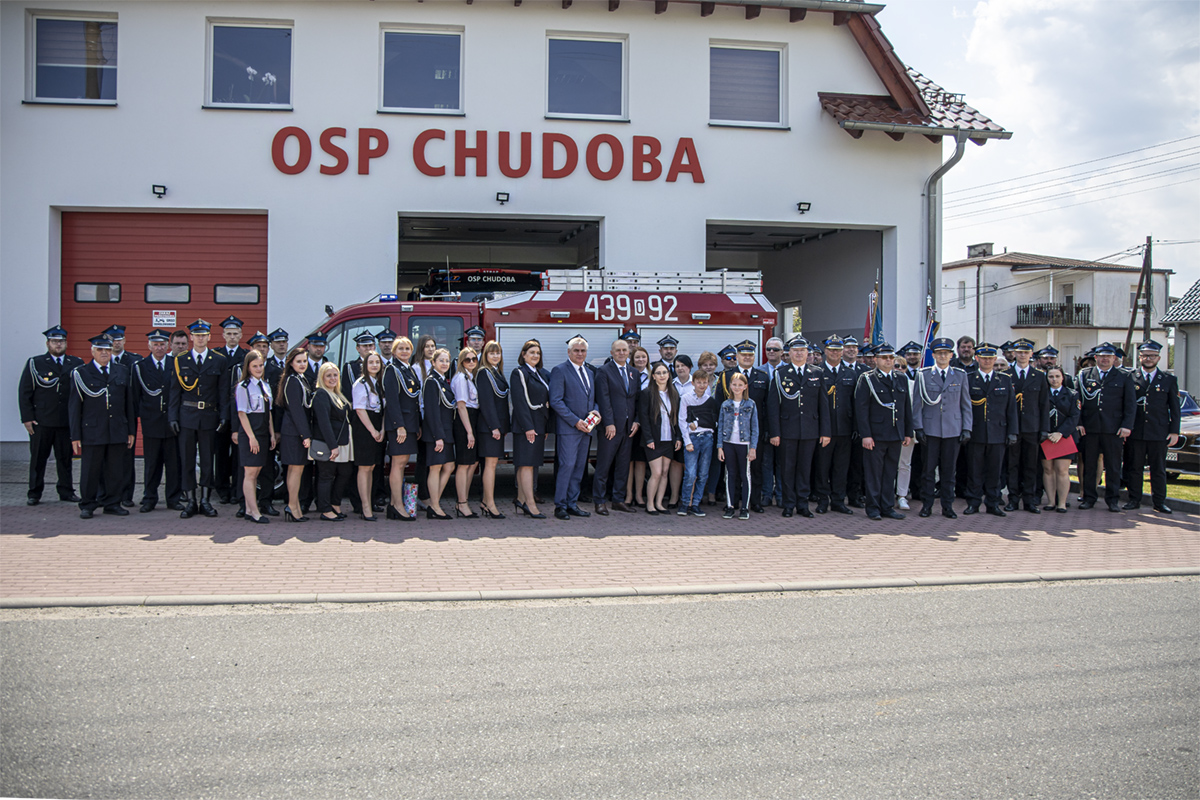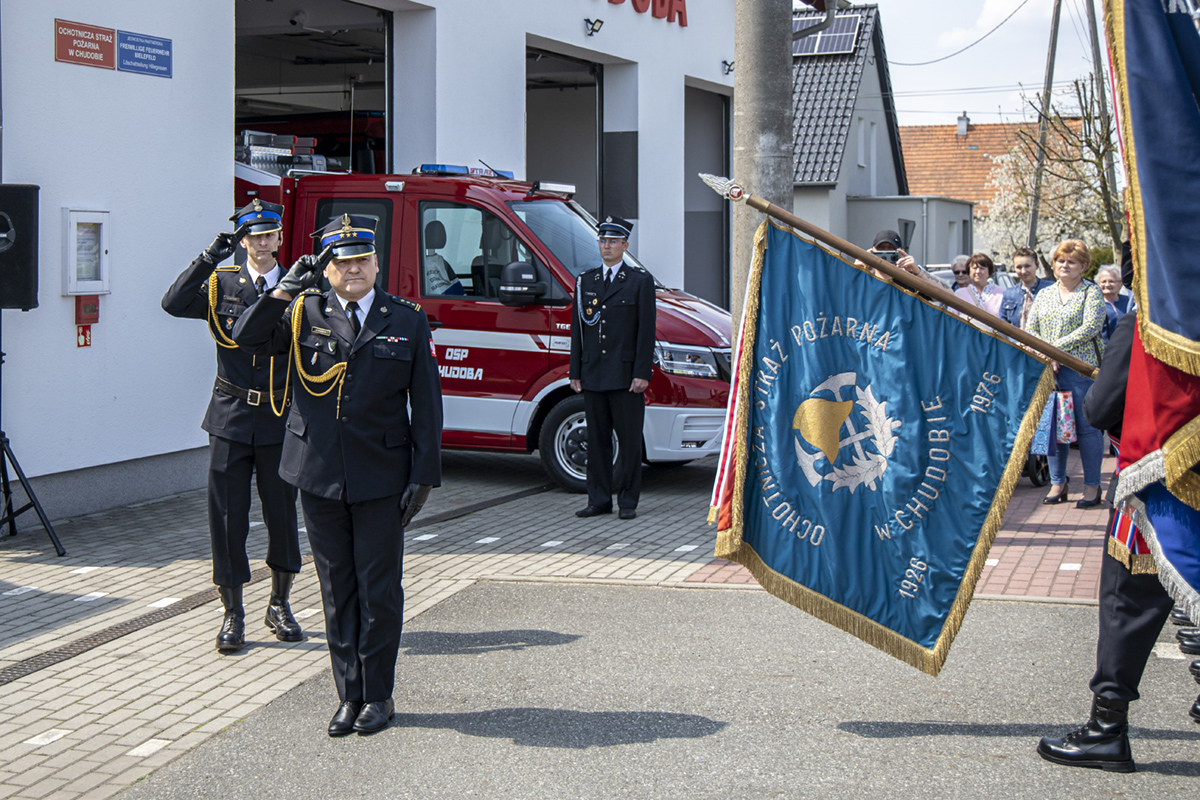 Opolski Komendant Wojewódzki Państwowej Straży Pożarnej w Opolu st. bryg. Krzysztof Kędryk 3 maja 2022 roku wziął udział w uroczystości przekazania fabrycznie nowego samochodu ratowniczo-gaśniczego MAN dla jednostki Ochotniczej Straży Pożarnej w Chudobie.