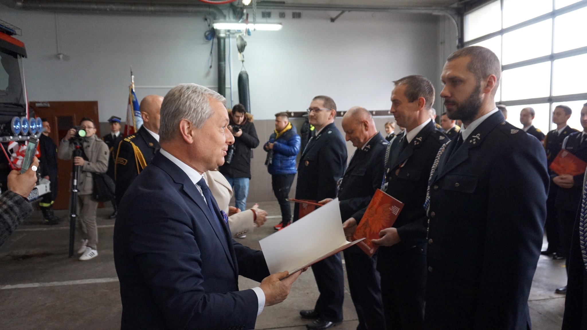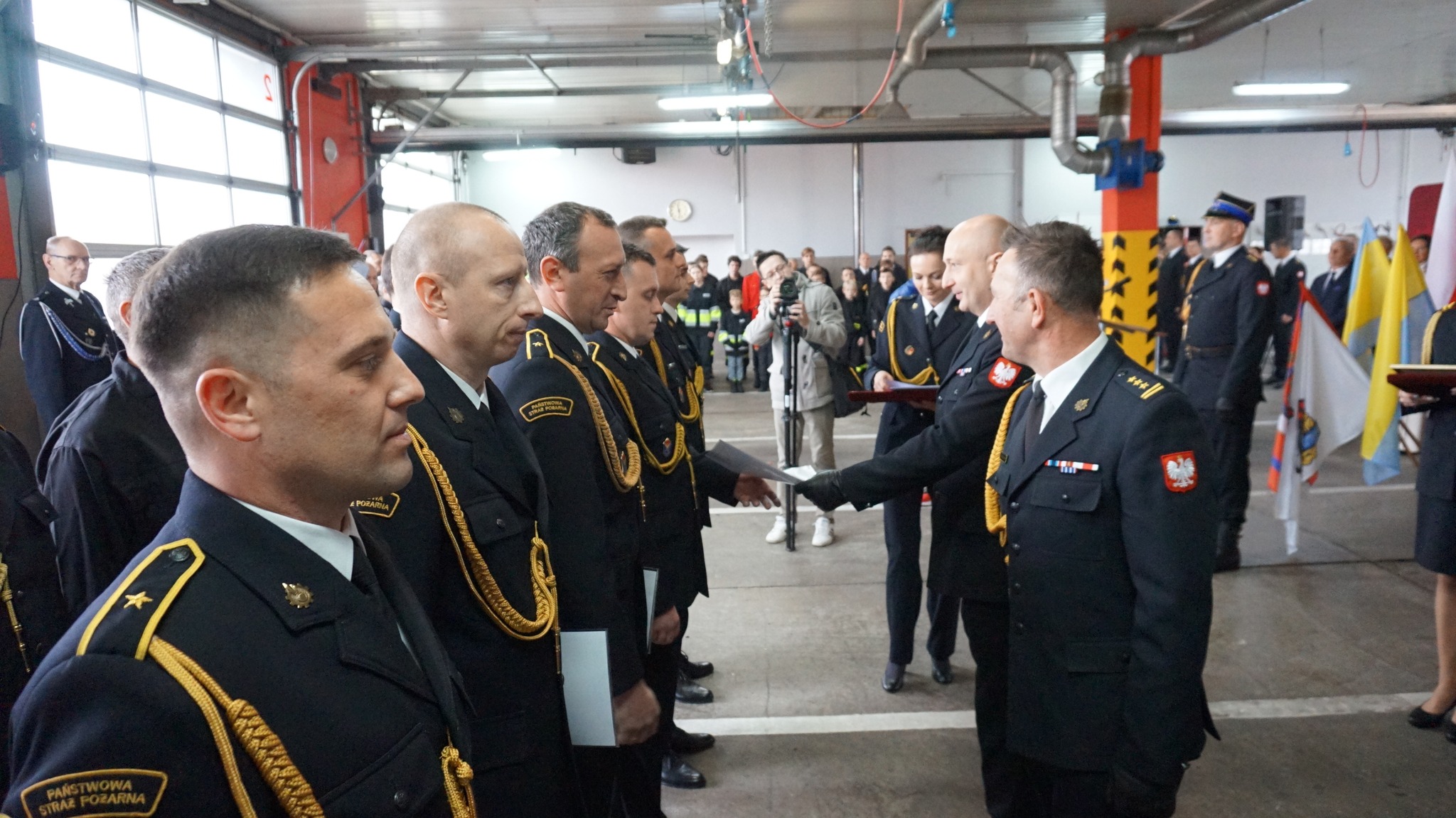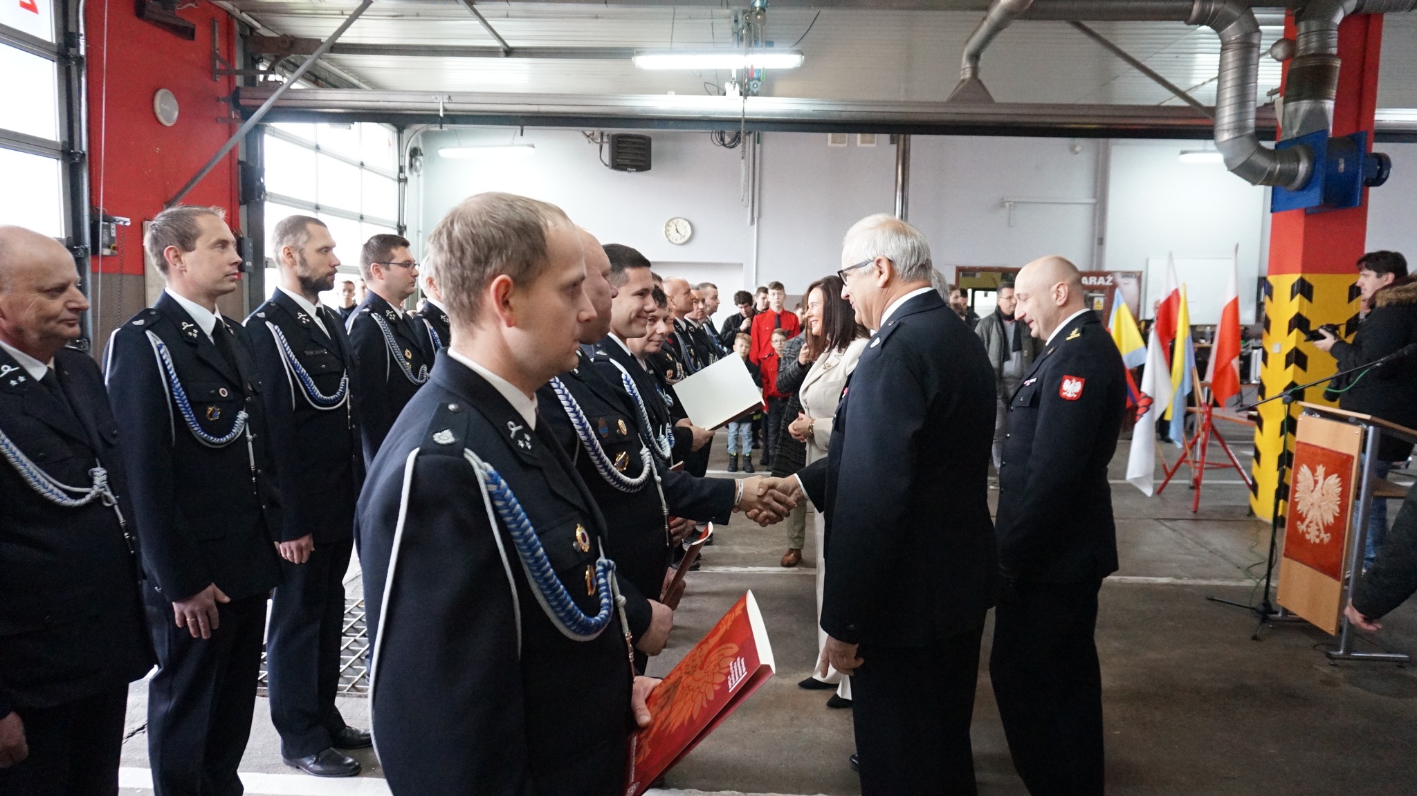 Kolejnymi punktami scenariusza uroczystej zbiórki było przekazanie ciężkiego wozu gaśniczego do Jednostki Ratowniczo-Gaśniczej nr 1 oraz wręczenie awansów w stopniach strażakom Komendy Miejskiej PSP w Opolu i dyplomu Komendanta Głównego Państwowej Straży Pożarnej.
