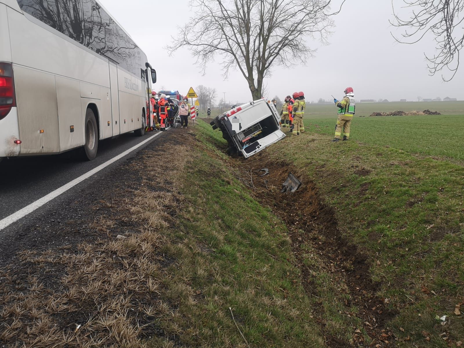 Po przybyciu na miejsce pierwszego zastępu, kierujący działaniem ratowniczym w wyniku rozpoznania stwierdził, że samochód typu bus zjechał z drogi i zatrzymał się na prawym boku w rowie a przed przybyciem jednostek ochrony przeciwpożarowej pojazd opuściły wszystkie podróżujące nim osoby.