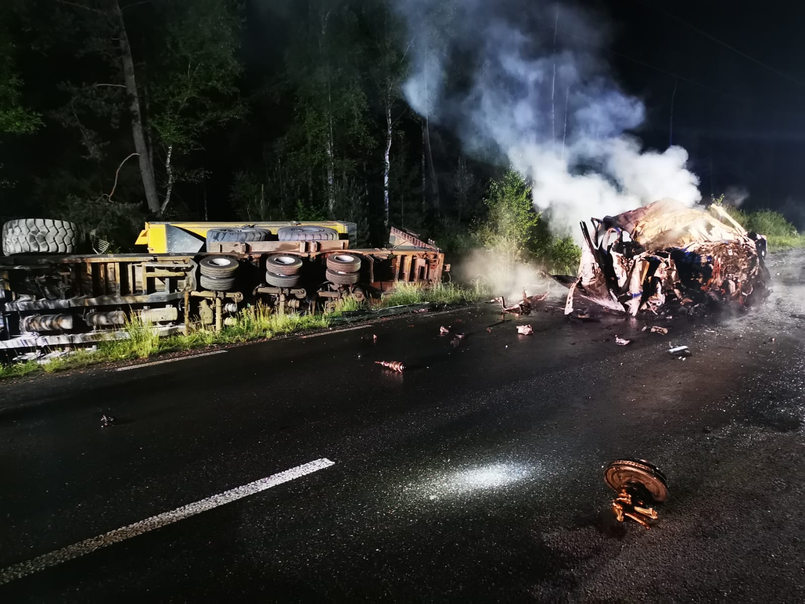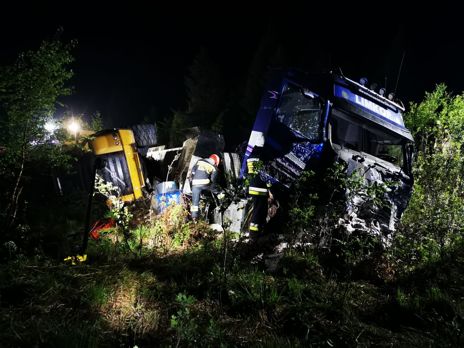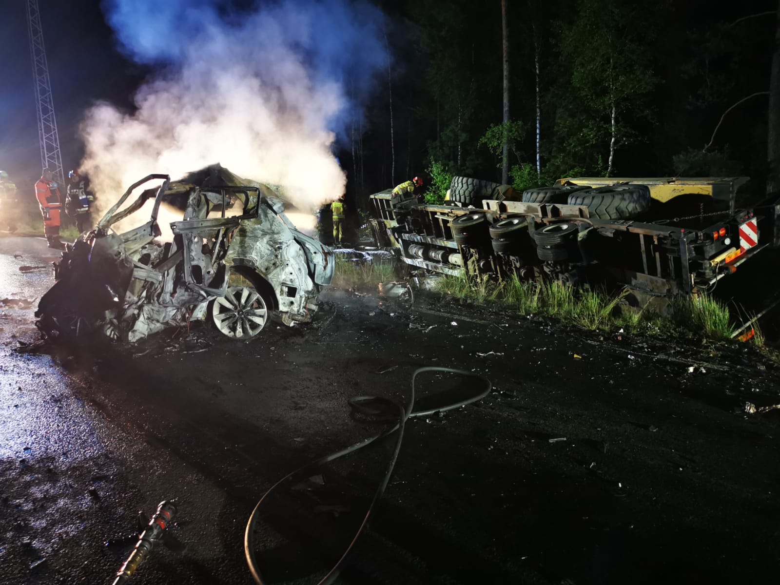 Po przybyciu na miejsce zdarzenia oraz przeprowadzeniu rozpoznania kierujący działaniem ratowniczym ustalił, że po zderzeniu samochodu osobowego z ciężarowym zapalił się samochód osobowy. Samochód osobowy w wyniku zderzenia znalazł się na środku drogi, natomiast samochód ciężarowy przewrócony na bok znajdował się w rowie wraz z przewożonym na naczepie pojazdem budowlanym. Podczas zderzenia zbiornik paliwa samochodu ciężarowego został uszkodzony. Kierowca ciągnika siodłowego o własnych siłach opuścił kabinę pojazdu i znajdował się pod opieką zespołu ratownictwa medycznego.