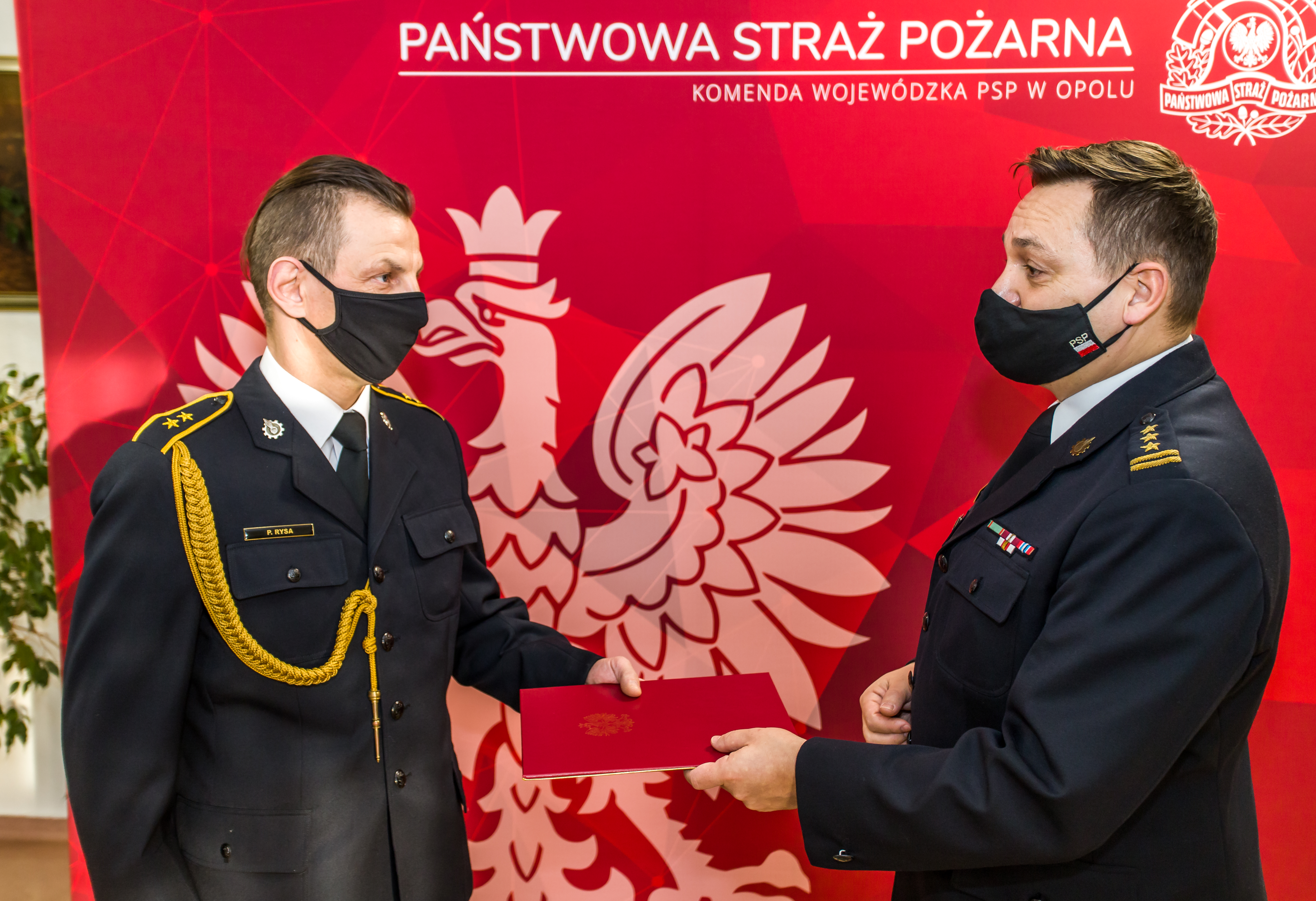 W dniu 29 grudnia 2020 r. o godzinie 8:45 Pan st. bryg. mgr inż. Krzysztof Kędryk – Opolski Komendant Wojewódzki PSP wręczył Panu st. asp. Przemysławowi RYSA z KP PSP Namysłów nagrodę pieniężną Ministra Spraw Wewnętrznych i Administracji za zaangażowanie w działania ratowniczo-gaśnicze.