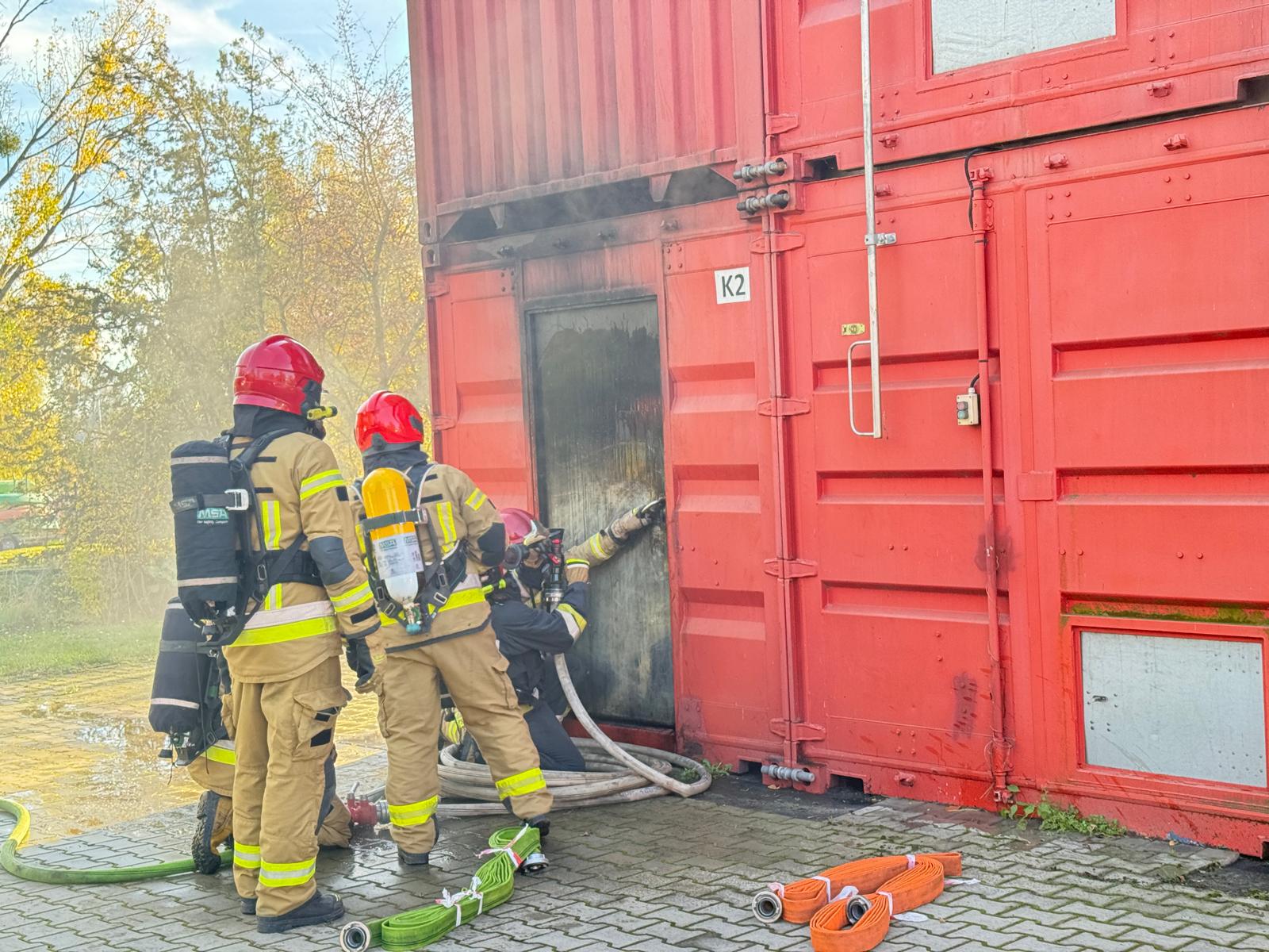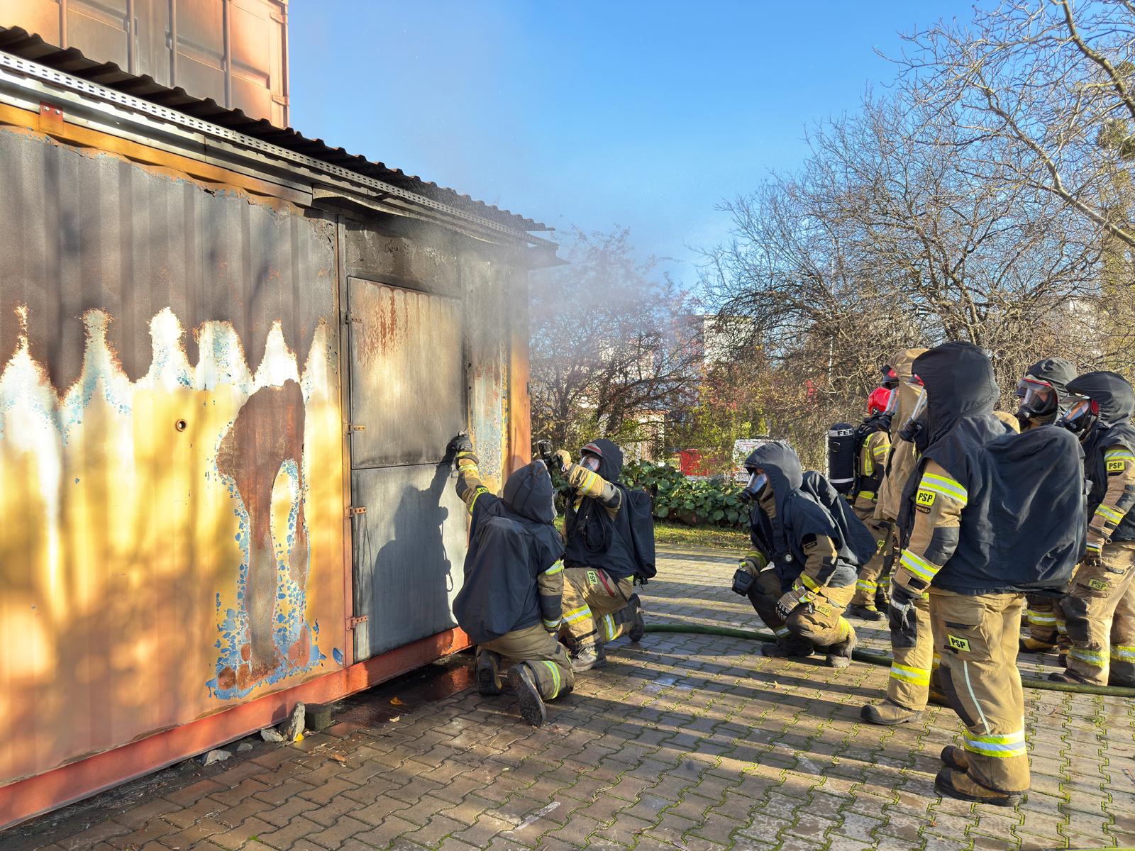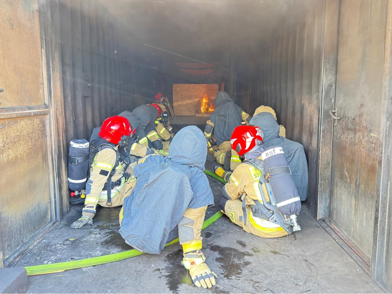 Podczas zajęć praktycznych uczestnicy szkolenia ćwiczyli m.in. techniki operowania prądami gaśniczymi, postępowanie podczas wchodzenia do pomieszczenia objętego pożarem, techniki przeszukiwania pomieszczeń zadymionych oraz prowadzenia wentylacji taktycznej podczas pożarów wewnętrznych.