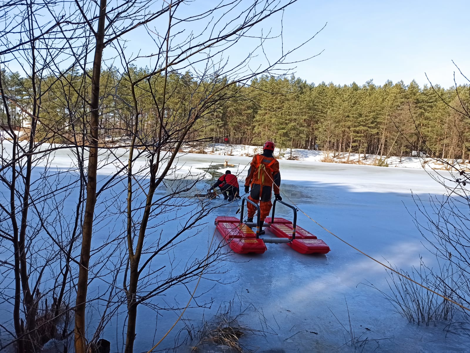 Strażacy w pełnym zabezpieczeniu, podeszli do zwierzęcia i rozpoczęli kruszenie lodu w kierunku brzegu. Jeleń idąc utorowanym szlakiem wyszedł na brzeg akwenu, po czym zbiegł do pobliskiego lasu.