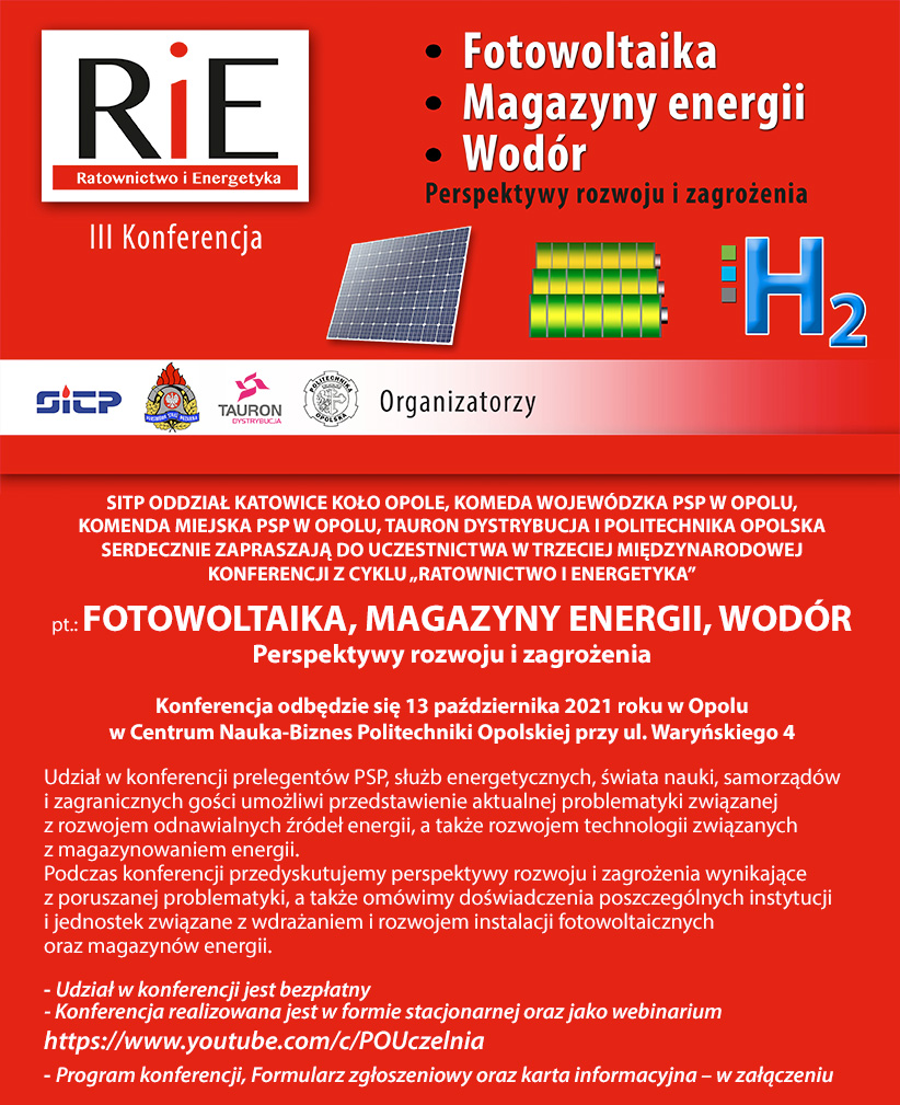 SITP Oddział Katowice koło Opole, Komenda Wojewódzka PSP w Opolu, Komenda Miejska PSP w Opolu, Tauron Dystrybucja oraz Politechnika Opolska są organizatorami III Międzynarodowej Konferencji z cyklu „Ratownictwo i Energetyka”, która odbędzie się 13 października 2021 roku w Opolu.