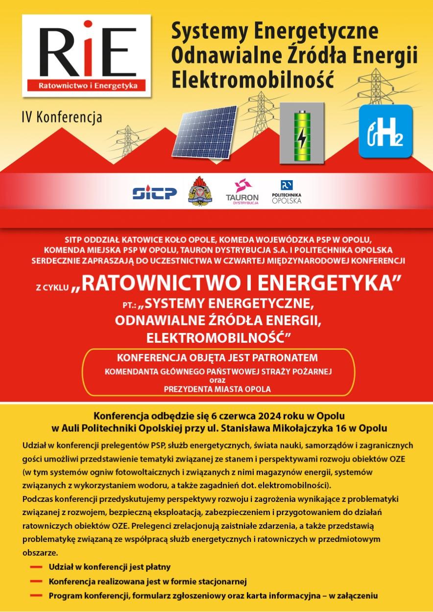 SITP Oddział Katowice Koło Opole, Komenda Wojewódzka Państwowej Straży Pożarnej w Opolu, Komenda Miejska Państwowej Straży Pożarnej w Opolu, Tauron Dystrybucja Spółka Akcyjna i Politechnika Opolska serdecznie zapraszają do uczestnictwa w czwartej międzynarodowej konferencji z cyklu „Ratownictwo i Energetyka” pod tytułem „Systemy Energetyczne. Odnawialne Źródła Energii. Elektromobilność.”