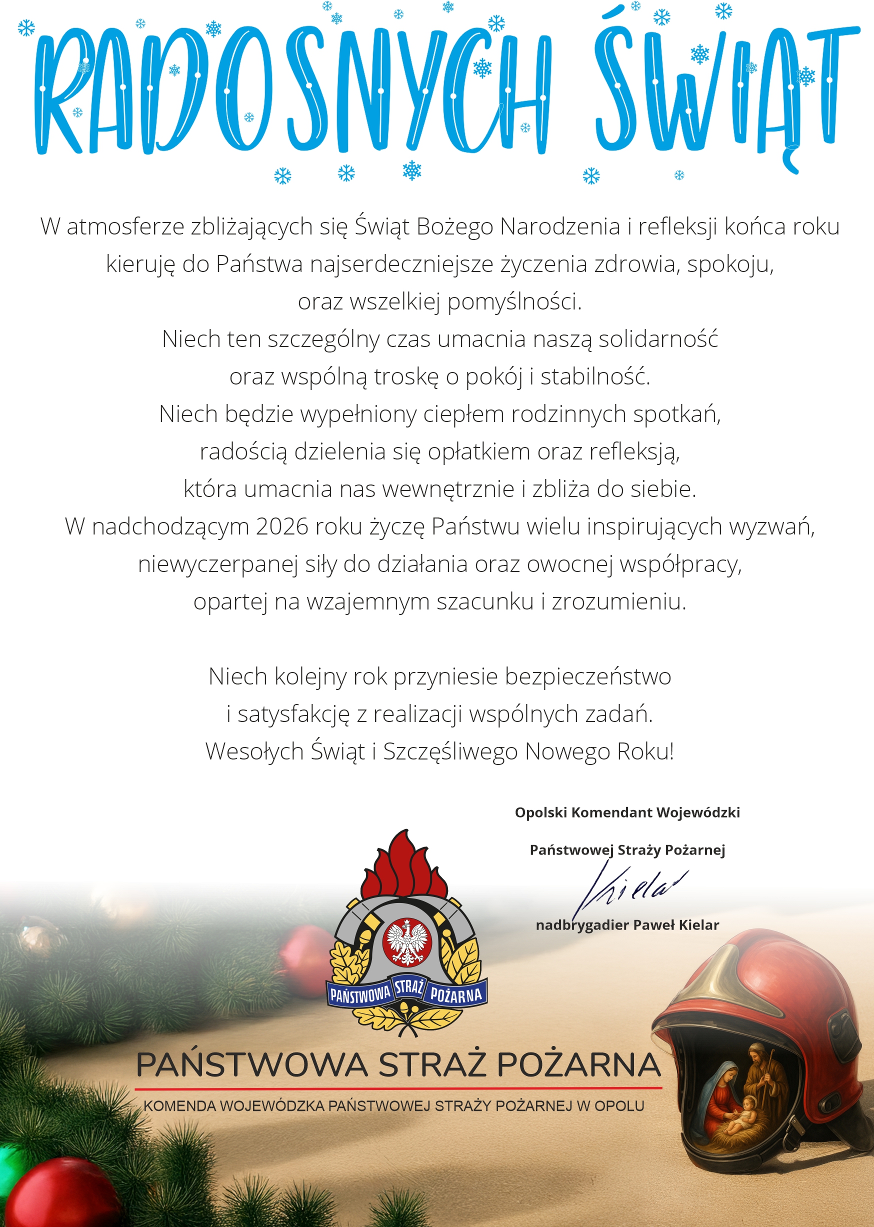 Życzenia Opolskiego Komendanta Wojewódzkiego PSP z okazji Świąt Bożego Narodzenia