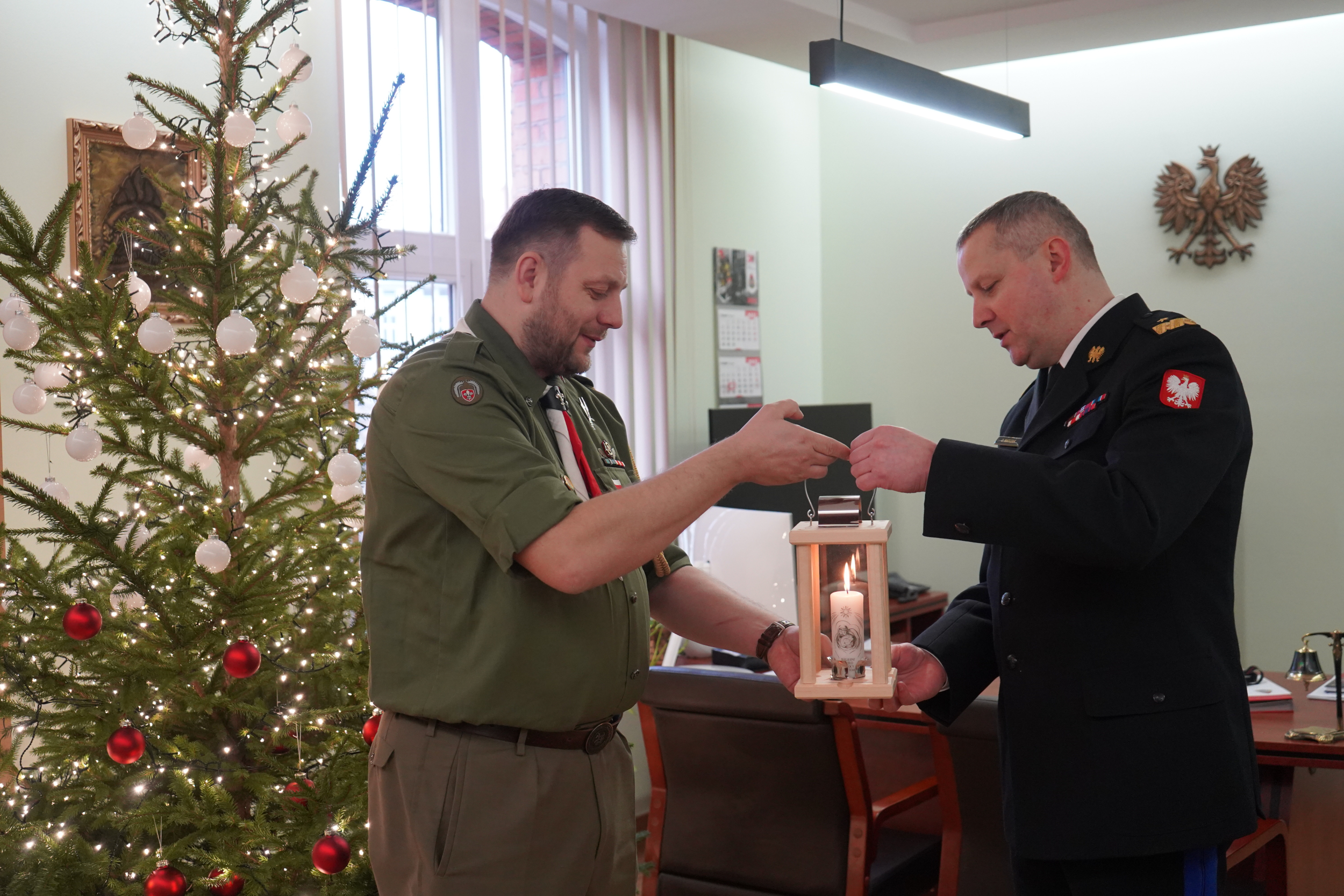 Od wielu lat wielkopolskim strażakom Betlejemskie Światło Pokoju przekazują przedstawiciele Chorągwi Wielkopolskiej Związku Harcerstwa Polskiego im. Powstańców Wielkopolskich 1918/19. W tym roku ze Światłem przybył Komendant Chorągwi Wielkopolskiej ZHP hm. Maciej Siwiak. Miłego gościa przyjął Wielkopolski Komendant Wojewódzki Państwowej Straży Pożarnej nadbryg. Dariusz Matczak wraz z zastępcami st. bryg. Jarosławem Zamelczykiem i bryg. Robertem Natunewiczem. Komendant Chorągwi Wielkopolskiej ZHP przekazał na ręce Wielkopolskiego Komendanta Wojewódzkiego PSP Betlejemskie Światełko Pokoju, a wraz z nim życzenia dla wszystkich funkcjonariuszy i pracowników straży pożarnej w Wielkopolsce.
