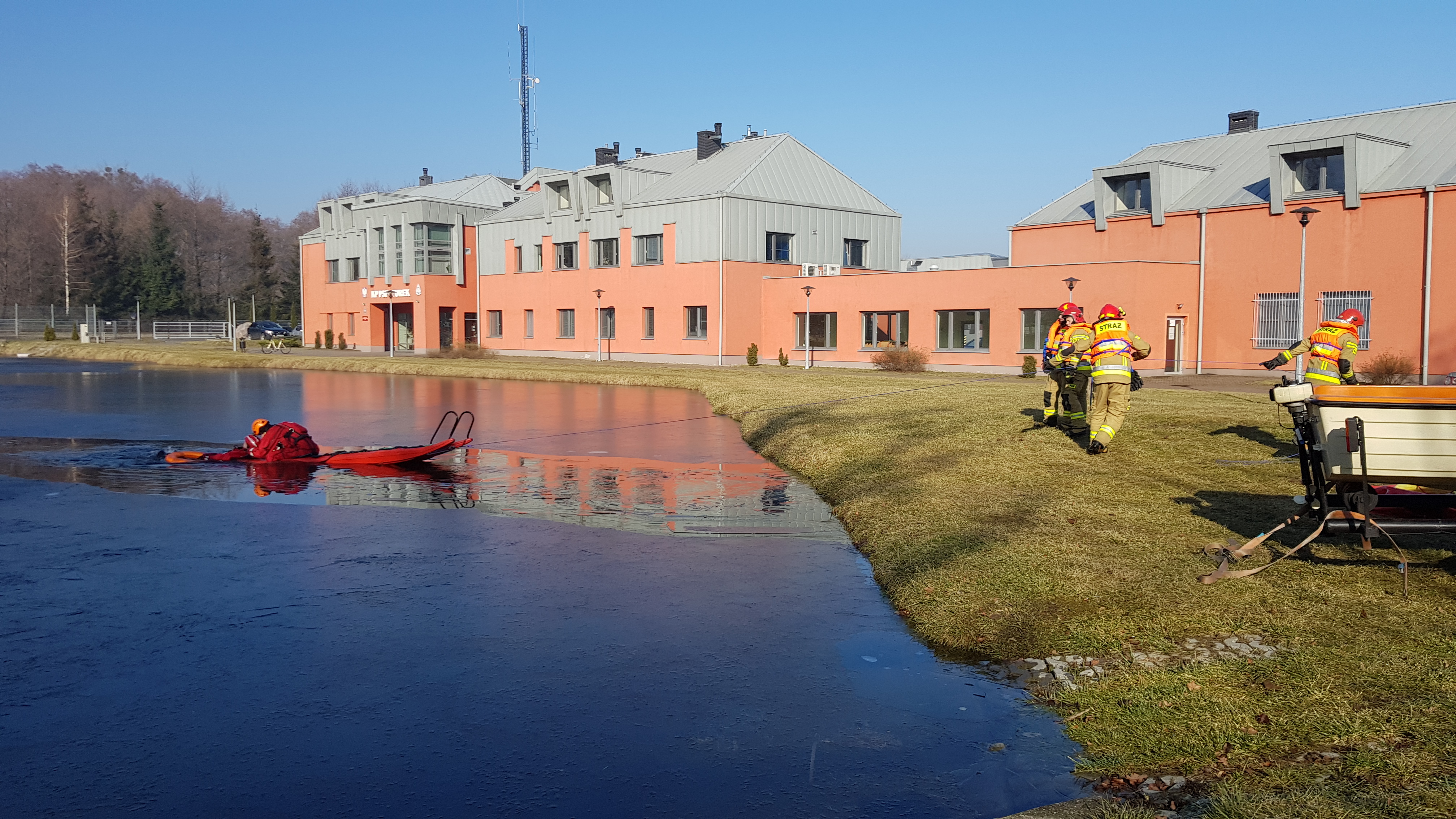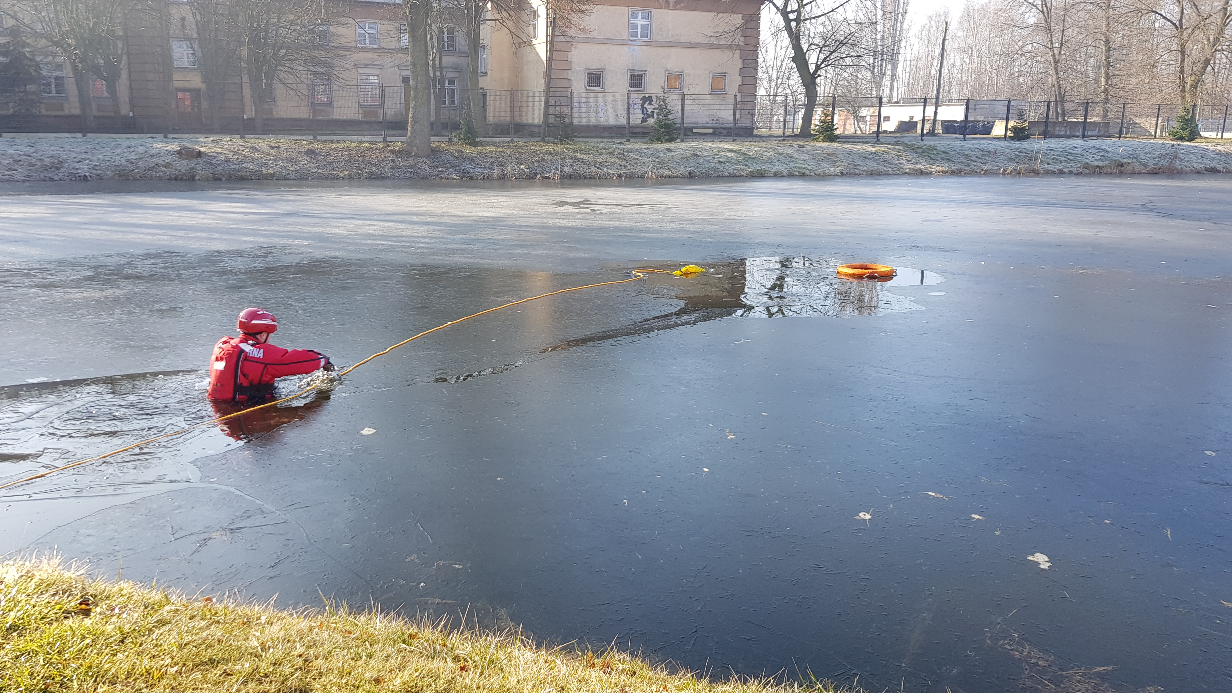 Strażacy wyposażeni w sprzęt do ratownictwa wodno-lodowego na poziomie podstawowym doskonalili techniki podejmowania osób z wody - przerębla, pod którymi załamał się kruchy lód. To właśnie takie warunki, gdzie lód jest kruchy i nie można się po nim poruszać, nawet za pomocą sań wodno - lodowych odzwierciedlają realne sytuacje, w których najczęściej dochodzi do wypadków. Choć zima nieuchronnie zbliża się do końca, to wciąż mogą pojawić jeszcze ujemne temperatury powietrza, a miejscami może zalegać coraz cieńsza pokrywa lodowa. W przypadku, gdy pod kimś załamie się lód, strażacy zalecają natychmiast zaalarmować służby ratownicze. Potem ewentualnie można z brzegu starać się pomóc poszkodowanym, podając coś, czego mogą się uchwycić. – Jeśli jednak tonący jest dalej, nie podejmujmy się samodzielnego ratowania, bo sami możemy się znaleźć w niebezpiecznej sytuacji.