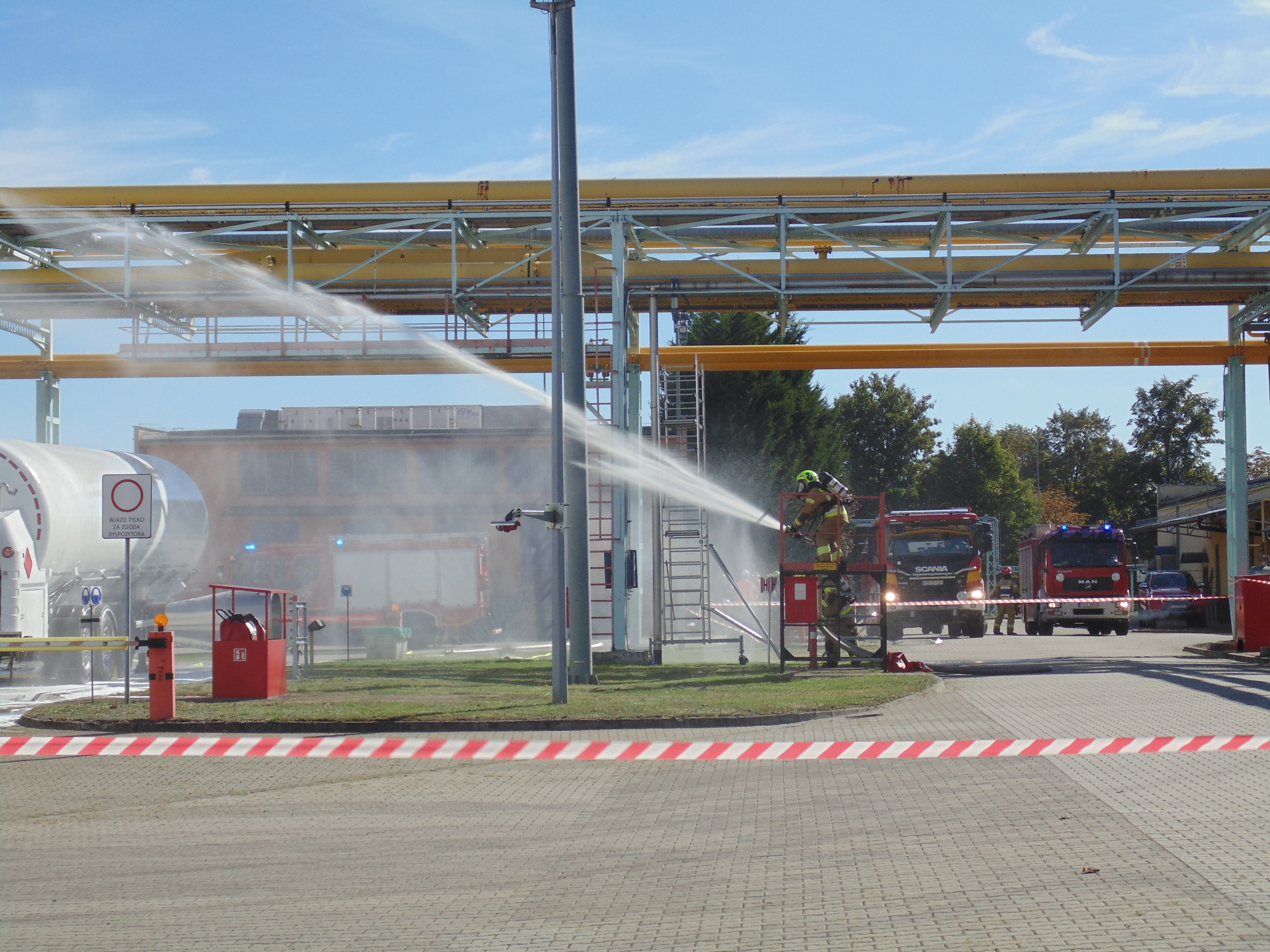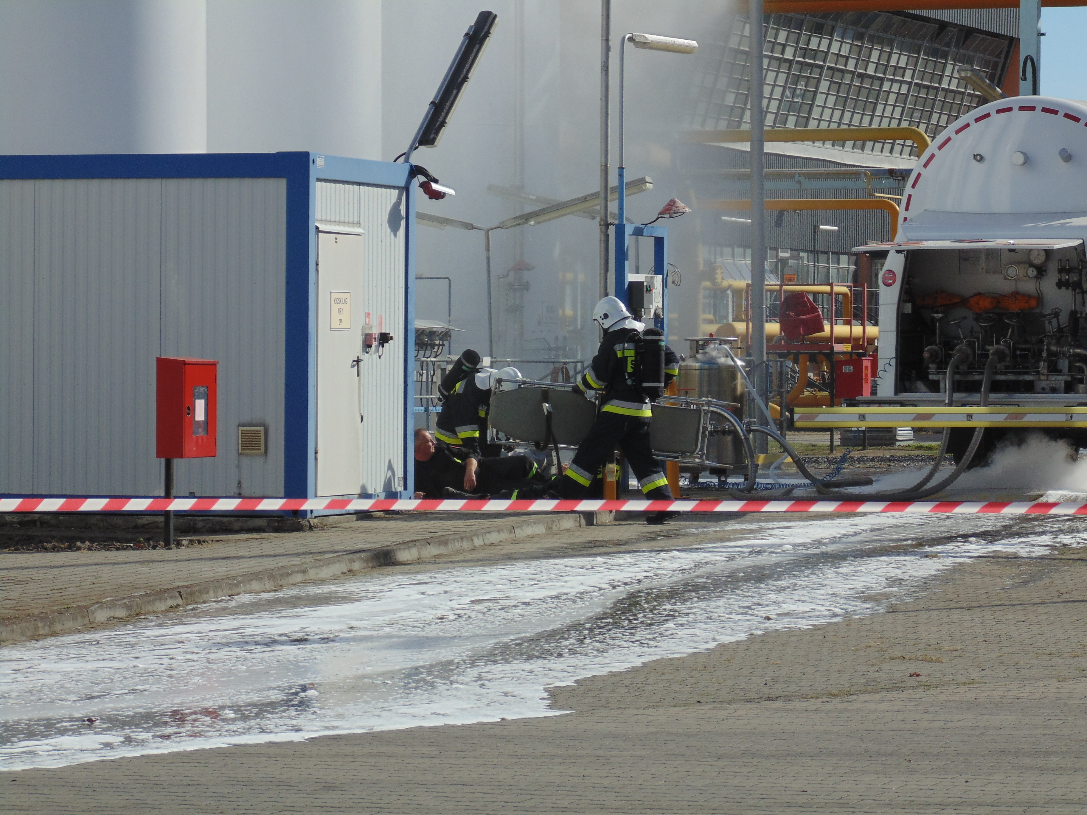 Część praktyczna natomiast, zakładała że podczas ładowania skroplonego gazu ziemnego do autocysterny na jednym ze stanowisk doszło do uszkodzenia węża nalewowego, wskutek czego doszło do pożaru. W wyniku pożaru poszkodowane zostały 3 osoby które zostały poparzone i znajdują się na terenie zakładu. Do działań niezwłocznie skierowano zastępy z Jednostki Ratowniczo-Gaśniczej w Ostrowie Wlkp. jak i druhów z pobliskich jednostek ochotniczych straży pożarnych. Po udzieleniu kwalifikowanej pierwszej pomocy osobom poszkodowanym, przystąpiono do natarcia na palącą się cysternę oraz obrony pozostałej części zakładu. W tym celu, zbudowano wydajny system poboru oraz jej przesyłu w oparciu o dostępny na terenie zakładu zbiornik przeciwpożarowy. Do działań, zaangażowano również samochód dowodzenia i łączności z Komendy Miejskiej PSP w Kaliszu, celem właściwej koordynacji działań.