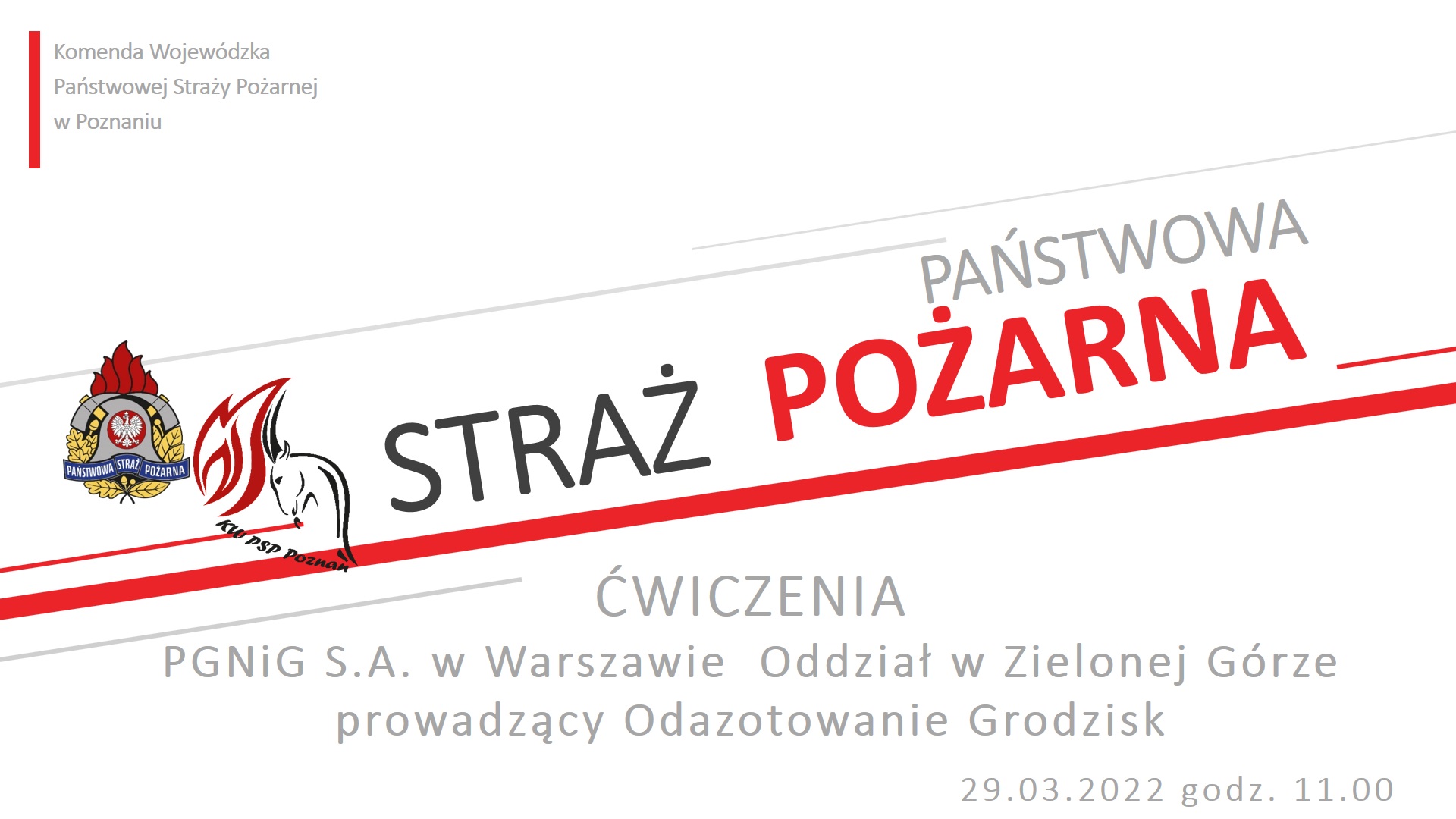 W dniu 29 marca 2022 r. funkcjonariusze Komendy Wojewódzkiej PSP w Poznaniu zorganizowali i przeprowadzili ćwiczenia dla zakładu dużego PGNiG S.A. w Warszawie – Oddział w Zielonej Górze prowadzący Odazotowanie Grodzisk. Z uwagi na sytuację epidemiologiczną COVID-19, przedmiotowe ćwiczenia odbyły się w formie aplikacyjnej z wykorzystaniem systemu wideokonferencyjnego. W przedsięwzięciu uczestniczyli przedstawiciele zakładu dużego ryzyka PGNiG S.A. w Warszawie – Oddział w Zielonej Górze prowadzący Odazotowanie Grodzisk, kadra Wydziału Operacyjnego oraz Kontrolno-Rozpoznawczego Komendy Wojewódzkiej PSP w Poznaniu, kadra i kierownictwo Komendy Powiatowej PSP w Grodzisku Wielkopolskim, przedstawiciele Policji, Zarządzania Kryzysowego szczebla powiatowego oraz gminnego, Państwowego Ratownictwa Medycznego oraz Wojewódzkiego Inspektoratu Ochrony Środowiska-Delegatura Leszno.