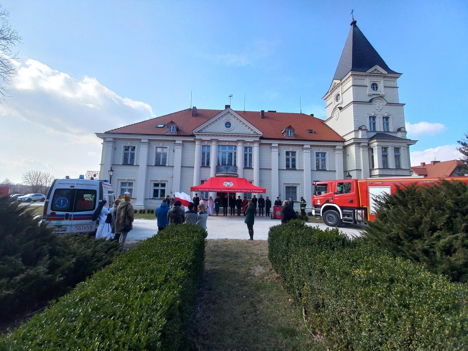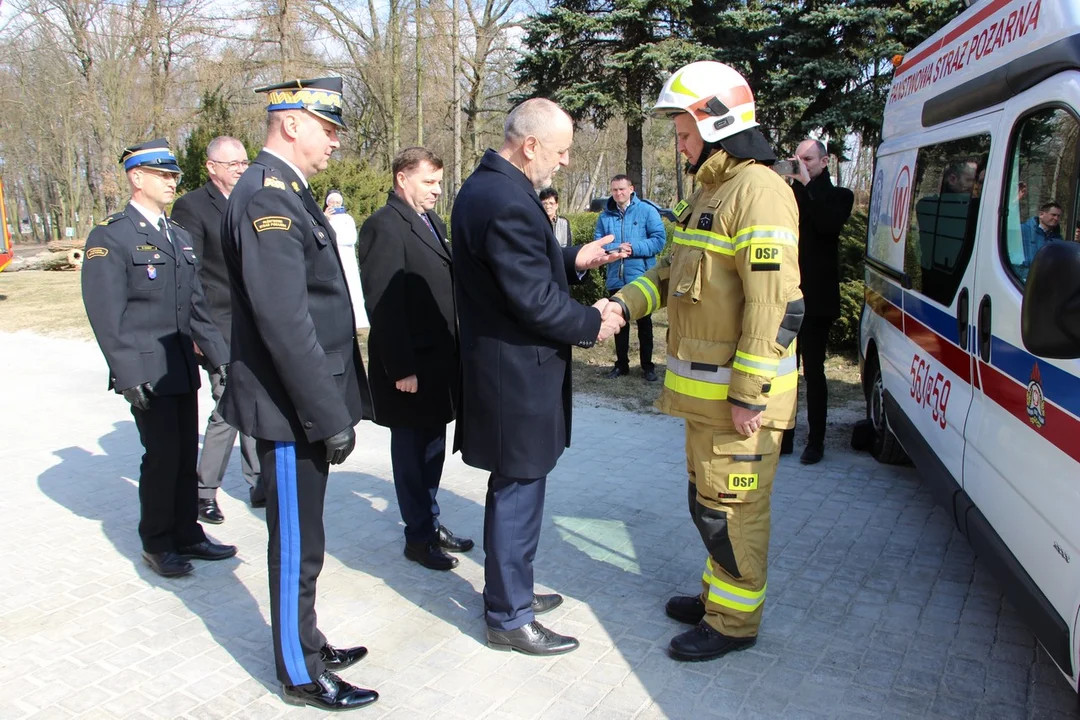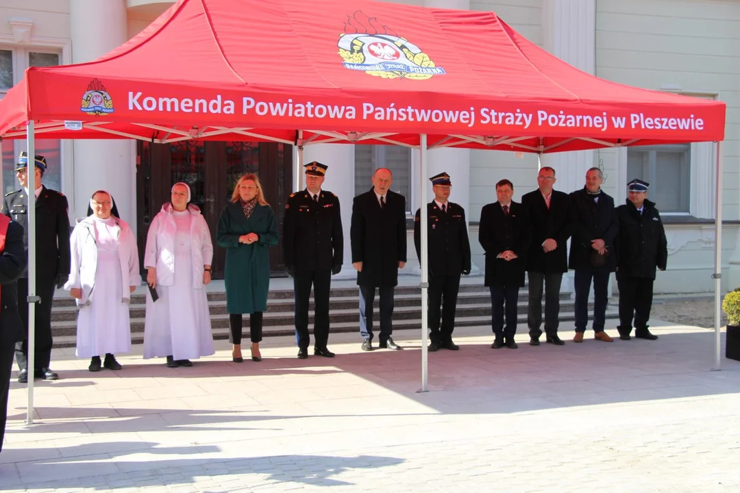Wręczenia kluczyków do ambulansu dokonali: parlamentarzyści Pan Jan Mosiński oraz Pan Tomasz Ławniczak, Starosta Pleszewski Pan Maciej Wasielewski, Wielkopolski Komendant Wojewódzki PSP nadbryg. Dariusz Matczak oraz Komendant Powiatowy PSP w Pleszewie bryg. Roland Egiert.