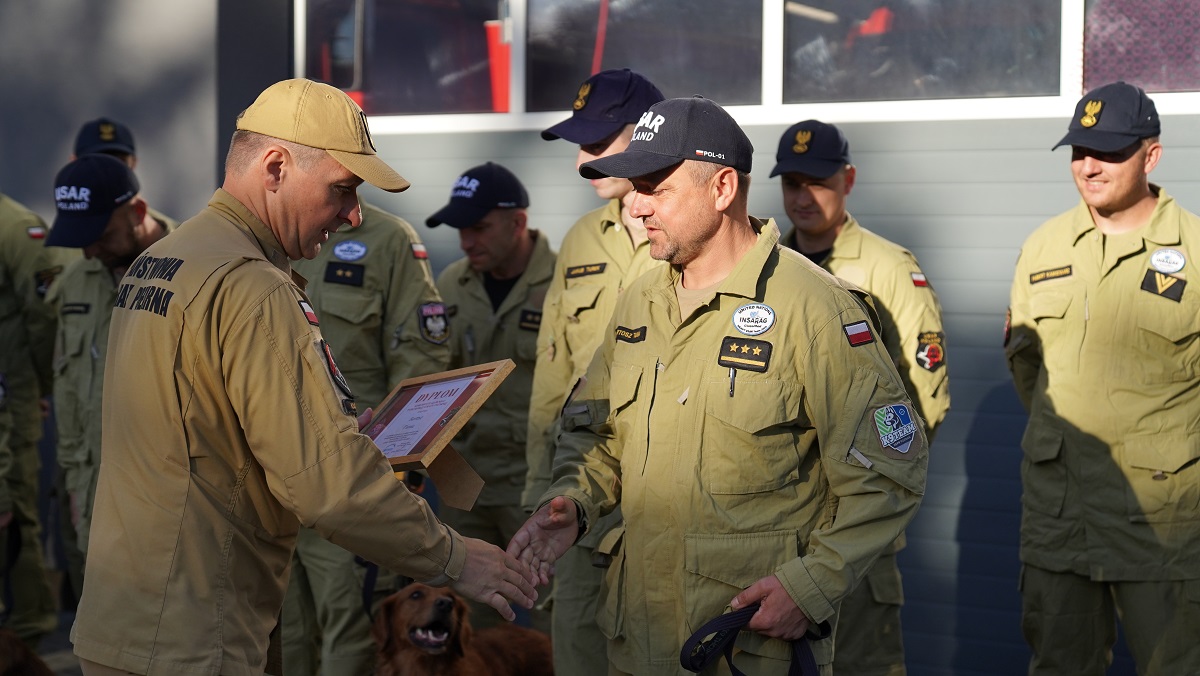 Wizyta gości była spowodowana chęcią przekazania gratulacji i podziękowań ratownikom Specjalistycznej Grupy Poszukiwawcz-Ratowniczej w Poznaniu, za udział w egzaminie recertyfikującym Ciężką Grupę Poszukiwawczo – Ratowniczą HUSAR Poland. Przypomnijmy, że w kwietniu br. grupa HUSAR Poland została pozytywnie zweryfikowana przez komisję ekspertów INSARAG (International Search and Rescue Advisory Group – międzynarodowa grupa doradcza do spraw działań poszukiwawczo – ratowniczych funkcjonująca pod egidą ONZ), co umożliwia w kolejnych pięciu latach udział w działaniach ratowniczych poza granicami kraju, np. po wystąpieniu trzęsienia ziemi.