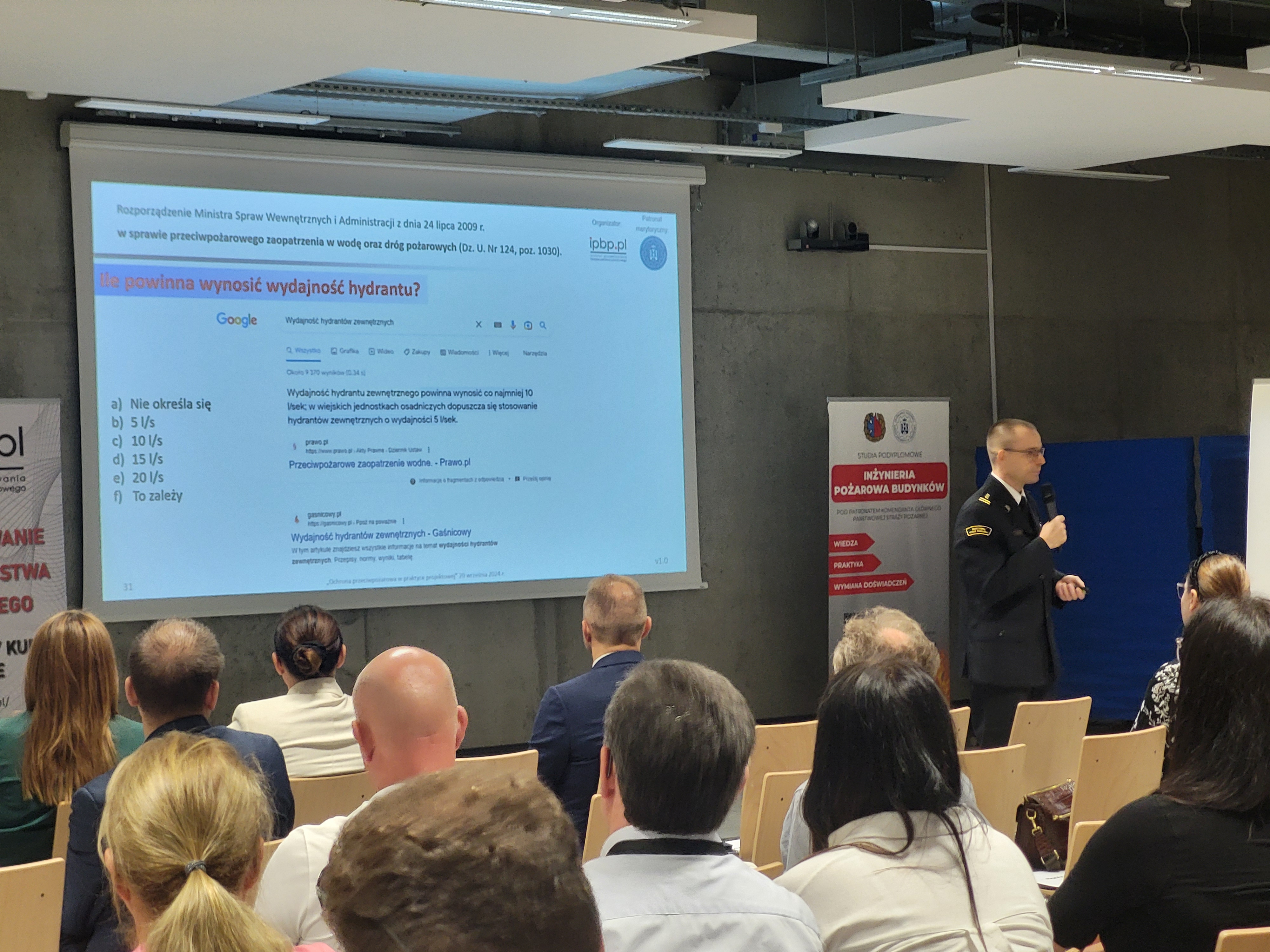 Ponadto naczelnik WPZ KW PSP w Poznaniu st. bryg. Daniel Kuchowicz wygłosił w czasie konferencji prelekcję pt. „Wymagania w zakresie zapewnienia wody do zewnętrznego gaszenia pożaru 5, 10 czy 20 dm3/s? Próba odpowiedzi na trudne pytania”.