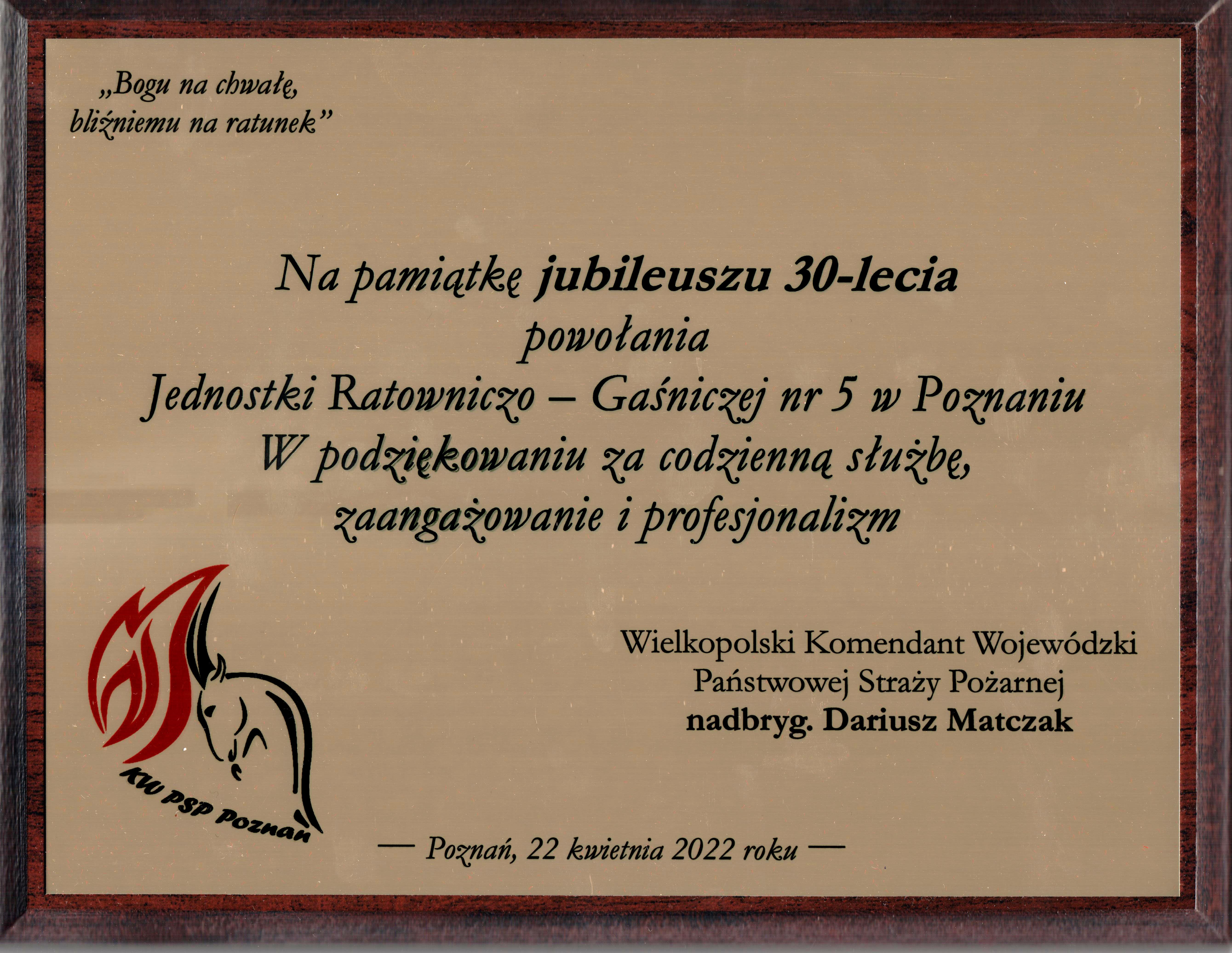 22 kwietnia 2022 roku, na terenie JRG Nr 5 w Poznaniu miała miejsce podniosła uroczystość. Tego dnia bowiem odbyły się uroczyste obchody 30-leci Jednostki z udziałem znamienitych gości.