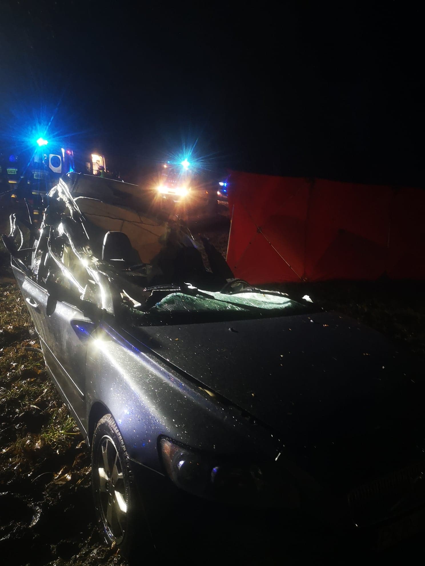 w zdeformowanym pojeździe. Z uwagi na stwierdzony brak czynności życiowych u młodego mężczyzny strażacy rozpoczęli walkę o ludzkie życie, wykonując natychmiastowy dostęp do kierowcy za pomocą narzędzi hydraulicznych, celem jego pilnej ewakuacji. Podjęte czynności umożliwiły rozpoczęcie skutecznej resuscytacji krążeniowo - oddechowej z użyciem automatycznego defibrylatora oraz sprzętu do tlenoterapii czynnej. Po otrzymaniu informacji o dyspozycji na miejsce Lotniczego Pogotowia Ratunkowego decyzją Kierującego Działaniami Ratowniczymi wyznaczono lądowisko na pobliskim polu uprawnym, prowadząc nasłuch na kanale współdziałania ze statkami powietrznymi. W momencie przybycia na miejsce karetki pogotowia uczestnika zdarzenia przekazano pod opiekę ratownika medycznego, kontynuując czynności ratunkowe. Po wylądowaniu śmigłowca koordynacje działań medycznych na miejscu wypadku przejął lekarz lotniczego pogotowia ratunkowego, który po upływie 34 minut resuscytacji stwierdził zgon młodego mężczyzny. Dalsze działania jednostek ochrony przeciwpożarowej na miejscu zdarzenia polegały na oświetleniu terenu akcji, oraz usunięciu elementów karoserii samochodowej z jezdni oraz pobliskiego pola. Po zakończonych czynnościach realizowanych przez prokuratora oraz funkcjonariuszy Policji działania zakończono i zastępy powróciły do miejsca stacjonowania. Interwencja straży pożarnej trwała łącznie 03 godziny i 36 minut.