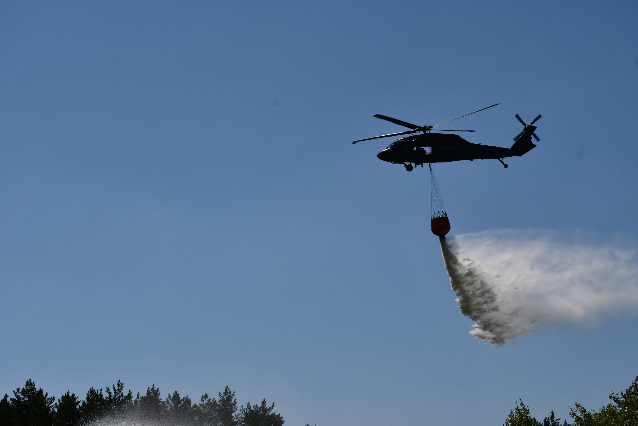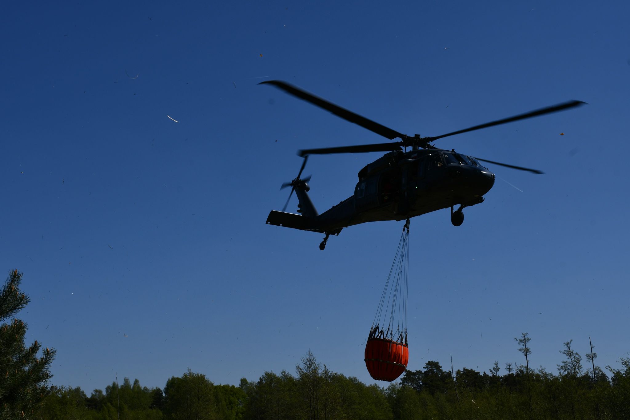 Równocześnie, na terenie ćwiczeń rozpoczął się epizod związany z ratownictwem wysokościowym. Przybyła na miejsce Specjalistyczna Grupa Ratownictwa Wysokościowego Poznań 5 po dokonanym rozpoznaniu miejsca działań wyznaczyła lądowisko dla policyjnego śmigłowca Black Hawk. Obecność statku powietrznego, pozwoliła na przećwiczenie procedury jego dysponowania a następnie koordynacji służb w przypadku konieczności wdrożenia działań gaśniczych z powietrza. Było to możliwe, dzięki udziałowi członków SGRW Warszawa 7, dysponujących przenośnym zbiornikiem na wodę typu bambi bucket. Współdziałanie służb Państwowej Straży Pożarnej, Policji oraz Lasów Państwowych, zaowocowało efektywnymi zrzutami wody w miejsce wskazane przez Kierującego Działaniem Ratowniczym, co przełożyło się na zmniejszenie intensywności rozprzestrzeniającego się pożaru. W dalszej kolejności, przystąpiono do doskonalenia umiejętności członków SGRW Poznań 5 w zakresie wykonywania czynności ratowniczych i innych zadań wymagających zastosowanie technik linowych i sprzętu specjalistycznego z pokładu śmigłowca.