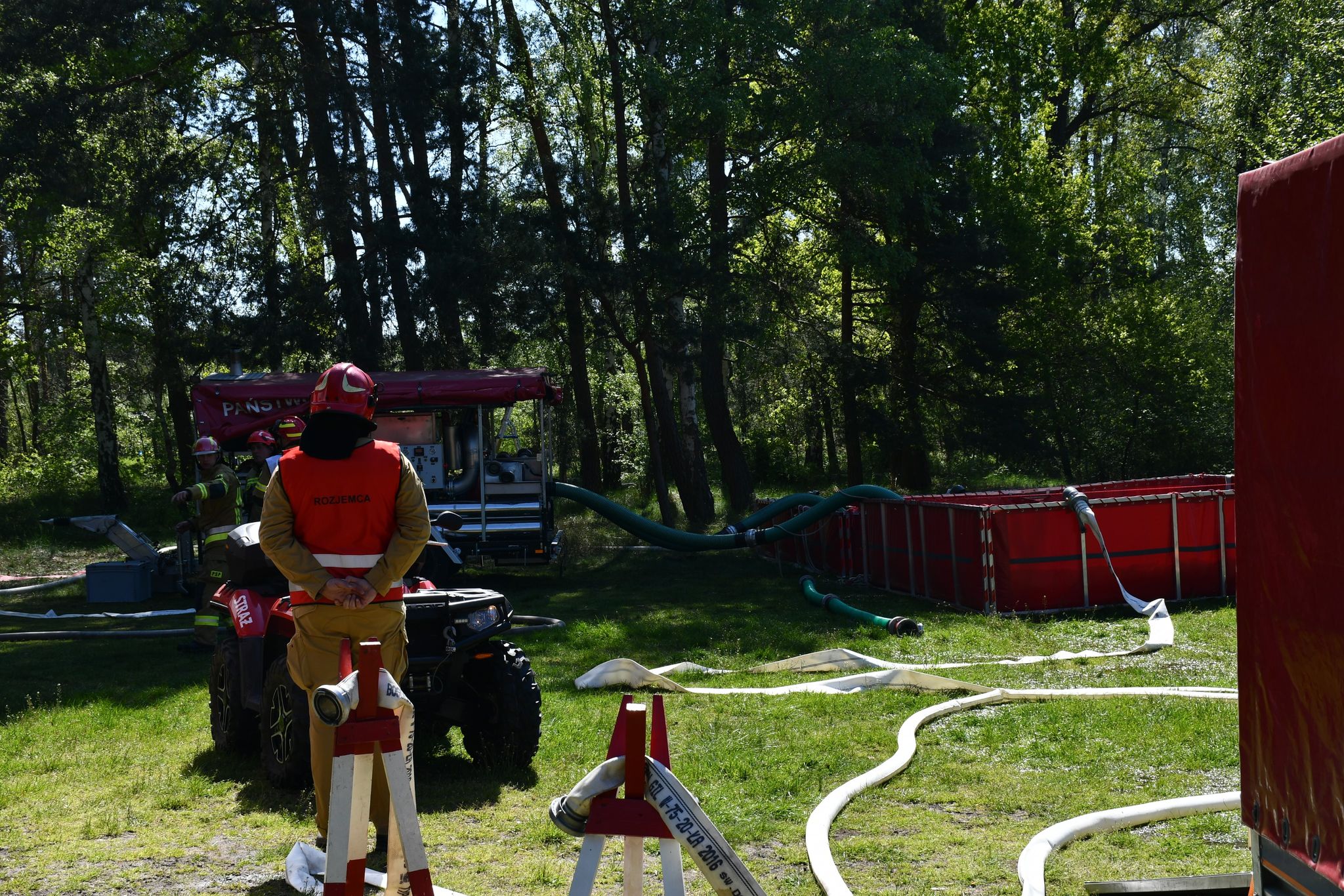 Odprawą przy udziale Zastępcy Wielkopolskiego Komendanta Wojewódzkiego – st. bryg. Tomasza Grelaka rozpoczęto drugi dzień ćwiczeń. Spotkanie, okazało się doskonałą okazją do podziękowania Panu Komendantowi za dotychczasowy, wieloletni wkład w działalność Modułu. Z tej okazji, dowództwo GFFFV Poznań przekazało na ręce st. bryg. Tomasza Grelaka okolicznościowy ryngraf. Następnie, przystąpiono do realizacji epizodu praktycznego, który zakładał konieczność przygotowania linii obrony w odpowiednio wybranym miejscu, a także zorganizowanie wydajnego systemu zaopatrzenia wodnego w oparciu o punkt czerpania wody zlokalizowany na Jeziorze Kopanickim. Powyższe, zrealizowano metodą przetłaczania na dystansie około 2,5 kilometra przy wykorzystaniu 3 linii wężowych 110. Układ ten, pozwolił na podanie około 6000 litrów wody na minutę w miejscu natarcia na pożar.