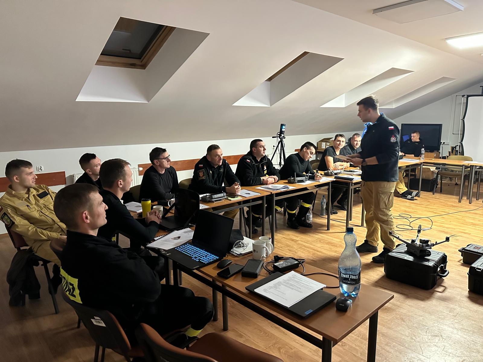 Uczestnicy szkolenia spotkali się również ze st. bryg. Tomaszem Grelakiem, zastępcą Wielkopolskiego Komendanta Wojewódzkiego PSP, który przedstawił plan szkoleń dotyczących dronów dla funkcjonariuszy PSP z województwa wielkopolskiego.