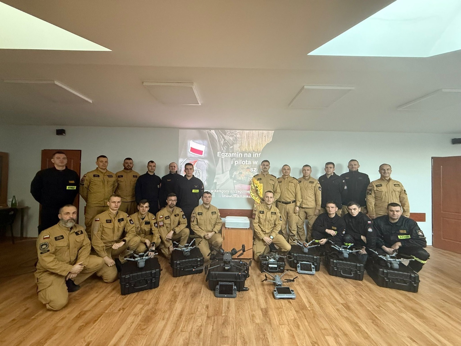 W dniach 24–28 listopada 2025 r. w Koninie instruktorzy bezzałogowych statków powietrznych Państwowej Straży Pożarnej z terenu województwa wielkopolskiego przeprowadzili szkolenie dronowe z zakresu kategorii szczególnej – unijnych scenariuszy standardowych STS-01 i STS-02 oraz operacyjnego wykorzystania BSP podczas działań ratowniczych dla 9 funkcjonariuszy z Komend Miejskich i Powiatowych PSP województwa wielkopolskiego oraz 1 funkcjonariusza z KW PSP Gorzów Wielkopolski.