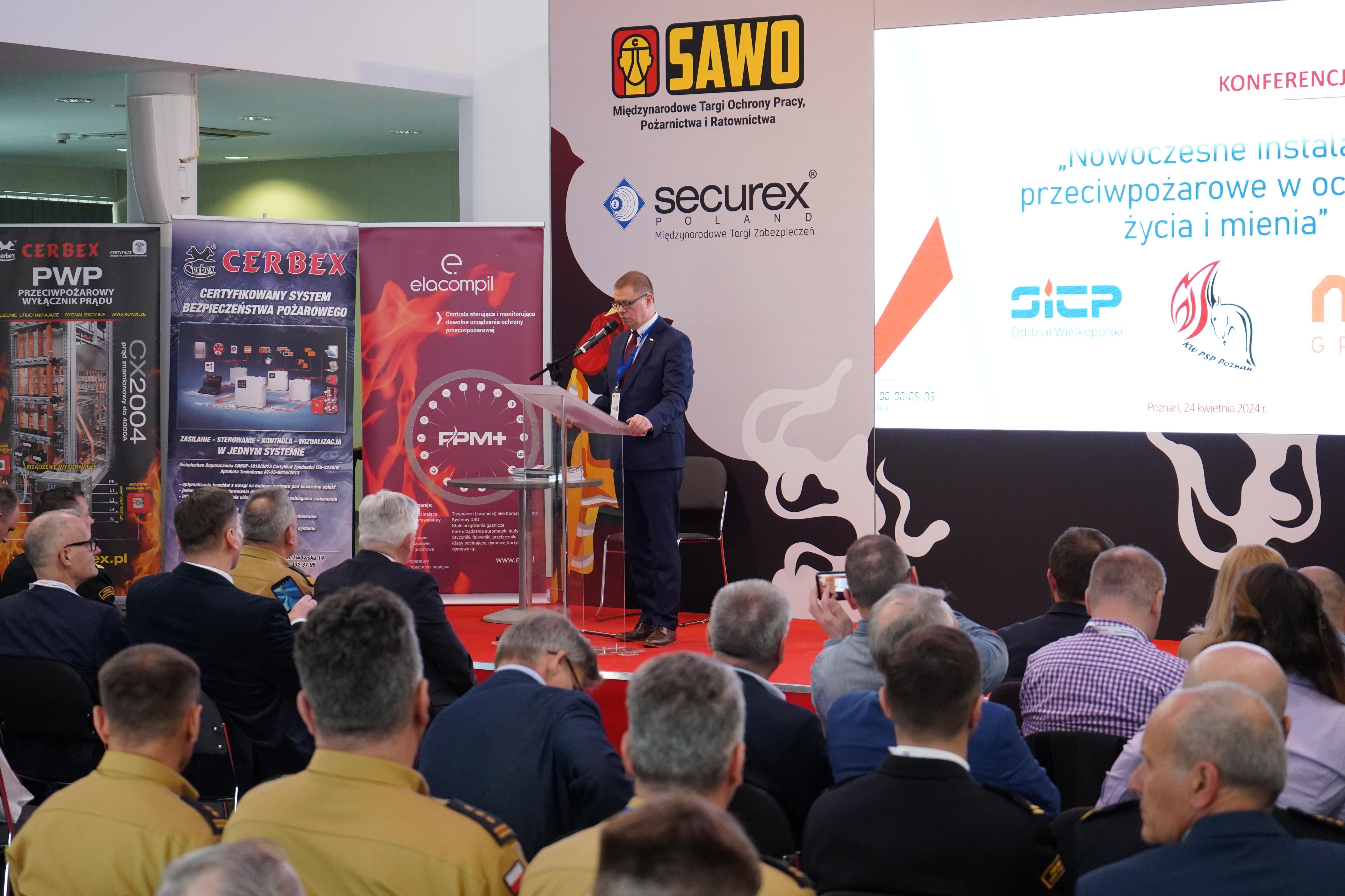 24 kwietnia 2024 r. w godz. 10.30 - 15.00 na terenie MTP w Poznaniu odbyła się konferencja techniczna pn. „Nowoczesne instalacje przeciwpożarowe w ochronie życia i mienia”. Konferencja towarzyszyła Międzynarodowym Targom Ochrony Pracy, Pożarnictwa i Ratownictwa SAWO oraz Międzynarodowym Targom Zabezpieczeń SECUREX. Konferencja została zorganizowana przy współudziale Oddziału Wielkopolskiego Stowarzyszenia Inżynierów i Techników Pożarnictwa, Komendy Wojewódzkiej Państwowej Straży Pożarnej w Poznaniu, grupie MTP. W konferencji wzięło udział ponad 200 uczestników, w tym strażaków oraz ekspertów i praktyków z rożnych dziedzin związanych z tematyką bezpieczeństwa pożarowego. W imieniu organizatorów gości przywitał st. bryg. Lech Janiak – Prezes Zarządu Oddziału Stowarzyszenia Inżynierów i Techników Pożarnictwa Oddział Wielkopolski. Konferencję swoją obecnością zaszczycili m. in.: