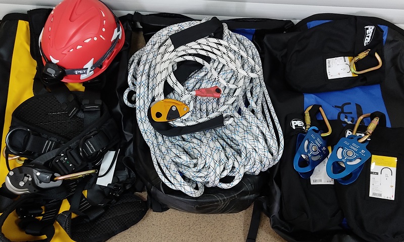 - sprzęt do ratownictwa wysokościowego m. in.: lonże regulowane, liny półstatyczne, osłony lin, rolki krawędziowe,