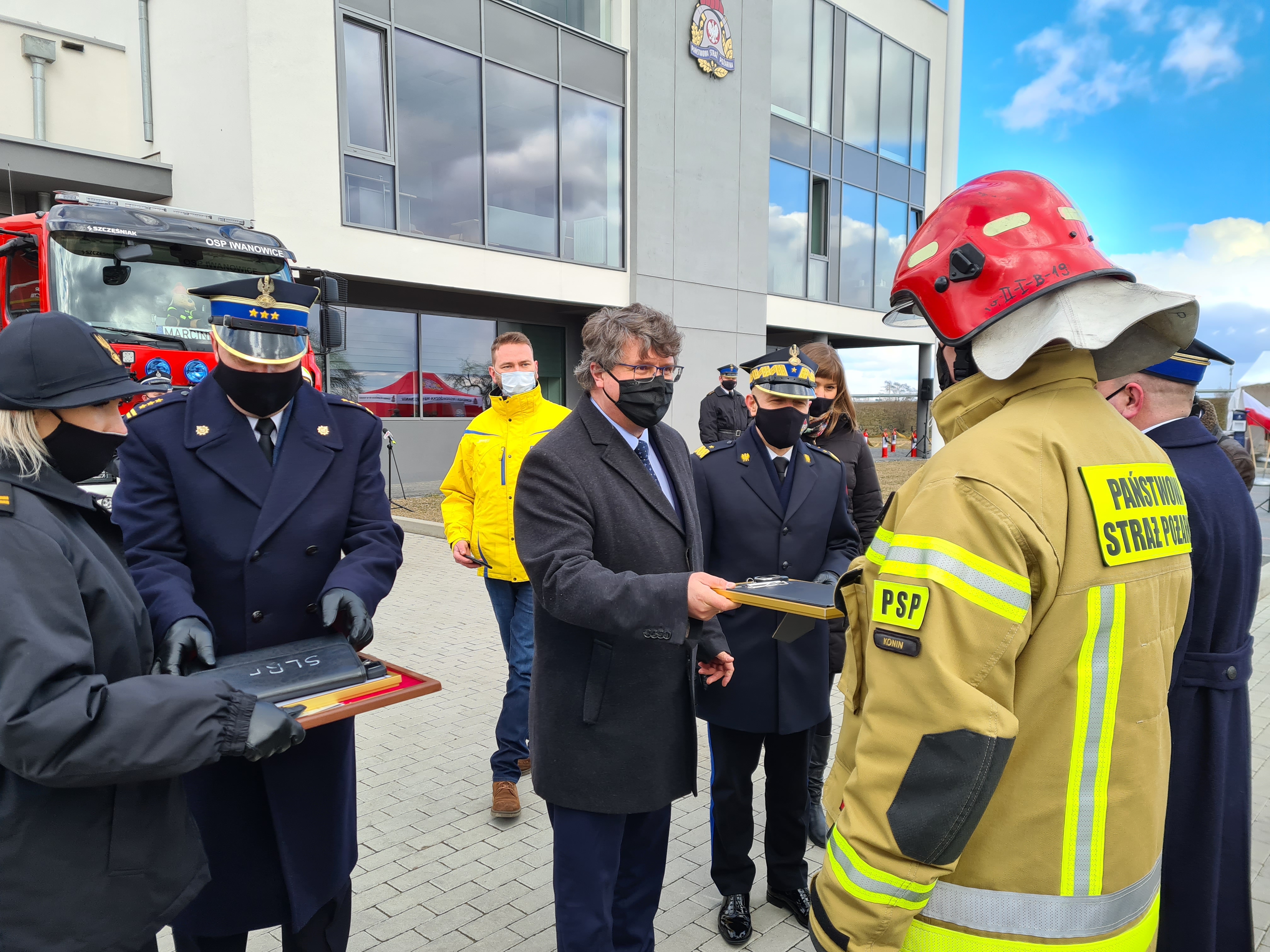 Następnie wielkopolski komendant wojewódzki PSP w Poznaniu st. bryg. Dariusz Matczak przekazał podziękowania i okolicznościowe statuetki za otrzymane środki finansowe na budowę nowej siedziby jednostki ratowniczo-gaśniczej i Komendy Powiatowej Państwowej Straży Pożarnej we Wrześni oraz za zakup specjalnych i ratowniczo-gaśniczych jednostek ochotniczych straży pożarnych i Państwowej Straży Pożarnej z terenu województwa wielkopolskiego: